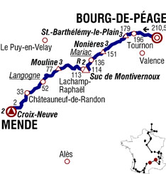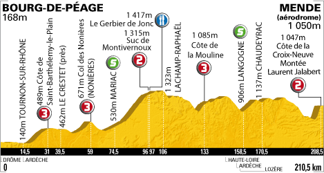 ![]() vendredi 16 juillet 2010 ![]() (Drôme) : Bourg-de-Péage D532 (km 0) - Granges-les-Beaumont (km 2) - Curson (km 6.5) - Chanos-Curson (km 8) - Tain-l'Hermitage (km 12.5) - (Ardèche) : Tournon-sur-Rhône D95 (km 14.5) - Côte de Saint-Barthélémy-le-Plain D 534 (km 31-GPM3) - Le Bruas (km 33) - Le Crestet (près de) (km 39.5) - Lamastre (km 47) - Lapras D578 (km 52.5) - Saint-Prix (près de) (km 56.5) - Col des Nonières (km 59-GPM3) - La Chèze (km 64) - Le Cheylard (km 67.5) - Mandé (km 72.5) - Mariac (km 74.5-sprint) - Pont de Fromentières (km 75) - Dornas (km 79) - Noirol (km 80.5) - Sardige (km 84) - Mezilhac (km 91.5) - Suc de Montivernoux D122 (km 96-GPM2) - Lachamp-Raphaël (km 97) - Le Gerbier de Jonc D378 (km 106-ravitaillement) - Sainte-Eulalie (près de) D122 (km 112) - Le Béage (km 118.5) - Côte de la Mouline D16 (km 133-GPM3) - La Chapelle-Graillouse (km 133.5) - La Pièbre (km 135) - Coucouron (km 138.5) - (Haute-Loire) : Pradelles N88 (km 150.5) - (Ardèche) : La Ribeyre (km 154) - (Lozère) : Langogne (km 158.5-sprint) - Saint-Flour-de-Mercoire (près de) (km 163) - Baraque de l'Air (km 167) - Chaudeyrac (près de) (km 170.5) - L'Habitarelle (km 177.5) - Pont-d'Aribal (km 181) - Laubert (près de) (km 186) - Pelouse (près de) (km 189) - Badaroux (km 199) - Mende (km 204) - Côte de La Croix-Neuve D225 (km 208.5-GPM2) - Mende/Aérodrôme (km 210.5). ![]() ![]() ![]() "Youtube" (résumé) ![]() Étape : ![]() 1. Joaquin Rodriguez (Esp) en 4h58'26" (moy : 42.321 km/h) 3. Alexandre Vinokourov (Kaz) à 4" 4. Jürgen Van den Broeck (Bel) à 10" 5. Andy Schleck (Lux) 6. Samuel Sanchez (Esp) 7. Andreas Klöden (All) 8. Denis Menchov (Rus) 9. Robert Gesink (Hol) à 15" 10. Roman Kreuziger (Tch) 11. Levi Leipheimer (Usa) à 17" 12. Ruben Plaza (Esp) à 31" 13. Damiano Cunego (Ita) 14. Bradley Wiggins (Gbr) 15. Cadel Evans (Aus) 16. Ivan Basso (Ita) 17. Christopher Horner (Usa) 18. Carlos Sastre (Esp) 19. Luis Leon Sanchez (Esp) 20. Nicolas Roche (Irl) 21. Thomas Lövkvist (Sue) 22. Vasil Kiryienka (Blr) à 48" 23. Michael Rogers (Aus) à 53" 24. Ryder Hesjedal (Can) 25. Christophe Le Mével (Fra) 26. John Gadret (Fra) 27. Cyril Gautier (Fra) 28. Sylvain Chavanel (Fra) à 1'11" 29. Kevin De Weert (Bel) 30. Eros Capecchi (Ita) 31. Christophe Moreau (Fra) 32. Iban Velasco (Esp) à 1'20" 33. Damien Monier (Fra) à 53" 34. Thomas Rohregger (Aut) à 1'26" 35. Johan Vansummeren (Bel) à 1'39" 36. Juan Manuel Garate (Esp) 37. Eduard Vorganov (Rus) 38. Kevin Seeldraeyers (Bel) à 1'43" 39. Pierre Rolland (Fra) à 1'55" 40. Daniel Moreno (Esp) 41. Rémy Di Gregorio (Fra) 42. Dries Devenyns (Bel) à 2'09" 43. Alexandr Kolobnev (Rus) à 2'14" 44. Kanstantsin Siutsou (Blr) 45. Bram Tankink (Hol) 46. Sylwester Szmyd (Pol) 47. Paolo Tiralongo (Ita) 48. Serge Pauwels (Bel) à 2'17" 49. José Joaquin Rojas (Esp) 50. Egoi Martinez (Esp) 51. Volodymir Gustov (Ukr) à 2'47" 52. Thomas Voeckler (Fra) 53. Rémi Pauriol (Fra) à 3'05" 54. Alexandr Pliuschin (Mol) 55. Janez Brajkovic (Slo) à 3'35" 56. Sandy Casar (Fra) 58. Maarten Wynants (Bel) 59. Koos Moerenhout (Hol) 60. Julien El Farès (Fra) 61. Jakob Fuglsang (Dan) 62. Nicolas Vogondy (Fra) 63. Steve Morabito (Sui) 64. George Hincapie (Usa) 65. Aitor Perez (Esp) 66. Christophe Riblon (Fra) 67. Sergio Miguel Paulinho (Por) 68. Grischa Niermann (All) 69. Sébastien Turgot (Fra) à 4'01" 70. Serguei Ivanov (Rus) à 4'15" 71. Chris Anker Sørensen (Dan) 72. Pavel Brutt (Rus) 73. David De La Fuente (Esp) 74. Mathieu Perget (Fra) à 5'18" 75. Francis De Greef (Bel) à 5'25" 76. Sebastian Lang (All) 77. Pierrick Fedrigo (Fra) 78. Maxime Monfort (Bel) 79. Yaroslav Popovych (Ukr) 80. Francesco Gavazzi (Ita) 81. Benjamin Noval (Esp) 82. Maxim Iglinskiy (Kaz) 83. Andriy Grivko (Ukr) 84. Jürgen Roelandts (Bel) 85. Mauro Da Dalto (Ita) 86. Johannes Fröhlinger (All) 87. Jérôme Pineau (Fra) 88. Jürgen Van de Walle (Bel) 89. Wesley Sulzberger (Aus) 90. José Ivan Gutierrez (Esp) 91. Michael Barry (Can) 92. Matthieu Sprick (Fra) 93. Anthony Charteau (Fra) 94. Mario Aerts (Bel) 95. Rinaldo Nocentini (Ita) 96. Martin Elmiger (Sui) 97. Matthew Lloyd (Aus) 98. Mauro Santambrogio (Ita) 99. Maarten Tjallingii (Hol) 100. Grégory Rast (Sui) 101. Alessandro Ballan (Ita) 102. Arkaitz Duran (Esp) 103. Matthieu Ladagnous (Fra) 104. Geraint Thomas (Gbr) 105. Yukiya Arashiro (Jap) 106. Daniel Navarro (Esp) 107. Jesus Hernandez (Esp) 108. Alessandro Petacchi (Ita) 109. José Alberto Benitez (Esp) 110. Daniel Oss (Ita) 111. Christian Knees (All) à 5'33" 112. Luke Roberts (Aus) 113. Fabian Wegmann (All) 114. Imanol Erviti (Esp) 115. Alan Perez (Esp) 116. Lloyd Mondory (Fra) à 5'38" 117. Rafael Valls (Esp) 118. Carlos Barredo (Esp) 119. Rui Alberto Costa (Por) 120. Rein Taaramäe (Est) 121. Benoît Vaugrenard (Fra) à 5'42" 122. Maxime Bouet (Fra) à 5'43" 123. Dimitri Champion (Fra) à 6'31" 124. Iñaki Isasi (Esp) à 6'32" 125. Ignatas Konovalovas (Lit) 126. Tony Martin (All) 127. Francesco Reda (Ita) 128. Karsten Kroon (Hol) à 6'35" 129. Brent Bookwalter (Usa) 130. Bernhard Eisel (Aut) à 6'52" 131. Brett Lancaster (Aus) 132. Anthony Geslin (Fra) 133. Ruben Perez (Esp) à 7'02" 134. Steven Cummings (Gbr) à 7'19" 135. Sébastien Minard (Fra) 136. Oscar Freire (Esp) à 8'18" 137. Grega Bole (Slo) à 8'29" 138. Danilo Hondo (All) 139. Nicki Sørensen (Dan) à 9'27" 140. Stuart O'Grady (Aus) 141. Kristjan Koren (Slo) 142. Simon Spilak (Slo) 143. Gorka Verdugo (Esp) 144. Julian Dean (Nzl) 145. Linus Gerdemann (All) à 10'12" 146. Edvald Boasson Hagen (Nor) à 10'20" 147. Thor Hushovd (Nor) 148. Brian Vandborg (Dan) 149. Jens Voigt (All) 150. Matti Breschel (Dan) 151. Manuel Quinziato (Ita) 152. Daniel Lloyd (Gbr) 153. Amaël Moinard (Fra) 154. Iban Mayoz (Esp) 155. Andreas Klier (All) 156. Jeremy Hunt (Gbr) 157. Dmitriy Muravyev (Kaz) à 10'51" 158. Juan Antonio Flecha (Esp) à 12'10" 159. Francesco Bellotti (Ita) 160. Gerald Ciolek (All) 161. David Zabriskie (U