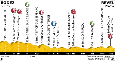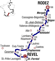 ![]() samedi 17 juillet 2010 ![]() (Aveyron) : Rodez D62 (km 0) - Les Peyssières (km 1) - Flavin (km 5) - Luc-la-Primaube D.911 (km 9) - Bonnecombe D 902 (km 15) - Pont-de Grandfuel D902 (km 20) - La Pendarie (km 23) - Côte de Mergals (km 24-GPM4) - Cassagnes-Begonhes (km 26) - Côte de Bégon (km 31.5-GPM4) - La Rosière-Basse (km 33) - La Selve (km 34) - La Bernardie (km 36) - La Pomparie (km 41) - Saint-Jean-Delnous D903 (km 47-sprint) - Courviala (km 48) - (Tarn) : Valence d'Albigeois (km 54.5) - Saint-Cirgue-Serenac (km 62.5) - Ambialet (km 66.5) - Côte d'Ambialet (km 72-GPM3) - Villefranche d'Albigeois D.999 (km 77) - Mouzieys-Teulet D74 (km 83) - Mousquette D.612 (km 92.5) - Lombers (km 93-ravitaillement) - Realmont (km 98) - Lautrec D92 (km 108.5) - La Mouline (km 117) - Vielmur-sur-Agout (km 119.5) - Côte de Puylaurens (km 125-GPM4) - Puylaurens (km 131.5) - Cuq-Toulza N126 (km 141.5) - (Haute-Garonne) : Caraman D11 (km 158-sprint) - Cambiac (près de) D18 (km 166.5) - Saint-Felix-Lauragais D622 (km 174.5) - Revel (km 184) - Saint-Ferréol D629 (km 188.5) - Côte de Saint-Ferréol (km 188.5-GPM3) - (Tarn) : Pont-Crouzet D151 (km 192) - (Haute-Garonne) : Revel (km 196). ![]() ![]() ![]() Youtube" (résumé) ![]() Étape : ![]() 1. Alexandre Vinokourov (Kaz) en 4h26'26" (moy : 44.139 km/h) 2. Mark Cavendish (Gbr) à 13" 3. Alessandro Petacchi (Ita) 4. Edvald Boasson Hagen (Nor) 5. José Joaquin Rojas (Esp) 6. Julian Dean (Nzl) 7. Anthony Geslin (Fra) 8. Thor Hushovd (Nor) 9. Grega Bole (Slo) 10. Lloyd Mondory (Fra) 11. Gerald Ciolek (All) 12. Martijn Maaskant (Hol) 13. Jürgen Roelandts (Bel) 14. Samuel Sanchez (Esp) 15. Christophe Moreau (Fra) 16. Juan Manuel Garate (Esp) 17. Martin Elmiger (Sui) 18. Denis Menchov (Rus) 19. Yukiya Arashiro (Jap) 20. Oscar Freire (Esp) 21. Christophe Le Mével (Fra) 22. Christopher Horner (Usa) 23. Kevin De Weert (Bel) 24. Benoît Vaugrenard (Fra) 26. George Hincapie (Usa) 27. Jérôme Pineau (Fra) 28. Cyril Gautier (Fra) 29. Cadel Evans (Aus) 30. Nicolas Roche (Irl) 31. Jürgen Van den Broeck (Bel) 32. Eros Capecchi (Ita) 33. Bradley Wiggins (Gbr) 34. Ryder Hesjedal (Can) 35. Michael Rogers (Aus) 36. Roman Kreuziger (Tch) 37. Luis Leon Sanchez (Esp) 38. Sebastian Lang (All) 39. Ruben Perez (Esp) 40. Damien Monier (Fra) 41. Johan Vansummeren (Bel) 42. Carlos Barredo (Esp) 43. Levi Leipheimer (Usa) 44. Janez Brajkovic (Slo) 45. Robert Gesink (Hol) 46. Thomas Lövkvist (Sue) 47. Dries Devenyns (Bel) 48. John Gadret (Fra) 49. Julien El Farès (Fra) 50. Bram Tankink (Hol) 51. Andy Schleck (Lux) 52. Ruben Plaza (Esp) 53. Michael Barry (Can) 54. Sandy Casar (Fra) 55. Pierre Rolland (Fra) 56. Ivan Basso (Ita) 57. Geraint Thomas (Gbr) 58. Rémi Pauriol (Fra) 59. Joaquin Rodriguez (Esp) 60. Andreas Klöden (All) 61. Sébastien Minard (Fra) 62. Gorka Verdugo (Esp) 63. Mario Aerts (Bel) 64. Rémy Di Gregorio (Fra) 65. Damiano Cunego (Ita) 66. Eduard Vorganov (Rus) 67. Sylvain Chavanel (Fra) 68. Egoi Martinez (Esp) 69. Carlos Sastre (Esp) 70. Volodymir Gustov (Ukr) 71. Jürgen Van de Walle (Bel) 72. Thomas Voeckler (Fra) 73. Linus Gerdemann (All) à 47" 74. Christian Knees (All) à 1'34" 75. Koos Moerenhout (Hol) 76. Arkaitz Duran (Esp) 77. Danilo Hondo (All) 78. Alexandr Kolobnev (Rus) 79. Rafael Valls (Esp) 80. Thomas Rohregger (Aut) 81. Daniel Moreno (Esp) 82. Karsten Kroon (Hol) 83. Matthieu Sprick (Fra) 84. José Ivan Gutierrez (Esp) 85. Rinaldo Nocentini (Ita) 86. Sergio Miguel Paulinho (Por) 87. Alexandr Pliuschin (Mol) à 2'14" 88. Serge Pauwels (Bel) 89. Francesco Gavazzi (Ita) 90. Sylwester Szmyd (Pol) 91. Mauro Da Dalto (Ita) 92. Alessandro Ballan (Ita) à 2'28" 93. Benjamin Noval (Esp) à 3'00" 94. Pierrick Fedrigo (Fra) 95. Bernhard Eisel (Aut) 96. Brett Lancaster (Aus) 97. Serguei Ivanov (Rus) 98. Andreas Klier (All) 99. Yaroslav Popovych (Ukr) à 4'35" 101. Maarten Tjallingii (Hol) 102. Aliaksandr Kuschynski (Blr) 103. Mathieu Perget (Fra) 104. Aitor Perez (Esp) 105. Kristjan Koren (Slo) 106. Lars Boom (Hol) 107. Grischa Niermann (All) 108. Johannes Fröhlinger (All) 109. Francis De Greef (Bel) 110. Francesco Bellotti (Ita) 111. Maarten Wynants (Bel) 112. Imanol Erviti (Esp) 113. Matthieu Ladagnous (Fra) 114. Rui Alberto Costa (Por) 115. Nicolas Vogondy (Fra) 116. Stéphane Augé (Fra) 117. Sébastien Turgot (Fra) 118. Vasil Kiryienka (Blr) 119. Francesco Reda (Ita) 120. Matthew Lloyd (Aus) 121. David Zabriskie (Usa) 122. Grégory Rast (Sui) à 5'46" 123. Fabian Wegmann (All) 124. Jakob Fuglsang (Dan) 125. Andriy Grivko (Ukr) 126. Matti Breschel (Dan) 127. Nicki Sørensen (Dan) 128. Luke Roberts (Aus) 129. Daniel Oss (Ita) 130. José Alberto Benitez (Esp) 131. Iban Velasco (Esp) 132. Iñaki Isasi (Esp) 133. Christophe Riblon (Fra) à 6'55" 134. Stuart O'Grady (Aus) à 7'04" 135. Jeremy Hunt (Gbr) 136. Maxime Monfort (Bel) 137. Jens Voigt (All) 138. Juan Antonio Flecha (Esp) 139. Fabian Cancellara (Sui) 140. Robbie McEwen (Aus) 141. Steven Cummings (Gbr) 142. Paolo Tiralongo (Ita) 143. Mirco Lorenzetto (Ita) 144. Mauro Santambrogio (Ita) 145. Wesley Sulzberger (Aus) 146. Daniel Lloyd (Gbr) 147. Bert Grabsch (All) 148. Kanstantsin Siutsou (Blr) 149. Adriano Malori (Ita) 150. Simon Spilak (Slo) 151. Steve Morabito (Sui) 152. Maxime Bouet (Fra) 153. Pavel Brutt (Rus) 154. Dimitri Champion (Fra) 155. Anthony Charteau (Fra) 156. Chris Anker Sørensen (Dan) 157. Kevin Seeldraeyers (Bel) 158. Brian Vandborg (Dan) 159. Ignatas Konovalovas (Lit) 160. Brent Bookwalter (Usa) 161. Anthony Roux (Fra) à 7'12" 162. Jérémy Roy (Fra) à 7'23" 163. Amaël Moinard (Fra) 164. Maxim Iglinskiy (Kaz) 165. Dmitriy Muravyev (Kaz) 166. Manuel Quinziato (Ita) 167. Alan Perez (Esp) 168. Iban Mayoz (Esp) 169. Marcus Burghardt (All) à 9'43" 170. Tony Martin (All) 171. David Millar (Gbr) 172. Daniel Navarro (Esp) à 12'18" 173. David De La Fuente (Esp) 174. Jesus Hernandez (Esp) 175. Christophe Kern (Fra) Abandon : Rein Taaramäe (Est) Prix de la combativité : Juan A