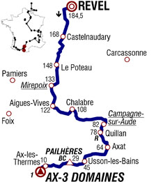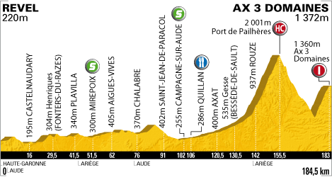 ![]() dimanche 18 juillet 2010 ![]() (Haute-Garonne) : Revel D622 (km 0) - (Aude) : La Pomarède (près de) D624 (km 6) - Peyrens (km 12) - Castelnaudary (km 16) - Villeneuve-le-Comptal (km 20) - Fendeille D6 (km 23.5) - Henriques (km 29.5) - Le Poteau (km 36) - Gélade (km 38) - Plavilla (km 41.5) - (Ariège) : Sainte-Foi (près de) D28 (km 44) - Mirepoix D119 (km 51.5-sprint) - La Bastide-de-Bousignac D625 (km 55) - Saint-Quentin-la-Tour (près de) (km 57) - Aigues-Vives (km 62) - Leran D.28 (km 64.5) - Villaret D28a (km 69) - (Aude) : Chalabre D18 (km 76) - Villefort D12 (km 80.5) - Saint-Jean-de-Paracol (près de) (km 91) - Rouvenac (km 93.5) - Fa (km 97) - Esperaza (km 98.5) - Campagne-sur-Aude D118 (km 102-sprint) - Quillan (km 106-ravitaillement) - Belvianes-et-Cavirac D117 (km 112) - Saint-Martin-Lys (km 116.5) - Axat D118 (km 120.5) - Gesse (km 130.5) - Usson-les-Bains (km 139.5) - (Ariège) : Rouze D216 (km 142) - Mijanes D116 (km 144.5) - Port de Pailhères D25 (km 155.5-GPM HC) - Goulours (km 168) - Ascou (km 169.5) - Ax-Les-Thermes D.613 (km 174) - Bonascre D820 (km 182.5) - Ax-3-Domaines (km 184.5-GPM1). ![]() ![]() ![]() Youtube" (résumé) ![]() Étape : ![]() 1. Christophe Riblon (Fra) en 4h52'42" (moy : 37.820 km/h) 2. Denis Menchov (Rus) à 54" 3. Samuel Sanchez (Esp) 4. Andy Schleck (Lux) à 1'08" 5. Joaquin Rodriguez (Esp) 6. Robert Gesink (Hol) 8. Jürgen Van den Broeck (Bel) 9. Damiano Cunego (Ita) à 1'49" 10. Carlos Sastre (Esp) 11. Levi Leipheimer (Usa) à 1'53" 12. Ryder Hesjedal (Can) à 2'00" 13. Alexandre Vinokourov (Kaz) 14. Luis Leon Sanchez (Esp) à 2'02" 15. Christophe Moreau (Fra) 16. Vasil Kiryienka (Blr) à 2'16" 17. Christopher Horner (Usa) à 2'26" 18. Nicolas Roche (Irl) à 2'27" 19. Thomas Lövkvist (Sue) à 2'30" 20. John Gadret (Fra) 21. Ivan Basso (Ita) 22. Andreas Klöden (All) 23. Kanstantsin Siutsou (Blr) à 2'51" 24. Daniel Moreno (Esp) 25. Sylvain Chavanel (Fra) 26. Kevin De Weert (Bel) à 3'01" 27. Julien El Farès (Fra) 28. Roman Kreuziger (Tch) à 3'03" 29. Christophe Le Mével (Fra) 30. Ruben Plaza (Esp) à 3'17" 31. Amaël Moinard (Fra) à 3'33" 32. Egoi Martinez (Esp) à 4'04" 33. Gorka Verdugo (Esp) 34. Carlos Barredo (Esp) à 4'12" 35. Rafael Valls (Esp) à 4'59" 36. Bradley Wiggins (Gbr) 37. Cadel Evans (Aus) à 5'39" 38. Juan Manuel Garate (Esp) 39. Matthew Lloyd (Aus) 40. Jürgen Van de Walle (Bel) 41. Christophe Kern (Fra) à 7'47" 42. Rémi Pauriol (Fra) 43. Anthony Charteau (Fra) à 8'56" 44. Pierre Rolland (Fra) à 9'05" 45. Chris Anker Sørensen (Dan) à 9'11" 46. Rémy Di Gregorio (Fra) à 9'29" 47. Alexandr Kolobnev (Rus) à 10'48" 48. Kevin Seeldraeyers (Bel) à 10'49" 49. Iban Velasco (Esp) à 11'00" 50. Daniel Navarro (Esp) à 11'48" 51. Pavel Brutt (Rus) 52. Mathieu Perget (Fra) à 12'29" 53. Francis De Greef (Bel) 54. Volodymir Gustov (Ukr) 55. Johan Vansummeren (Bel) à 13'51" 56. Jakob Fuglsang (Dan) à 15'12" 57. Pierrick Fedrigo (Fra) à 15'14" 58. Sebastian Lang (All) 59. Grischa Niermann (All) 60. Janez Brajkovic (Slo) 61. Jérôme Pineau (Fra) 62. Michael Rogers (Aus) 63. Eduard Vorganov (Rus) 64. Cyril Gautier (Fra) 65. Sandy Casar (Fra) 66. Martin Elmiger (Sui) 67. Nicolas Vogondy (Fra) 68. Paolo Tiralongo (Ita) 69. Geraint Thomas (Gbr) 71. George Hincapie (Usa) 72. Koos Moerenhout (Hol) 73. Sylwester Szmyd (Pol) 74. Sergio Miguel Paulinho (Por) 75. Kristjan Koren (Slo) 76. Serge Pauwels (Bel) à 16'58" 77. Stéphane Augé (Fra) à 19'47" 78. José Joaquin Rojas (Esp) à 20'43" 79. Johannes Fröhlinger (All) 80. José Ivan Gutierrez (Esp) 81. Maxime Monfort (Bel) 82. Thomas Rohregger (Aut) 83. David De La Fuente (Esp) 84. Arkaitz Duran (Esp) 85. Aitor Perez (Esp) 86. Francesco Gavazzi (Ita) 87. David Zabriskie (Usa) 88. Matthieu Sprick (Fra) 89. Rui Alberto Costa (Por) 90. Mario Aerts (Bel) 91. Rinaldo Nocentini (Ita) à 22'00" 92. Benoît Vaugrenard (Fra) à 22'43" 93. Grega Bole (Slo) à 24'07" 94. Simon Spilak (Slo) 95. Matthieu Ladagnous (Fra) 96. Aliaksandr Kuschynski (Blr) 97. Jesus Hernandez (Esp) 98. José Alberto Benitez (Esp) 99. Lars Boom (Hol) 100. Christian Knees (All) 101. Imanol Erviti (Esp) 102. Thomas Voeckler (Fra) à 27'10" 103. Yukiya Arashiro (Jap) 104. Linus Gerdemann (All) 105. Oscar Freire (Esp) 106. Martijn Maaskant (Hol) à 28'41" 107. Grégory Rast (Sui) 108. Mauro Da Dalto (Ita) 109. Maxime Bouet (Fra) 110. Anthony Geslin (Fra) 111. Mauro Santambrogio (Ita) à 29'09" 112. Alessandro Ballan (Ita) 113. Karsten Kroon (Hol) 114. Yaroslav Popovych (Ukr) à 30'13" 115. Damien Monier (Fra) à 34'35" 116. David Millar (Gbr) à 36'19" 117. Wesley Sulzberger (Aus) à 36'56" 118. Juan Antonio Flecha (Esp) 119. Alexandr Pliuschin (Mol) 120. Bernhard Eisel (Aut) 121. Michael Barry (Can) 122. Alessandro Petacchi (Ita) 123. Benjamin Noval (Esp) 124. Sébastien Turgot (Fra) 125. Iban Mayoz (Esp) 126. Sébastien Minard (Fra) 127. Bert Grabsch (All) 128. Serguei Ivanov (Rus) 129. Ruben Perez (Esp) 130. Steve Morabito (Sui) 131. Iñaki Isasi (Esp) 132. Alan Perez (Esp) 133. Jens Voigt (All) 134. Luke Roberts (Aus) 135. Francesco Bellotti (Ita) 136. Brett Lancaster (Aus) 137. Brian Vandborg (Dan) 138. Adriano Malori (Ita) 139. Manuel Quinziato (Ita) 140. Eros Capecchi (Ita) 141. Maarten Tjallingii (Hol) 142. Daniel Lloyd (Gbr) 143. Lloyd Mondory (Fra) 144. Dimitri Champion (Fra) 145. Maarten Wynants (Bel) 146. Daniel Oss (Ita) 147. Dmitriy Muravyev (Kaz) 148. Dries Devenyns (Bel) 149. Brent Bookwalter (Usa) 150. Ignatas Konovalovas (Lit) 151. Mirco Lorenzetto (Ita) 152. Fabian Wegmann (All) 153. Andriy Grivko (Ukr) 154. Robbie McEwen (Aus) 155. Jürgen Roelandts (Bel) 156. Danilo Hondo (All) 157. Marcus Burghardt (All) 158. Francesco Reda (Ita) 159. Julian Dean (Nzl) 160. Tony Martin (All) 161. Mark Cavendish (Gbr) 162. Bram Tankink (Hol) 163. Nicki Sørensen (Dan) 164. Stuart O'Grady (Aus) 165. Edvald Boasson Hagen (Nor) 166. Thor Hushovd (Nor) 167. Fabian Cancellara (Sui) 168. Steven Cummings (Gbr)