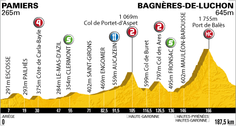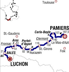 ![]() lundi 19 juillet 2010 ![]() (Ariège) : Pamiers D119 (km 0) - Bezac (près de) (km 3) - Escosse (km 7) - Rhode-de-Bas (km 10) - Gouses (km 13) - Le Pal (km 14.5) - Pailhes (km 19) - Artigat D919 (km 23) - Côte de Carla-Bayle D14 (km 30) - Carla-Bayle (km 30.5) - Campagne-sur-Arize (km 37) - Les Bordes-sur-Arize D628 (km 40.5) - Sabarat (km 42) - Le-Mas-d'Azil D119 (km 47) - Grotte du Mas-d'Azil (km 49) - Maury (km 50) - Rieubach (km 51) - Le Saret (km 52.5) - Peyruc (km 54) - Clermont (km 55-sprint) - La Grausse (km 56) - Lescure (km 63.5) - Saint-Girons D117 (km 71) - Moulis D618 (km 79) - Luzenac (km 80.5) - Arguilla (km 81.5) - Engomer (km 82.5) - Audressein (km 87) - Argein (km 89.5) - Aucazein (km 91.5-ravitaillement) - Illartein (km 92) - Augistrou (km 94.5) - Orgibet (km 94.5) - Augirein (près de) (km 97) - Saint-Lary (km 99) - (Haute-Garonne) : Portet-d'Aspet (km 102.5) - Col de Portet-D'aspet (km 105-GPM2) - Henne-Morte (km 110) - Sengouagnet (près de) (km 115) - Col de Buret (km 116.5) - Juzet-D'izaut (km 117) - Cazaunous (km 120.5) - Col des Ares (km 126.5-GPM2) - Antichan (km 130) - Antichan-de-Frontignes (km 130.5) - Fronsac (km 136-sprint) - Chaum (km 136.5) - Estenos D825 (km 137.5) - (Hautes-Pyrénées) : Salechan (km 139) - Siradan D924 (km 140.5) - Cazarilh (km 145) - Mauleon-Barousse (km 146) - Ferrere D925 (km 149.5) - Chalet-Saint-Néré (km 153) - Port de Balès (km 166-GPM HC) - (Haute-Garonne) : Bourg-d'Oueil D51d (km 172) - Cires D51 (km 173.5) - Caubous (km 174) - Mayreygne (km 175.5) - Saint-Paul-d'Oueil (km 178) - Trebons-de-Luchon (km 181.5) - entrée Bagnères-de-Luchon D618 (km 184.5) - Bagnères-de-Luchon (km 187.5). ![]() ![]() ![]() "Youtube" (résumé) ![]() Étape : ![]() 1. Thomas Voeckler (Fra) en 4h44'51" (moy : 39.494 km/h) 2. Alessandro Ballan (Ita) à 1'20" 3. Aitor Perez (Esp) 4. Lloyd Mondory (Fra) à 2'50" 5. Luke Roberts (Aus) 6. Francesco Reda (Ita) 8. Samuel Sanchez (Esp) 9. Denis Menchov (Rus) 10. Brian Vandborg (Dan) 11. Johan Vansummeren (Bel) 12. Andy Schleck (Lux) à 3'29" 13. Jürgen Van den Broeck (Bel) 14. Alexandre Vinokourov (Kaz) 15. Robert Gesink (Hol) à 3'55" 16. Ryder Hesjedal (Can) 17. Levi Leipheimer (Usa) 18. John Gadret (Fra) 19. Roman Kreuziger (Tch) à 4'08" 20. Kevin De Weert (Bel) 21. Joaquin Rodriguez (Esp) 22. Andreas Klöden (All) 24. Carlos Sastre (Esp) 25. Serguei Ivanov (Rus) à 4'14" 26. Ruben Plaza (Esp) à 5'18" 27. Christophe Moreau (Fra) à 5'44" 28. Daniel Moreno (Esp) 29. Juan Manuel Garate (Esp) 30. Luis Leon Sanchez (Esp) 31. Christopher Horner (Usa) 32. Ivan Basso (Ita) 33. Matthew Lloyd (Aus) 34. Sylvain Chavanel (Fra) 35. Thomas Lövkvist (Sue) 36. Cadel Evans (Aus) à 6'58" 37. Nicolas Roche (Irl) à 7'52" 38. Christophe Le Mével (Fra) à 8'35" 39. Maxime Monfort (Bel) 40. Julien El Farès (Fra) 41. Rémi Pauriol (Fra) 42. Michael Rogers (Aus) 43. Volodymir Gustov (Ukr) 44. Steve Morabito (Sui) 45. Iban Velasco (Esp) 46. Mario Aerts (Bel) 47. Daniel Navarro (Esp) 48. Bradley Wiggins (Gbr) à 9'35" 49. Iñaki Isasi (Esp) 50. Sergio Miguel Paulinho (Por) 51. Sébastien Turgot (Fra) 52. Eduard Vorganov (Rus) à 12'01" 53. Paolo Tiralongo (Ita) à 12'41" 54. Chris Anker Sørensen (Dan) à 13'04" 55. Alexandr Pliuschin (Mol) à 13'08" 56. George Hincapie (Usa) 57. Rémy Di Gregorio (Fra) 58. Grischa Niermann (All) 59. Damiano Cunego (Ita) 60. Jesus Hernandez (Esp) 61. Francesco Gavazzi (Ita) à 15'20" 62. Anthony Roux (Fra) à 15'44" 63. Sandy Casar (Fra) à 17'09" 64. Mathieu Ladagnous (Fra) 65. José Joaquin Rojas (Esp) 66. Michael Barry (Can) 67. Alexandr Kolobnev (Rus) 68. Sylwester Szmyd (Pol) 69. Kanstantsin Siutsou (Blr) 70. Vasil Kiryienka (Blr) 71. Benjamin Noval (Esp) 72. Jakob Fuglsang (Dan) 73. David De La Fuente (Esp) 74. Francis De Greef (Bel) 75. Maxime Bouet (Fra) 76. Thomas Rohregger (Aut) 77. Sebastian Lang (All) 78. Grega Bole (Slo) 79. Janez Brajkovic (Slo) 80. Anthony Charteau (Fra) 81. Koos Moerenhout (Hol) 82. Cyril Gautier (Fra) 83. Lars Boom (Hol) 84. Dimitri Champion (Fra) 85. Arkaitz Duran (Esp) 86. Jürgen Van de Walle (Bel) à 19'39" 87. Jürgen Roelandts (Bel) 88. Maarten Wynants (Bel) 89. Maarten Tjallingii (Hol) à 24'01" 90. Jérôme Pineau (Fra) 91. Johannes Fröhlinger (All) 92. Christophe Riblon (Fra) 93. Christian Knees (All) 94. Sébastien Minard (Fra) 95. Pierrick Fedrigo (Fra) 96. Pierre Rolland (Fra) 97. Egoi Martinez (Esp) 98. Nicki Sørensen (Dan) 99. Dries Devenyns (Bel) 100. Matthieu Sprick (Fra) 101. José Ivan Gutierrez (Esp) à 26'04" 102. Imanol Erviti (Esp) 103. Mathieu Perget (Fra) 104. Geraint Thomas (Gbr) 105. Eros Capecchi (Ita) 106. Mauro Da Dalto (Ita) 107. Pavel Brutt (Rus) 108. Rafael Valls (Esp) 109. Gorka Verdugo (Esp) 110. Carlos Barredo (Esp) 111. Kevin Seeldraeyers (Bel) à 28'40" 112. Robbie McEwen (Aus) à 28'49" 113. Mark Cavendish (Gbr) 114. Mirco Lorenzetto (Ita) 115. Alessandro Petacchi (Ita) 116. Matti Breschel (Dan) 117. Andriy Grivko (Ukr) 118. Gerald Ciolek (All) 119. Bernhard Eisel (Aut) 120. Bert Grabsch (All) 121. Yaroslav Popovych (Ukr) 122. Danilo Hondo (All) 123. Dmitriy Muravyev (Kaz) 124. Gregory Rast (Sui) 125. Martin Elmiger (Sui) 126. Juan Antonio Flecha (Esp) 127. Karsten Kroon (Hol) 128. Julian Dean (Nzl) 129. Simon Spilak (Slo) 130. Manuel Quinziato (Ita) 131. Kristjan Koren (Slo) 132. Tony Martin (All) 133. Francesco Bellotti (Ita) 134. Linus Gerdemann (All) 135. Daniel Oss (Ita) 136. Aliaksandr Kuschynski (Blr) 137. Oscar Freire (Esp) 138. Alan Perez (Esp) 139. José Alberto Benitez (Esp) 140. Ruben Perez (Esp) 141. Steven Cummings (Gbr) 142. Yukiya Arashiro (Jap) 143. Adriano Malori (Ita) 144. Nicolas Vogondy (Fra) 145. Daniel Lloyd (Gbr) 146. Serge Pauwels (Bel) 147. Brent Bookwalter (Usa) 148. Fabian Wegmann (All) 149. Brett Lancaster (Aus) 150. Stuart O'Grady (Aus) 151. David Millar (Gbr) 152. Martijn Maaskant (Hol) 153. Rui Alberto Costa (Por) 154. David Zabriskie (Usa) 155. Wesley Sulzberger (Aus) 156