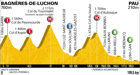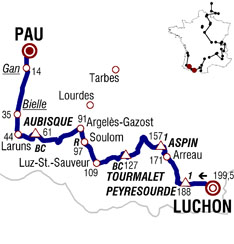 ![]() mardi 20 juillet 2010 ![]() (Haute-Garonne) : Bagnères-de-Luchon D618 (km 0) - Trebons-de-Luchon (km 0.5) - Saint-Aventin (km 2) - Castillon-de-Larboust (km 3.5) - Cazeaux-de-Larboust (km 3.5) - Garin (km 5) - Col de Peyresourde (km 11-GPM1) - (Hautes-Pyrénées) : Escadaoux (km 17.5) - Estarvielle (près de) (km 18.5) - Anéran (Cazaux-Frechet-Aneran-Camors) (km 19) - Bordères-Louron (km 24) - Arreau (km 28.5) - Col d'Aspin D918 (km 42.5-GPM1) - Payolle (km 47) - La Séoube (km 51) - Sainte-Marie-de-Campan (km 54.5) - Gripp (km 59) - Artigues (km 61.5) - La Mongie (km 67.5) - Col du Tourmalet (km 72-GPM HC) - Barèges (km 82.5) - Esterre (km 89.5) - Luz-Saint-Sauveur (km 90) - Esquieze-Sere D 921 (km 90.5) - Soulom (km 102-ravitaillement) - Pierrefitte-Nestalas (km 102.5) - Adast (km 104.5) - Lau-Balagnas (km 106.5) - Argeles-Gazost (km 108) - Arras-en-Lavedan D918 (km 112) - Aucun (km 118) - Marsous (km 119) - Arrens-Marsous (km 120.5) - Col du Soulor (km 128.5) - (Pyrénées-Atlantiques) : Col d'Aubisque (km 138-GPM HC) - Gourette (km 142) - Eaux-Bonnes (km 150.5) - Laruns D934 (km 155) - Bielle D934B (km 164.5-sprint) - Louvie-Juzon D934 (km 168) - Sevignacq-Meyracq (km 171.5) - Rebenacq (km 177.5) - Gan (km 185.5-sprint) - Jurancon N134 (km 189) - entrée Pau (km 193) - Pau (km 199.5). ![]() ![]() ![]() "Youtube" (résumé) ![]() Étape : ![]() 1. Pierrick Fedrigo (Fra) en 5h31'43" (moy : 36.085 km/h) 2. Sandy Casar (Fra) 3. Ruben Plaza (Esp) 4. Damiano Cunego (Ita) 5. Christopher Horner (Usa) 7. Jürgen Van de Walle (Bel) 8. Christophe Moreau (Fra) 9. Carlos Barredo (Esp) à 28" 10. Thor Hushovd (Nor) à 6'45" 11. José Joaquin Rojas (Esp) 12. Eros Capecchi (Ita) 13. Nicolas Roche (Irl) 14. Gerald Ciolek (All) 15. Martin Elmiger (Sui) 16. Aliaksandr Kuschynski (Blr) 17. Benoît Vaugrenard (Fra) 18. Maxime Monfort (Bel) 19. Ryder Hesjedal (Can) 20. Jürgen Van den Broeck (Bel) 21. Andy Schleck (Lux) 23. Matthew Lloyd (Aus) 24. Alan Perez (Esp) 25. Mathieu Perget (Fra) 26. Rui Alberto Costa (Por) 27. José Ivan Gutierrez (Esp) 28. Alexandre Vinokourov (Kaz) 29. Samuel Sanchez (Esp) 30. Denis Menchov (Rus) 31. Julien El Farès (Fra) 32. George Hincapie (Usa) 33. Kevin De Weert (Bel) 34. Roman Kreuziger (Tch) 35. Joaquin Rodriguez (Esp) 36. Imanol Erviti (Esp) 37. Robert Gesink (Hol) 38. Daniel Navarro (Esp) 39. Levi Leipheimer (Usa) 40. Janez Brajkovic (Slo) 41. Egoi Martinez (Esp) 42. Jakob Fuglsang (Dan) 43. Bradley Wiggins (Gbr) 44. Daniel Moreno (Esp) 45. Steve Morabito (Sui) 46. Luis Leon Sanchez (Esp) 47. Thomas Lövkvist (Sue) 48. John Gadret (Fra) 49. Rafael Valls (Esp) 50. Christophe Riblon (Fra) 51. Gorka Verdugo (Esp) 52. Andreas Klöden (All) 53. Sergio Miguel Paulinho (Por) 54. Jérôme Pineau (Fra) 55. Carlos Sastre (Esp) 56. Geraint Thomas (Gbr) 57. Koos Moerenhout (Hol) 58. Anthony Charteau (Fra) 59. Paolo Tiralongo (Ita) 60. Ignatas Konovalovas (Lit) à 6'59" 61. Mario Aerts (Bel) à 8'22" 62. David Zabriskie (Usa) à 9'27" 63. Dmitriy Muravyev (Kaz) à 10'01" 64. Sylvain Chavanel (Fra) à 23'42" 65. Daniel Oss (Ita) 66. Ruben Perez (Esp) 67. Matthieu Ladagnous (Fra) 68. Grischa Niermann (All) 69. Grégory Rast (Sui) 70. Alexandr Kolobnev (Rus) 71. Juan Manuel Garate (Esp) 72. Rinaldo Nocentini (Ita) 73. Johan Vansummeren (Bel) 74. Christophe Kern (Fra) 75. Sebastian Lang (All) 76. Francesco Bellotti (Ita) 77. Cyril Gautier (Fra) 78. Yaroslav Popovych (Ukr) 79. Rémi Pauriol (Fra) 80. Volodymir Gustov (Ukr) 81. Cadel Evans (Aus) 82. Chris Anker Sørensen (Dan) 83. Michael Rogers (Aus) 84. Linus Gerdemann (All) 85. Juan Antonio Flecha (Esp) 86. Sylwester Szmyd (Pol) 87. Jesus Hernandez (Esp) 88. Stuart O'Grady (Aus) 89. Maarten Tjallingii (Hol) à 34'48" 90. Robbie McEwen (Aus) 91. Alessandro Petacchi (Ita) 92. Grega Bole (Slo) 93. Alexandr Pliuschin (Mol) 94. Stéphane Augé (Fra) 95. Mauro Da Dalto (Ita) 96. Francesco Gavazzi (Ita) 97. Danilo Hondo (All) 98. Sébastien Minard (Fra) 99. Matti Breschel (Dan) 100. Bert Grabsch (All) 101. Marcus Burghardt (All) 102. Simon Spilak (Slo) 103. Michael Barry (Can) 104. Sébastien Turgot (Fra) 105. Maarten Wynants (Bel) 106. Kevin Seeldraeyers (Bel) 107. Serguei Ivanov (Rus) 108. Nicki Sørensen (Dan) 109. Kristjan Koren (Slo) 110. Serge Pauwels (Bel) 111. Ivan Basso (Ita) 112. Brian Vandborg (Dan) 113. José Alberto Benitez (Esp) 114. Daniel Lloyd (Gbr) 115. Mark Cavendish (Gbr) 116. Mirco Lorenzetto (Ita) 117. Bernhard Eisel (Aut) 118. Kanstantsin Siutsou (Blr) 119. Adriano Malori (Ita) 120. Fabian Cancellara (Sui) 121. Jens Voigt (All) 122. Francis De Greef (Bel) 123. Christian Knees (All) 124. Eduard Vorganov (Rus) 125. Steven Cummings (Gbr) 126. Thomas Rohregger (Aut) 127. Alessandro Ballan (Ita) 128. Wesley Sulzberger (Aus) 129. Lloyd Mondory (Fra) 130. Iñaki Isasi (Esp) 131. Iban Velasco (Esp) 132. Vasil Kiryienka (Blr) 133. Brent Bookwalter (Usa) 134. Matthieu Sprick (Fra) 135. Karsten Kroon (Hol) 136. Jürgen Roelandts (Bel) 137. Edvald Boasson Hagen (Nor) 138. Pavel Brutt (Rus) 139. Luke Roberts (Aus) 140. Yukiya Arashiro (Jap) 141. Maxime Bouet (Fra) 142. Jérémy Roy (Fra) 143. Dimitri Champion (Fra) 144. Damien Monier (Fra) 145. Christophe Le Mével (Fra) 146. Amaël Moinard (Fra) 147. Nicolas Vogondy (Fra) 148. Pierre Rolland (Fra) 149. Benjamin Noval (Esp) 150. David De La Fuente (Esp) 151. Andriy Grivko (Ukr) 152. Maxim Iglinskiy (Kaz) 153. Arkaitz Duran (Esp) 154. Aitor Perez (Esp) 155. Johannes Fröhlinger (All) 156. Fabian Wegmann (All) 157. Anthony Geslin (Fra) 158. Thomas Voeckler (Fra) 159. Rémy Di Gregorio (Fra) 160. Dries Devenyns (Bel) 161. Francesco Reda (Ita) 162. Anthony Roux (Fra) 163. Manuel Quinziato (Ita) 164. Lars Boom (Hol) 165. Martijn Maaskant (Hol) 166. Oscar Freire (Esp) 167. Julian Dean (Nzl) 168. Brett Lancaster (Aus) 169. Tony Martin (All) 170. David Millar (Gbr) 171. Andreas Klier (All) 172. Jeremy Hunt (Gbr) Non-partants : Iban Mayoz (Esp) Bram Tankink (Hol) Prix de la comba