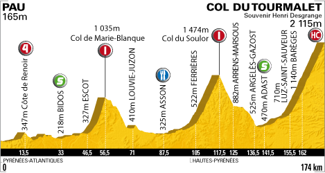 ![]() jeudi 22 juillet 2010 ![]() (Pyrénées-Atlantiques) : Pau D2 (km 0) - Laroin D803 (km 1.5) - Jurancon (près de) D217 (km 7) - Côte de Renoir D24 (km 13.5-GPM4) - Brana (km 16.5) - Lasseube (km 18) - Estialescq (près de) (km 25) - Goes (km 28.5) - Oloron (km 30) - Bidos N134 (km 33) - Gurmençon (km 34) - Asasp-Arros (km 36.5) - Escot D238 (km 46.5) - Col de Marie-Blanque D294 (km 56.5-GPM1) - Bilhères-en-Ossau (km 64) - Bielle (près de) (km 67.5) - Izeste D934 (km 71) - Louvie-Juzon (km 71) - Pédestarrès D35 (km 77) - Mifaget (km 81.5) - Bruges (km 83.5) - Asson (km 87.5) - Arthez-d'Asson D126 (km 94.5) - (Hautes-Pyrénées) : La Hérrère D426 (km 102) - Ferrières D126 (km 105) - Arbeost (km 108.5) - Col du Soulor (km 117.5-GPM1) - Arrens-Marsous D918 (km 125) - Marsous (km 126.5) - Aucun (km 127.5) - Arras-en-Lavedan (km 133.5) - Argelès-Gazost (km 136.5) - Lau-Balagnas D921 (km 138.5) - Adast (km 141.5) - Pierrefitte-Nestalas (km 142) - Soulom (km 143.5) - Esquieze-Sere (km 154) - Luz-Saint-Sauveur (km 155.5) - Esterre D918 (km 156) - Barèges (km 162) - Col du Tourmalet (km 174-GPM HC). ![]() ![]() ![]() "Youtube" (résumé) ![]() Étape : ![]() 1. Andy Schleck (Lux) en 5h03'29" (moy : 34.401 km/h) 3. Joaquin Rodriguez (Esp) à 1'18" 4. Ryder Hesjedal (Can) à 1'27" 5. Samuel Sanchez (Esp) à 1'32" 6. Denis Menchov (Rus) à 1'40" 7. Robert Gesink (Hol) 8. Christopher Horner (Usa) à 1'45" 9. Jürgen Van den Broeck (Bel) à 1'48" 10. Roman Kreuziger (Tch) à 2'14" 11. Damiano Cunego (Ita) à 3'00" 12. Nicolas Roche (Irl) à 3'26" 13. Andreas Klöden (All) à 3'30" 14. John Gadret (Fra) à 3'35" 15. Kanstantsin Siutsou (Blr) à 3'44" 16. Steve Morabito (Sui) à 3'58" 18. Carlos Barredo (Esp) à 4'16" 19. Vasil Kiryienka (Blr) à 4'27" 20. Luis Leon Sanchez (Esp) 21. Pierre Rolland (Fra) à 4'30" 22. Christophe Moreau (Fra) à 4'36" 23. Ruben Plaza (Esp) à 4'59" 24. Gorka Verdugo (Esp) à 5'15" 25. Daniel Moreno (Esp) à 5'23" 26. Amaël Moinard (Fra) à 5'30" 27. Anthony Charteau (Fra) à 5'37" 28. Sylwester Szmyd (Pol) à 5'42" 29. Cyril Gautier (Fra) à 5'44" 30. Alexandr Kolobnev (Rus) à 5'52" 31. Kevin De Weert (Bel) à 5'56" 32. Christophe Riblon (Fra) à 5'58" 33. Thomas Lövkvist (Sue) à 6'21" 34. Martin Elmiger (Sui) à 6'35" 35. Ruben Perez (Esp) à 6'52" 36. Kristjan Koren (Slo) à 7'02" 37. Sandy Casar (Fra) à 7'36" 38. Mario Aerts (Bel) à 7'49" 39. Julien El Farès (Fra) à 7'55" 40. Rémy Di Gregorio (Fra) à 8'27" 41. Juan Manuel Garate (Esp) à 8'53" 42. Sergio Miguel Paulinho (Por) à 8'59" 43. Levi Leipheimer (Usa) 44. Francis De Greef (Bel) 45. Volodymir Gustov (Ukr) à 9'02" 46. Johan Vansummeren (Bel) à 9'14" 47. José Ivan Gutierrez (Esp) à 10'12" 48. Sébastien Minard (Fra) à 10'26" 49. Alexandre Vinokourov (Kaz) à 10'45" 50. Thomas Rohregger (Aut) 51. Matthew Lloyd (Aus) 52. Daniel Navarro (Esp) 53. Iban Velasco (Esp) à 10'51" 54. Sylvain Chavanel (Fra) à 11'16" 55. Pierrick Fedrigo (Fra) 56. Jakob Fuglsang (Dan) à 11'35" 57. Chris Anker Sørensen (Dan) 58. Egoi Martinez (Esp) 59. Cadel Evans (Aus) à 12'00" 60. Marcus Burghardt (All) 61. Rui Alberto Costa (Por) à 12'05" 62. David Zabriskie (Usa) à 14'41" 63. Rémi Pauriol (Fra) à 15'00" 64. Aitor Perez (Esp) à 15'35" 65. Mathieu Perget (Fra) 66. Eduard Vorganov (Rus) 67. George Hincapie (Usa) 68. Koos Moerenhout (Hol) 69. Ivan Basso (Ita) à 16'28" 70. Aliaksandr Kuschynski (Blr) 71. Jesus Hernandez (Esp) 72. Carlos Sastre (Esp) à 16'48" 73. Paolo Tiralongo (Ita) à 16'52" 74. Serguei Ivanov (Rus) 75. Fabian Cancellara (Sui) à 17'18" 76. David De La Fuente (Esp) à 17'49" 77. Grega Bole (Slo) 78. Juan Antonio Flecha (Esp) à 19'33" 79. Matthieu Ladagnous (Fra) à 19'45" 80. Maarten Wynants (Bel) à 20'08" 81. Edvald Boasson Hagen (Nor) à 20'38" 82. Alan Perez (Esp) à 21'14" 83. Linus Gerdemann (All) à 22'34" 84. Michael Rogers (Aus) à 23'19" 85. Maxime Monfort (Bel) 86. Sebastian Lang (All) 87. Francesco Bellotti (Ita) 88. Bradley Wiggins (Gbr) 89. Grischa Niermann (All) 90. Dmitriy Muravyev (Kaz) 91. Grégory Rast (Sui) 92. Yaroslav Popovych (Ukr) 93. Lars Boom (Hol) 94. Jürgen Van de Walle (Bel) 95. Jérôme Pineau (Fra) à 23'29" 96. Dries Devenyns (Bel) à 28'10" 97. Kevin Seeldraeyers (Bel) 98. Thomas Voeckler (Fra) à 28'17" 99. Christophe Kern (Fra) 100. Yukiya Arashiro (Jap) 101. Fabian Wegmann (All) à 28'47" 102. Christian Knees (All) 103. Rinaldo Nocentini (Ita) 104. Michael Barry (Can) 105. Benjamin Noval (Esp) à 28'58" 106. Stuart O'Grady (Aus) 107. Matti Breschel (Dan) 108. Jens Voigt (All) 109. Eros Capecchi (Ita) 110. José Joaquin Rojas (Esp) 111. Nicki Sørensen (Dan) 112. Daniel Oss (Ita) 113. Jürgen Roelandts (Bel) 114. Geraint Thomas (Gbr) 115. Francesco Gavazzi (Ita) 116. Imanol Erviti (Esp) 117. Janez Brajkovic (Slo) 118. José Alberto Benitez (Esp) 119. Brent Bookwalter (Usa) 120. Matthieu Sprick (Fra) 121. Mauro Da Dalto (Ita) 122. Steven Cummings (Gbr) 123. Nicolas Vogondy (Fra) 124. Christophe Le Mével (Fra) 125. Rafael Valls (Esp) 126. Arkaitz Duran (Esp) 127. Julian Dean (Nzl) 128. Maxim Iglinskiy (Kaz) 129. Manuel Quinziato (Ita) 130. Alessandro Ballan (Ita) 131. Benoît Vaugrenard (Fra) 132. Karsten Kroon (Hol) 133. Sébastien Turgot (Fra) 134. Martijn Maaskant (Hol) à 30'05" 135. Oscar Freire (Esp) 136. Thor Hushovd (Nor) 137. Maarten Tjallingii (Hol) 138. Pavel Brutt (Rus) 139. Brett Lancaster (Aus) 140. Gerald Ciolek (All) 141. Johannes Fröhlinger (All) 142. Adriano Malori (Ita) 143. Serge Pauwels (Bel) 144. Jérémy Roy (Fra) à 30'10" 145. Wesley Sulzberger (Aus) 146. Luke Roberts (Aus) 147. Anthony Geslin (Fra) 148. Jeremy Hunt (Gbr) à 30'17" 149. Brian Vandborg (Dan) 150. Andriy Grivko (Ukr) à 30'23" 151. Ignatas Konovalovas (Lit) à 30'26" 152. Daniel Lloyd (Gbr) à 30'35" 153. Maxime Bouet (Fra) à 30'50" 154. Dimitri Champion (Fra) 155. Lloyd Mondory (Fra) 156. Mirco Lorenzetto (Ita) à 30'53" 157. Damien Monier (Fra) à 31'00