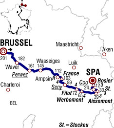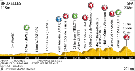 ![]() lundi 5 juillet 2010 ![]() (BELGIQUE) - (Bruxelles-Capitale) : Bruxelles N3 (km 0) - (Vlaams Brabant) : Tervuren (km 1) - Duisburg (km 4.5) - Overijse (km 7.5) - (Brabant Wallon) : Wavren 4 (km 18.5) - Bonlez N243 (km 27.5) - Gistoux (km 28.5) - Chaumont (km 31) - Tourinnes-Saint-Lambert (km 33.5) - Malèves-Sainte-Marie-Wastines (km 34.5) - Orbais (km 35.5) - Thorembais-Saint-Trond (km 37) - Perwez (km 39.5-sprint) - Grand-Rosière-Hottemont (km 43) - (Namur) : Noville-sur-M. (km 46) - Harlue N624 (km 49) - Taviers (km 49.5) - Boneffe (km 52) - Branchon (km 53) - (Liège) : Wasseiges (km 55.5) - Ambresin (km 57.5) - Villers-le-Peuplier (Hannut) N69 (km 63) - Lens-Saint-Rémy (km 65) - Latinne N64 (km 68.5) - Fallais (km 71) - Vinalmont (km 76.5) - Villers-le Bouillet N684 (km 82) - Jehay (km 82.5) - Ampsin (km 86) - Ampsin N617 (km 89-ravitaillement) - Amay (km 92.5) - Ombret (km 94) - Côte de France (km 98-GPM4) - Villers-le-Temple (km 98.5) - Outrelouxhe (km 101) - Strée (km 104.5) - Soheit N66 (km 109.5) - Seny (km 112-sprint) - Warzée (km 113.5) - Ouffet (km 117) - Hamoir (km 122) - Filot (km 127) - Côte de Filot (km 128.5-GPM4) - Ferrières (km 129.5) - Côte de Werbomont (km 136-GPM4) - Chevron (km 141) - Basse-Bodeux (km 148.5) - Trois-Ponts (km 156.5) - Nouprez (km 159) - Aissomont (km 160.5) - Côte d'Aisomont (km 161.5-GPM3) - Wanne (km 162.5) - Hénumont (km 166) - Col de Stockeu (km 167.5-GPM3) - Stavelot (km 169.5) - Trois-Ponts N68 (km 175.5) - Coo N633 (km 177-sprint) - La Gleize (km 182) - Borgoumont (km 184) - Cour (km 185.5) - Col du Rosier (km 189-GPM3) - Creppe (km 194) - entrée Spa (km 196.5) - Spa (km 201). ![]() ![]() ![]() Youtube" (résumé étape 2) ![]() Étape : ![]() 1. Sylvain Chavanel (Fra) en 4h40'48" (moy : 42.949 km/h) 2. Maxime Bouet (Fra) à 3'56" 3. Fabian Wegmann (All) 4. Robbie McEwen (Aus) 5. Christian Knees (All) 6. Jürgen Roelandts (Bel) 7. Thor Hushovd (Nor) 8. Linus Gerdemann (All) 9. Mathieu Ladagnous (Fra) 10. Bernhard Eisel (Aut) 11. Daniel Moreno (Esp) 12. Fabian Cancellara (Sui) 13. Karsten Kroon (Hol) 14. Johan Vansummeren (Bel) 15. José Joaquin Rojas (Esp) 16. Serge Pauwels (Bel) 17. Jeremy Hunt (Gbr) 18. Stijn Vandenbergh (Bel) 19. Roman Kreuziger (Tch) 20. Martijn Maaskant (Hol) 21. Thomas Rohregger (Aut) 22. Danilo Hondo (All) 23. Luke Roberts (Aus) 24. Carlos Barredo (Esp) 25. Robert Gesink (Hol) 26. Kristjan Koren (Slo) 27. Mauro Da Dalto (Ita) 28. Pierre Rolland (Fra) 29. Jakob Fuglsang (Dan) 30. Aliaksandr Kuschynski (Blr) 31. Ruben Perez (Esp) 32. Kevin De Weert (Bel) 33. Christopher Horner (Usa) 34. Levi Leipheimer (Usa) 35. Jürgen Van den Broeck (Bel) 36. Amets Txurruka (Esp) 37. Rui Alberto Costa (Por) 38. Eduard Vorganov (Rus) 39. Grischa Niermann (All) 40. Thomas Lövkvist (Sue) 41. Bram Tankink (Hol) 42. Cadel Evans (Aus) 43. Ivan Basso (Ita) 44. Andreas Klöden (All) 45. Carlos Sastre (Esp) 46. Bert Grabsch (All) 47. Alessandro Ballan (Ita) 48. Ryder Hesjedal (Can) 49. Denis Menchov (Rus) 50. Nicolas Roche (Irl) 51. Janez Brajkovic (Slo) 52. Brent Bookwalter (Usa) 53. Juan Antonio Flecha (Esp) 55. Christophe Moreau (Fra) 56. Christophe Kern (Fra) 57. Frank Schleck (Lux) 58. Yaroslav Popovych (Ukr) 59. Maxim Iglinskiy (Kaz) 60. Johannes Fröhlinger (All) 61. Alexandre Vinokourov (Kaz) 62. Paolo Tiralongo (Ita) 63. Iñaki Isasi (Esp) 64. Imanol Erviti (Esp) 65. Maarten Wynants (Bel) 66. José Ivan Gutierrez (Esp) 67. Volodymir Gustov (Ukr) 68. Rémi Pauriol (Fra) 69. Simon Gerrans (Aus) 70. Alexandr Kolobnev (Rus) 71. Joaquin Rodriguez (Esp) 72. Markus Eibegger (Aut) 73. Sandy Casar (Fra) 74. Alexandr Pliuschin (Mol) 75. Julien El Farès (Fra) 76. Benjamin Noval (Esp) 77. Samuel Sanchez (Esp) 78. Luis Leon Sanchez (Esp) 79. Iban Velasco (Esp) 80. Geraint Thomas (Gbr) 82. Andy Schleck (Lux) 83. Daniel Navarro (Esp) 84. Rafael Valls (Esp) 85. Gorka Verdugo (Esp) 86. Aitor Perez (Esp) 87. Daniel Oss (Ita) 88. Egoi Martinez (Esp) 89. Cyril Gautier (Fra) 90. Sylwester Szmyd (Pol) 91. Andriy Grivko (Ukr) 92. Mathieu Perget (Fra) 93. Michael Rogers (Aus) 94. David Lelay (Fra) 95. Bradley Wiggins (Gbr) 96. Edvald Boasson Hagen (Nor) 97. Arkaitz Duran (Esp) 98. Juan Manuel Garate (Esp) 99. Kanstantsin Siutsou (Blr) 100. Maxime Monfort (Bel) 101. Steven Cummings (Gbr) 102. Christophe Riblon (Fra) 103. Ruben Plaza (Esp) 104. Matthieu Sprick (Fra) 105. Damien Monier (Fra) 106. Vladimir Karpets (Rus) 107. Oscar Freire (Esp) 108. Pierrick Fedrigo (Fra) 109. Francesco Bellotti (Ita) 110. Tony Martin (All) 111. Yukiya Arashiro (Jap) 112. Martin Elmiger (Sui) 113. Christophe Le Mével (Fra) 114. David Millar (Gbr) 115. Rinaldo Nocentini (Ita) 116. John Gadret (Fra) 117. Francesco Reda (Ita) 118. Anthony Charteau (Fra) 119. Jérôme Pineau (Fra) 120. Thomas Voeckler (Fra) 121. Jürgen Van de Walle (Bel) 122. Michael Barry (Can) 123. Rémy Di Gregorio (Fra) 124. Nicolas Vogondy (Fra) 125. Wesley Sulzberger (Aus) à 4'09" 126. Fabio Felline (Ita) 127. Amaël Moinard (Fra) à 4'12" 128. Sébastien Minard (Fra) 129. Francis De Greef (Bel) à 4'58" 130. Grégory Rast (Sui) à 8'51" 131. Marcus Burghardt (All) 132. Sébastien Turgot (Fra) 133. Jérémy Roy (Fra) 134. Francesco Gavazzi (Ita) 135. David Zabriskie (Usa) 136. Damiano Cunego (Ita) 137. Rein Taaramäe (Est) 138. Sergio Miguel Paulinho (Por) 139. Lars Boom (Hol) 140. Dimitri Champion (Fra) 141. Jens Voigt (All) 142. Maarten Tjallingii (Hol) à 8'58" 143. Koos Moerenhout (Hol) 144. Mauro Santambrogio (Ita) à 9'49" 145. Steve Morabito (Sui) 146. Alan Perez (Esp) 147. George Hincapie (Usa) 148. Mark Cavendish (Gbr) 149. Mark Renshaw (Aus) 150. Lloyd Mondory (Fra) 151. Charles Wegelius (Gbr) 152. Mario Aerts (Bel) 153. Robert Hunter (Afs) 154. Christian Vandevelde (Usa) 155. Serguei Ivanov (Rus) à 13'32" 156. Brett Lancaster (Aus) à 13'37" 157. Alessandro Petacchi (Ita) 158. Anthony Roux (Fra) 159. Sebastian Lang (All) 160. Adriano Malori (Ita) 161. Daniel Lloyd (Gbr) 162. G