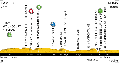 ![]() mercredi 7 juillet 2010 ![]() (Nord) : Cambrai D960 (km 0) - Forenville (km 3) - Seranvillers-Forenville (km 4) - Esnes (km 7) - Walincourt-Selvigny (km 12.5-sprint) - Deheries (km 13.5) - (Aisne) : Serain (km 17) - Premont (km 19.5) - Bohain-en-Vermandois (km 25) - Grougis (près de) (km 32.5) - Aisonville-et-Bernoville (km 33.5) - Longchamps (km 37.5) - Bohéries (km 38.5) - Côte de Vadencourt (km 40.5-GPM4) - Guise (km 42.5) - Flavigny-et-Beaurin (km 49.5-sprint) - Wiege-Faty (km 52) - Rue Guthin (km 55.5) - Le Sourd D26 (km 56) - Richaumont (km 60.5) - Sains-Richaumont (km 61.5) - Housset D946 (km 69-ravitaillement) - Marcy-sous-Marle D58 (km 77) - Marle (km 79) - Autremencourt (près de) D24 (km 84.5) - Pierrepont (km 91) - Missy-les-Pierrepont (près de) (km 94.5) - Gizy (près de) (km 96.5) - Liesse-Notre-Dame (km 97.5) - Marchais (km 100.5) - Le Billon (km 106) - Saint-Erme (km 108) - Amifontaine D52 (km 114.5) - Prouvais (km 120) - Neufchâtel-sur-Aisne (km 126) - (Ardennes) : Brienne-sur-Aisne D925 (km 128.5-sprint) - Poilcourt-Sydney (km 131) - (Marne) : Saint-Etienne-sur-Suippe D274 (km 136) - Bourgogne (km 141) - Betheny D74 (km 148) - entrée Reims (km 149.5) - Reims (km 153.5). ![]() ![]() ![]() Youtube (résumé) ![]() Étape : ![]() 1. Alessandro Petacchi (Ita) en 3h34'55" (moy : 42.854 km/h) 2. Julian Dean (Nzl) 3. Edvald Boasson Hagen (Nor) 4. Robbie McEwen (Aus) 5. Robert Hunter (Afs) 6. Sébastien Turgot (Fra) 7. José Joaquin Rojas (Esp) 8. Daniel Oss (Ita) 9. Thor Hushovd (Nor) 10. Oscar Freire (Esp) 11. Gerald Ciolek (All) 12. Mark Cavendish (Gbr) 13. Brent Bookwalter (Usa) 14. Samuel Sanchez (Esp) 15. Vasil Kiryienka (Blr) 16. Cadel Evans (Aus) 17. Sandy Casar (Fra) 18. Thomas Lövkvist (Sue) 19. Geraint Thomas (Gbr) 20. Carlos Barredo (Esp) 21. Sebastian Lang (All) 22. Bradley Wiggins (Gbr) 23. Tyler Farrar (Usa) 24. Lloyd Mondory (Fra) 25. Stuart O'Grady (Aus) 26. Fabian Cancellara (Sui) 27. Christophe Riblon (Fra) 28. Martin Elmiger (Sui) 29. Jürgen Roelandts (Bel) 30. Kevin De Weert (Bel) 31. Jürgen Van den Broeck (Bel) 33. Roman Kreuziger (Tch) 34. George Hincapie (Usa) 35. Nicolas Roche (Irl) 37. Linus Gerdemann (All) 38. Thomas Rohregger (Aut) 39. Egoi Martinez (Esp) 40. Ruben Perez (Esp) 41. Fabian Wegmann (All) 42. Michael Barry (Can) 43. Christian Knees (All) 44. Tony Martin (All) 45. Johannes Fröhlinger (All) 46. Aliaksandr Kuschynski (Blr) 47. Mark Renshaw (Aus) 48. Simon Gerrans (Aus) 49. Manuel Quinziato (Ita) 50. Gorka Verdugo (Esp) 51. Ivan Basso (Ita) 52. Andreas Klöden (All) 53. Grégory Rast (Sui) 54. Yukiya Arashiro (Jap) 55. Levi Leipheimer (Usa) 56. Imanol Erviti (Esp) 57. Maxime Monfort (Bel) 58. Andy Schleck (Lux) 59. Aitor Perez (Esp) 60. Johan Vansummeren (Bel) 61. Jérôme Pineau (Fra) 62. Alexandre Vinokourov (Kaz) 63. Denis Menchov (Rus) 64. Maarten Tjallingii (Hol) 65. Eduard Vorganov (Rus) 66. Janez Brajkovic (Slo) 67. Bram Tankink (Hol) 68. Sylvain Chavanel (Fra) 69. Julien El Farès (Fra) 70. Jakob Fuglsang (Dan) 71. Daniel Moreno (Esp) 72. Christopher Horner (Usa) 73. Andriy Grivko (Ukr) 74. Luis Leon Sanchez (Esp) 75. Maxim Iglinskiy (Kaz) 76. Arkaitz Duran (Esp) 77. Fabio Felline (Ita) 78. Iban Velasco (Esp) 79. Maarten Wynants (Bel) 80. Joaquin Rodriguez (Esp) 81. Michael Rogers (Aus) 82. Matti Breschel (Dan) 83. José Ivan Gutierrez (Esp) 84. Brett Lancaster (Aus) 85. Vladimir Karpets (Rus) 86. Ruben Plaza (Esp) 87. Damien Monier (Fra) 88. Yaroslav Popovych (Ukr) 89. Christophe Moreau (Fra) 90. Luke Roberts (Aus) 91. Mathieu Ladagnous (Fra) 92. Wesley Sulzberger (Aus) 93. John Gadret (Fra) 94. Christophe Le Mével (Fra) 95. Benoît Vaugrenard (Fra) 96. Ryder Hesjedal (Can) 97. Serge Pauwels (Bel) 98. Anthony Geslin (Fra) 99. Benjamin Noval (Esp) 100. Bert Grabsch (All) 101. Grischa Niermann (All) 102. Alexandr Kolobnev (Rus) 103. Christophe Kern (Fra) 104. Mauro Da Dalto (Ita) 105. Rui Alberto Costa (Por) 106. Sébastien Minard (Fra) 107. Juan Manuel Garate (Esp) 108. Karsten Kroon (Hol) 109. Kristjan Koren (Slo) 110. Kanstantsin Siutsou (Blr) 111. Carlos Sastre (Esp) 112. Pierre Rolland (Fra) 113. Thomas Voeckler (Fra) 114. Rémi Pauriol (Fra) 115. Volodymir Gustov (Ukr) 116. Markus Eibegger (Aut) 117. Iban Mayoz (Esp) 118. Alexandr Pliuschin (Mol) 119. Sergio Miguel Paulinho (Por) 120. Matthieu Sprick (Fra) 121. Damiano Cunego (Ita) 122. Stijn Vandenbergh (Bel) 123. David Millar (Gbr) 124. Juan Antonio Flecha (Esp) 125. Rafael Valls (Esp) 126. Nicolas Vogondy (Fra) 127. Nicki Sørensen (Dan) 128. Dries Devenyns (Bel) 129. Daniel Lloyd (Gbr) 130. Anthony Charteau (Fra) 131. Cyril Gautier (Fra) 132. Rein Taaramäe (Est) 133. David De La Fuente (Esp) 134. Brian Vandborg (Dan) 135. Pavel Brutt (Rus) 136. Steven Cummings (Gbr) 137. Amaël Moinard (Fra) 138. Pierrick Fedrigo (Fra) 139. Serguei Ivanov (Rus) 140. Stéphane Augé (Fra) 141. Paolo Tiralongo (Ita) 142. Martijn Maaskant (Hol) 143. Alessandro Ballan (Ita) 144. Mauro Santambrogio (Ita) 145. José Alberto Benitez (Esp) 146. Chris Anker Sørensen (Dan) 147. Francesco Bellotti (Ita) 148. Francesco Gavazzi (Ita) 149. Rémy Di Gregorio (Fra) 150. Jürgen Van de Walle (Bel) 151. Iñaki Isasi (Esp) 152. Jeremy Hunt (Gbr) 153. Mario Aerts (Bel) 154. Dimitri Champion (Fra) 155. Steve Morabito (Sui) 156. Jérémy Roy (Fra) 157. Kevin Seeldraeyers (Bel) 158. Mathieu Perget (Fra) 159. Juan José Oroz (Esp) 160. Adriano Malori (Ita) 161. Sylwester Szmyd (Pol) 162. Francesco Reda (Ita) 163. Andreas Klier (All) 164. Mirco Lorenzetto (Ita) à 39" 165. Danilo Hondo (All) 166. Simon Spilak (Slo) 167. Roger Kluge (All) à 42" 168. Rinaldo Nocentini (Ita) 169. Samuel Dumoulin (Fra) 170. Charles Wegelius (Gbr) 171. Eros Capecchi (Ita) 172. Matthew Lloyd (Aus) 173. Lars Boom (Hol) à 44" 174. Bernhard Eisel (Aut) à 52" 175. Maxime Bouet (Fra) à 1'34" 176. Jens Voigt (All) à 1'37" 177. Ignatas Konovalovas (Lit) à 1'50" 178. Marcus Burghardt (All) à 2'08" 179. Robert Gesink (Hol