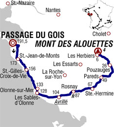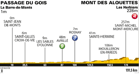 ![]() PASSAGE DU GOIS >MT D.ALOUETTES, 191.5 km samedi 2 juillet 2011 ![]() (Vendée) : Passage du Gois D948 (km 0) - Beauvoir sur Mer (km 2.5) - Saint-Philbert (km 6.5) - Saint- Jean de Monts D38 Bis (km 18) - Orouet D38 (23.5) - Saint Hilaire de Riez D38 Bis (km 30.5) - Saint-Gilles Croix-de-Vie (km 35.5) - Givrand D38 (km 38.5) - La Sauzaie (km 41.5) - Brétignolles sur Mer (km 44.5) - Les Dunes (km 47) - Brem sur Mer (km 48) - Olonne sur Mer (km 58.5) - Les Sables d'Olonne D32 (km 63) - Château d'Olonne D949 (km 65.5) - Talmont Saint-Hilaire (km 75.5) - Le Brandais (km 81) - Avrillé (km 86.5) - Avrillé (km 87-sprint) - Moutiers les Mauxfaits (km 92.5) - Le Champ-Saint-Père D12 (km 100) - Rosnay (km 104-ravitaillement) - Mareuil sur Lay Dissais (km 110) - Moutiers sur le Lay (km 117) - Sainte-Pexine (près de) (km 119) - Le Simon (km 123) - Sainte-Hermine D948 (km 124.5) - Saint-Juire Champgillon D43 (km 129.5) - La Jaudonnière (km 139) - Pareds D106 (142) - Mouilleron en Pareds (km 150.5) - Saint-Germain l'Aiguiller D8 (km 152.5) - Réaumur (km 157.5) - Pouzauges (près de) D752 (km 165) - Le Puy Lambert (km 173.5) - Saint-Michel Mont-Mercure (km 174) - L'Epaud D755 (km 176) - Les Herbiers (km 185) - Mont des Alouettes D160 (km 191.5-GPM4). ![]() ![]() ![]() Vidéo DailyMotion ![]() Étape : ![]() 1. Philippe Gilbert (Bel) en 4h41'31" (moy. 40.815 km/h) 2. Cadel Evans (Aus) à 3" 3. Thor Hushovd (Nor) à 6" 4. José Joaquin Rojas (Esp) 5. Jürgen Van den Broeck (Bel) 6. Geraint Thomas (Gbr) 7. Andreas Klöden (All) 8. Rein Taaramäe (Est) 9. Christopher Horner (Usa) 10. Tony Martin (All) 11. Linus Gerdemann (All) 12. Fränk Schleck (Lux) 13. Peter Velits (Svq) 14. Thomas Voeckler (Fra) 15. Damiano Cunego (Ita) 16. David Millar (Gbr) 17. Alexandre Vinokourov (Kaz) 18. Fabian Cancellara (Sui) 19. Nicolas Roche (Irl) 20. Grega Bole (Slo) 21. Egor Silin (Rus) 22. Maciej Paterski (Pol) 23. Tom Boonen (Bel) 24. Gianni Meersman (Bel) 25. Edvald Boasson Hagen (Nor) 26. Manuel Quinziato (Ita) 27. William Bonnet (Fra) 28. Denis Galimzyanov (Rus) 29. Tejay Van Garderen (Usa) 30. Tony Gallopin (Fra) 31. José Ivan Gutierrez (Esp) 32. Samuel Sanchez (Esp) à 1'20" 33. Bauke Mollema (Hol) 34. Rob Ruijgh (Hol) 36. Luis Leon Sanchez (Esp) 37. Dmitriy Fofonov (Kaz) à 6" 38. Maxime Monfort (Bel) à 1'20" 39. Andy Schleck (Lux) à 6" 40. Jérôme Pineau (Fra) 41. Leonardo Duque (Col) 42. Cyril Gautier (Fra) 43. Anthony Roux (Fra) à 1'20" 44. Danilo Hondo (All) à 6" 45. Levi Leipheimer (Usa) 46. Amaël Moinard (Fra) à 1'20" 47. Janez Brajkovic (Slo) à 6" 48. Pavel Brutt (Rus) 49. Rigoberto Uran (Col) à 1'20" 50. Vladimir Karpets (Rus) à 6" 51. Vladimir Gusev (Rus) 52. Andrey Zeits (Kaz) 53. Ivan Basso (Ita) 54. Dries Devenyns (Bel) à 1'20" 55. Jérémie Galland (Fra) à 6" 56. Kristjan Koren (Slo) à 1'20" 57. Leonardo Bertagnolli (Ita) à 6" 58. Jakob Fuglsang (Dan) 59. Sylvain Chavanel (Fra) 60. Björn Leukemans (Bel) 61. Danny Pate (Usa) à 1'20" 62. Yury Trofimov (Rus) 63. Bradley Wiggins (Gbr) à 6" 64. Stuart O'Grady (Aus) 65. Gorka Verdugo (Esp) à 1'39" 66. Jelle Vanendert (Bel) à 6" 67. Jürgen Roelandts (Bel) 68. Arnold Jeannesson (Fra) à 1'49" 69. Tom Danielson (Usa) à 1'55" 70. Juan Manuel Garate (Esp) 71. Ryder Hesjedal (Can) 72. Christian Knees (All) 73. Beñat Intxausti (Esp) 74. Roman Kreuziger (Tch) 75. Rémy Di Gregorio (Fra) 76. Johnny Hoogerland (Hol) 77. Laurent Mangel (Fra) à 6" 78. Yaroslav Popovych (Ukr) 79. Alexandr Kolobnev (Rus) 80. Francisco José Ventoso (Esp) 81. Julien El Farès (Fra) à 1'55" 82. Kevin De Weert (Bel) à 6" 83. Romain Zingle (Bel) à 1'55" 84. Markel Irizar (Esp) 85. Vladimir Isaichev (Rus) 86. Jérôme Coppel (Fra) 87. Mark Renshaw (Aus) à 6" 88. Imanol Erviti (Esp) à 1'55" 89. Rémi Pauriol (Fra) 90. Anthony Charteau (Fra) 91. Carlos Barredo (Esp) à 6" 92. Nicki Sørensen (Dan) à 1'55" 93. David Moncoutié (Fra) 94. George Hincapie (Usa) à 6" 95. Haimar Zubeldia (Esp) à 1'55" 96. Sébastien Turgot (Fra) à 6" 97. Jean-Christophe Péraud (Fra) à 1'55" 98. Mickaël Delage (Fra) 99. John Gadret (Fra) 100. Wouter Poels (Hol) 101. Pierre Rolland (Fra) 102. Amets Txurruka (Esp) 103. Richie Porte (Aus) 104. Gerald Ciolek (All) 105. Daniel Navarro (Esp) 106. Christophe Kern (Fra) 107. Lars Boom (Hol) 108. Marco Marcato (Ita) à 2'10" 109. Simon Gerrans (Aus) à 2'16" 110. Rui Alberto Costa (Por) à 2'25" 111. Lieuwe Westra (Hol) 112. Maxime Bouet (Fra) 113. Ivan Velasco (Esp) 114. Paolo Tiralongo (Ita) 115. Sergio Miguel Paulinho (Por) 116. Ivan Santaromita (Ita) 117. Andrey Amador (Crc) 118. Hubert Dupont (Fra) 119. Sandy Casar (Fra) 120. Joost Posthuma (Hol) 121. Jérémy Roy (Fra) à 2'33" 122. Alessandro Petacchi (Ita) 123. Adriano Malori (Ita) 124. Fabio Sabatini (Ita) 125. Steve Morabito (Sui) 126. Brent Bookwalter (Usa) 127. Alessandro Vanotti (Ita) 128. Jens Voigt (All) 129. Yohann Gène (Fra) à 2'36" 130. Alan Perez (Esp) 131. Benjamin Noval (Esp) 132. Ruben Perez (Esp) 133. Arthur Vichot (Fra) 134. Juan Antonio Flecha (Esp) 135. Christophe Riblon (Fra) 136. Sebastian Lang (All) à 6" 137. Marcel Sieberg (All) 138. André Greipel (All) 139. Matteo Bono (Ita) à 2'36" 140. Sylwester Szmyd (Pol) 141. David Arroyo (Esp) 142. Daniel Oss (Ita) à 6" 143. Paolo Longo-Borghini (Ita) 144. Vasil Kiryienka (Blr) à 2'51" 145. Mikhail Ignatiev (Rus) à 2'54" 146. David Loosli (Sui) à 3'05" 147. Bernhard Eisel (Aut) à 6" 148. Jesus Hernandez (Esp) à 3'05" 149. Matteo Tosatto (Ita) 150. Michael Schär (Sui) 151. Maciej Bodnar (Pol) 152. Lars Ytting Bak (Dan) à 6" 153. Mark Cavendish (Gbr) 154. Ben Swift (Gbr) 155. Addy Engels (Hol) à 3'05" 156. Ramunas Navardauskas (Lit) à 6" 157. Samuel Dumoulin (Fra) 158. David Zabriskie (Usa) à 3'05" 159. Pablo Urtasun (Esp) 160. Andriy Grivko (Ukr) à 3'19" 161. Jonathan Hivert (Fra) à 3'25" 162. Chris Anker Sørensen (Dan) à 3'28" 163. Brian Vandborg (Dan) 164. Maarten Tjallingii (Hol) 165. Ger