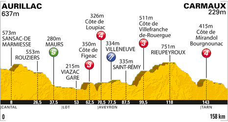 ![]() mardi 12 juillet 2011 ![]() (Cantal) : Aurillac N122 (km 0) - Tronquière (km 1) - La Sablière (km 2.5) - Rouziers (km 26.5) - Quézac (près de) (km 33) - Saint-Étienne-de-Maurs (km 36.5) - Maurs (km 37.5) - (Lot) : Larive (km 43.5) - Bagnac-sur-Célé (km 44.5) - Viazac Gare (km 53) - Figeac (km 58.5) - Côte de Figeac D822 (km 62.5-GPM3) - La Madeleine (km 67.5) - (Aveyron) : Loupiac D922 (km 70.5) - Côte de Loupiac (km 70.5-GPM4) - La Teulière (km 77) - Villeneuve (km 77.5) - Les Encastrades (Foissac) (km 78) - Villeneuve (km 83) - Saint-Rémy (km 87.5) - Farrou (km 89.5) - Villefranche-de-Rouergue (km 94.5) - Côte de Villefranche-de-Rouergue D911 (km 99.5-GPM3) - Rieupeyroux (km 118) - La Palousie D905 (km 122.5) - La Salvetat-Peyralès (km 130) - Le Port de La Besse (km 139) - (Tarn) :Côte de Mirandol-Bourgnounac (km 143) - Mirandol-Bourgnounac (km 143.5) - Almayrac (km 150) - entrée Carmaux D988 (km 154.5) - Carmaux (km 158). ![]() ![]() ![]() Vidéo DailyMotion ![]() Étape : ![]() 1. André Greipel (All) en 3h31'21" (moy. 44.855 km/h) 2. Mark Cavendish (Gbr) 3. José Joaquin Rojas (Esp) 4. Thor Hushovd (Nor) 5. Romain Feillu (Fra) 6. Daniel Oss (Ita) 7. Sébastien Hinault (Fra) 8. Borut Bozic (Slo) 9. Geraint Thomas (Gbr) 10. Samuel Dumoulin (Fra) 11. William Bonnet (Fra) 12. Tomas Vaitkus (Lit) 13. Grega Bole (Slo) 14. Philippe Gilbert (Bel) 15. Edvald Boasson Hagen (Nor) 16. Danilo Hondo (All) 17. Gianni Meersman (Bel) 18. Alan Perez (Esp) 19. Nicolas Roche (Irl) 20. Kevin De Weert (Bel) 21. Jürgen Roelandts (Bel) 22. Jean-Christophe Péraud (Fra) 23. Christophe Riblon (Fra) 24. Cadel Evans (Aus) 25. Jakob Fuglsang (Dan) 26. Cyril Gautier (Fra) 27. Samuel Sanchez (Esp) 28. Rob Ruijgh (Hol) 29. Björn Leukemans (Bel) 30. Vladimir Gusev (Rus) 32. Francisco José Ventoso (Esp) 33. Damiano Cunego (Ita) 34. Tony Martin (All) 35. Fränk Schleck (Lux) 36. Thomas Voeckler (Fra) 37. Rein Taaramäe (Est) 38. Andy Schleck (Lux) 39. Tom Danielson (Usa) 40. Chris Anker Sørensen (Dan) 41. Maciej Paterski (Pol) 42. Luis Leon Sanchez (Esp) 43. George Hincapie (Usa) 44. Grischa Niermann (All) 45. Christian Vandevelde (Usa) 46. Robert Gesink (Hol) 47. Yury Trofimov (Rus) 48. Egoi Martinez (Esp) 49. Peter Velits (Svq) 50. Laurens Ten Dam (Hol) 51. Arnold Jeannesson (Fra) 52. Andrey Zeits (Kaz) 53. Tony Gallopin (Fra) 54. Maxime Monfort (Bel) 55. Linus Gerdemann (All) 56. Jérôme Pineau (Fra) 57. Carlos Barredo (Esp) 58. Jérôme Coppel (Fra) 59. Adriano Malori (Ita) 60. Paolo Tiralongo (Ita) 61. Yannick Talabardon (Fra) 62. Andreas Klöden (All) 63. Vladimir Karpets (Rus) 64. Ivan Basso (Ita) 65. Pierre Rolland (Fra) 66. Maxime Bouet (Fra) 67. Gorka Verdugo (Esp) 68. Sandy Casar (Fra) 69. Haimar Zubeldia (Esp) 70. Levi Leipheimer (Usa) 71. Jens Voigt (All) 72. Rigoberto Uran (Col) 73. Christian Knees (All) 74. Simon Gerrans (Aus) 75. Sergio Miguel Paulinho (Por) 76. Sylvain Chavanel (Fra) 77. David Millar (Gbr) 78. Tejay Van Garderen (Usa) 79. Marcel Sieberg (All) 80. Blel Kadri (Fra) 81. Dries Devenyns (Bel) 82. Jelle Vanendert (Bel) à 22" 83. Xabier Zandio (Esp) à 30" 84. Gorka Izagirre (Esp) à 2'48" 85. Manuel Quinziato (Ita) à 3'02" 86. Matthew Harley Goss (Aus) 87. Fabian Cancellara (Sui) à 5'33" 88. Michael Schär (Sui) 89. Mickaël Buffaz (Fra) 90. Hubert Dupont (Fra) 91. Brent Bookwalter (Usa) 92. Alessandro Vanotti (Ita) 93. Anthony Charteau (Fra) 94. Nicki Sørensen (Dan) 95. Marco Marcato (Ita) 96. Richie Porte (Aus) 97. Juan Antonio Flecha (Esp) 98. Maxim Iglinskiy (Kaz) 99. Stuart O'Grady (Aus) 100. Rémy Di Gregorio (Fra) 101. Sylwester Szmyd (Pol) 102. Mark Renshaw (Aus) 103. Tristan Valentin (Fra) 104. Arnaud Coyot (Fra) 105. Amaël Moinard (Fra) 106. David Moncoutié (Fra) 107. Ramunas Navardauskas (Lit) 108. Pablo Urtasun (Esp) 109. Thomas De Gendt (Bel) à 5'59" 110. Lieuwe Westra (Hol) 111. Johnny Hoogerland (Hol) 112. Maarten Tjallingii (Hol) 113. Joost Posthuma (Hol) 114. José Ivan Gutierrez (Esp) 115. Rui Alberto Costa (Por) 116. Sébastien Minard (Fra) 117. Leonardo Duque (Col) 118. Imanol Erviti (Esp) 119. David Arroyo (Esp) 120. Leonardo Bertagnolli (Ita) 121. Vladimir Isaichev (Rus) 122. Ivan Santaromita (Ita) 123. Denis Galimzyanov (Rus) 124. David Loosli (Sui) 125. Alessandro Petacchi (Ita) 126. Matteo Tosatto (Ita) 127. Matteo Bono (Ita) 128. Romain Zingle (Bel) 129. Markel Irizar (Esp) 130. Fabio Sabatini (Ita) 131. Andriy Grivko (Ukr) 132. Steve Morabito (Sui) 133. Roman Kreuziger (Tch) 134. Paolo Longo-Borghini (Ita) 135. Maciej Bodnar (Pol) 136. Mickaël Delage (Fra) 137. Tyler Farrar (Usa) 138. Arthur Vichot (Fra) 139. Benjamin Noval (Esp) 140. Kristjan Koren (Slo) 141. Gert Steegmans (Bel) 142. Ryder Hesjedal (Can) 143. Ruben Perez (Esp) 144. Jérémy Roy (Fra) 145. Anthony Roux (Fra) 146. Ben Swift (Gbr) 147. Brian Vandborg (Dan) 148. Jérémie Galland (Fra) 149. Dmitriy Fofonov (Kaz) 150. Egor Silin (Rus) 151. Jonathan Hivert (Fra) 152. Danny Pate (Usa) 153. Julian Dean (Nzl) 154. Sebastian Lang (All) 155. Bernhard Eisel (Aut) 156. Addy Engels (Hol) 157. Niki Terpstra (Hol) à 7'00" 158. Gerald Ciolek (All) 159. Perrig Quemeneur (Fra) 160. Anthony Delaplace (Fra) 161. Sébastien Turgot (Fra) 162. Andrey Amador (Crc) 163. Julien El Farès (Fra) 164. Lars Boom (Hol) 165. Laurent Mangel (Fra) 166. Jesus Hernandez (Esp) 167. Denys Kostyuk (Ukr) 168. Mikhail Ignatiev (Rus) 169. Lars Ytting Bak (Dan) 170. Bauke Mollema (Hol) 171. John Gadret (Fra) 172. Jimmy Engoulvent (Fra) 173. Fabrice Jeandesboz (Fra) 174. Daniel Navarro (Esp) 175. Dmitriy Muravyev (Kaz) 176. Yohann Gène (Fra) 177. Vincent Jérôme (Fra) 178. Marcus Burghardt (All) * Alberto Contador est déclassé pour dopage par décision du Tribunal arbitral du sport le 6 février 2012. Non-partants : Alexandr Kolobnev (Rus) * Yaroslav Popovych (Ukr) * Alexandr Kolobnev est mis hors-course pour contrôle anti-dopage positif. Prix de la combativité : Marco Marcato (Ita) Classement gén