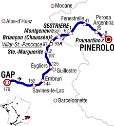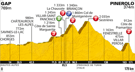 ![]() mercredi 20 juillet 2011 ![]() (Hautes-Alpes) : Gap (km 0) - Pont-Sarrazin (km 1.5) - Chorges (km 14) - Savines-le-Lac (km 26.5) - Crots (km 32) - Embrun (km 34.5) - Châteauroux-les-Alpes N2094 (km 42.5) - Saint-Clément-sur-Durance N94 (km 49.5) - Guillestre (près de) (km 53) -Eygliers Gare (km 54) - Saint-Crépin (km 57) - La Roche-de-Rame (km 63) - L'Argentière-la-Bessée (km 68) - Côte de Sainte-Marguerite (km 71.5-GPM3) - Queyrières (km 73) - Saint-Martin-De-Queyrières D36c (km 75) - Le Villaret D36 (km 78) - Villar-Saint-Pancrace (km 81.5-sprint) - Briançon (km 82.5) - La Chaussée N94 (km 85.5-GPM3) - Briançon (km 87.5-ravitaillement) - La Vachette (km 88.5) - Montgenèvre (km 95.5) - Col de Montgenèvre (km 96.5-GPM2) - (ITALIE) - (Torino) : Claviere (km 98.5) - Cesana Torinese (km 105) - Sestrières (km 112-GPM1) - Champlas du Col (km 113) - Sestrières (km 117) - Traverses (Pragelato) (km 124.5) - Granges (Pragelato) (km 126) - Rivets (Pragelato) (km 127) - Soucheres Hautes (Pragelato) (km 127) - Souchères Basses (Pragelato) (km 130) - Fraisse (km 131.5) - Pourrières (km 133.5) - Fenestrelle (km 138) - Depot (km 140.5) - Mentoulles (km 142.5) - Villaretto (km 144) - Balma (km 147) - Roreto (km 147.5) - Castel del Bosco (km 148.5) - Meano (km 151) - Brandoneugna (km 152.5) - Perosa Argentina (km 153.5) - Villar Perosas R23 (km 163) - Côte de Pramartino Vc (km 171-GPM2) - San Pietro Val Lemina (km 173.5) - entrée Pinerolo Sp167 (km 177.5) - Pinerolo (km 179). ![]() ![]() ![]() 169 partants Météo : beau temps - Le début d'étape est très rapide (51.3 km/h de moyenne dans la première heure). Les premières échappées ne se réalisent qu'à partir du km 54 : Boasson Hagen, R. Perez, Tjallingii, Fofonov, Amador, Muravyev, Casar, El Farès, Leukemans & Hivert. Au km 58, ils sont rejoints par Mollema, Chavanel, Bozic et Patersky. 14 coureurs en tête. - L'écart entre les 14 et le peloton atteint 7'10" au pied de la montée de Montgenèvre. Roche sort en contre avec De Weert et Hoogerland. - Au km 115, environ 2 km avant le sommet de la montée de Sestrières, Ruben Perez part seul. Ilpasse en tête au sommet avec 1'05" d'avance sur ses anciens compagnons d'échappée et pratiquement 8' sur le peloton. Son avance va monter à 1'30" mais il sera repris au bas de la côte de Pramartino. - Chavanel tente de partir mais il est rejoint et débordé par Boasson Hagen à 11.5 km du but. Le Norvégien passe seul en tête suivi par Hivert et Mollema. Le peloton du maillot jaune n'a plus qu'une vingtaine de coureurs. Hivert chute une première fois dans la descente puis fait un tout-droit. Pendant ce temps, dans l'ascension, Contador a tenté une attaque vite maitrisée par Schleck et le reste du groupe. - Boasson Hagen file vers la victoire. Le maillot jaune Voeckler descend en tête, rate le même virage qu'Hivert et perd le contact avec son groupe. Contador et S. Sanchez tentent de filer dans le bas de la descente mais ils sont repris à moins d'un kilomètre du but par Scheck. Boasson gagne. Schleck et Contador termine derrière les échappés du jour. Voeckler et Basso leur concèdent 27". Thomas Voeckler reste maillot jaune. Source : journal "l'Equipe" du jeudi 21 juillet 2011. Vidéo DailyMotion ![]() Étape : ![]() 1. Edvald Boasson Hagen (Nor) en 4h18'00" (moy. 41.628 km/h) 2. Bauke Mollema (Hol) à 40" 3. Sandy Casar (Fra) à 50" 4. Julien El Farès (Fra) 5. Sylvain Chavanel (Fra) 6. Dmitriy Fofonov (Kaz) à 1'10" 7. Maciej Paterski (Pol) 8. Dmitriy Muravyev (Kaz) 9. Jonathan Hivert (Fra) à 1'15" 10. Borut Bozic (Slo) à 2'20" 11. Andrey Amador (Crc) 12. Ruben Perez (Esp) à 2'37" 13. Björn Leukemans (Bel) à 3'35" 14. Nicolas Roche (Irl) à 4'00" 15. Maarten Tjallingii (Hol) 16. Kevin De Weert (Bel) 17. Fränk Schleck (Lux) à 4'26" 18. Damiano Cunego (Ita) 19. Samuel Sanchez (Esp) 20. Cadel Evans (Aus) 21. Jean-Christophe Péraud (Fra) 23. Rein Taaramäe (Est) 24. Andy Schleck (Lux) 25. Jelle Vanendert (Bel) 26. Jérôme Coppel (Fra) à 4'34" 27. Rigoberto Uran (Col) 28. Thomas Voeckler (Fra) à 4'53" 29. Haimar Zubeldia (Esp) 30. Tom Danielson (Usa) 31. Ivan Basso (Ita) 32. Christian Vandevelde (Usa) à 5'03" 33. Pierre Rolland (Fra) 34. Arnold Jeannesson (Fra) à 5'40" 35. Hubert Dupont (Fra) à 5'56" 36. Vladimir Karpets (Rus) 37. Andrey Zeits (Kaz) 38. Vladimir Gusev (Rus) 39. Egoi Martinez (Esp) 40. Gorka Verdugo (Esp) 41. Maxime Monfort (Bel) 42. Ivan Santaromita (Ita) 43. Johnny Hoogerland (Hol) 44. Ryder Hesjedal (Can) à 6'26" 45. Xabier Zandio (Esp) 46. Philippe Gilbert (Bel) 47. Yury Trofimov (Rus) à 6'47" 48. Rob Ruijgh (Hol) à 6'58" 49. Peter Velits (Svq) 50. Chris Anker Sørensen (Dan) 51. Yannick Talabardon (Fra) 52. Tony Gallopin (Fra) à 8'27" 53. Anthony Roux (Fra) 54. Markel Irizar (Esp) à 8'31" 55. Jens Voigt (All) à 8'51" 56. Fabrice Jeandesboz (Fra) à 9'57" 57. Sylwester Szmyd (Pol) à 10'42" 58. Roman Kreuziger (Tch) à 12'36" 59. Daniel Oss (Ita) 60. Jakob Fuglsang (Dan) 61. George Hincapie (Usa) 62. Kristjan Koren (Slo) 63. José Joaquin Rojas (Esp) 64. Richie Porte (Aus) 65. Vincent Jérôme (Fra) 66. Cyril Gautier (Fra) 67. Leonardo Duque (Col) 68. Daniel Navarro (Esp) 69. Anthony Delaplace (Fra) 70. Geraint Thomas (Gbr) 71. Danilo Hondo (All) 72. Alessandro Petacchi (Ita) 73. Steve Morabito (Sui) 74. Amaël Moinard (Fra) 75. David Loosli (Sui) 76. Marco Marcato (Ita) 77. Thomas De Gendt (Bel) à 14'15" 78. Gianni Meersman (Bel) 79. Maxime Bouet (Fra) 80. Sébastien Turgot (Fra) 81.. Robert Gesink (Hol) 82. Grischa Niermann (All) 83. Simon Gerrans (Aus) 84. Christian Knees (All) 85. Gerald Ciolek (All) 86. Marcus Burghardt (All) 87. André Greipel (All) 88. Sebastian Lang (All) 89. Joost Posthuma (Hol) 90. Francisco José Ventoso (Esp) 91. Nicki Sörensen (Dan) 92. Matteo Bono (Ita) 93. Marcel Sieberg (All) 94. Paolo Longo-Borghini (Ita) 95. Linus Gerdemann (All) 96. Maciej Bodnar (Pol) 97. Michael Schär (Sui) 98. Fabio Sabat