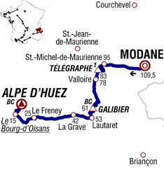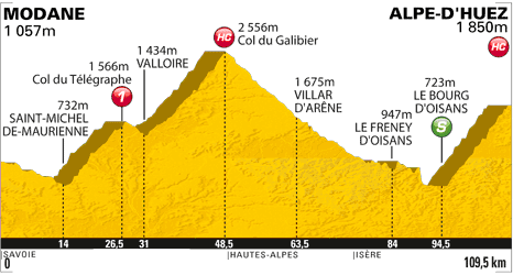 ![]() vendredi 22 juillet 2011 ![]() (Savoie) : Modane (km 0) - Freney (km 1.5) - Saint-Michel-de-Maurienne (km 14) - Saint-Martin-d'Arc (km 15) - Les Petites Seignères (km 17) - Col du Télégraphe (km 26.5-GPM1) - Valloire (km 31) - Les Verneys (km 33.5) - Col du Galibier (km 48.5-GPM HC) - (Hautes-Alpes) : Villar-d'Arêne D1091 (km 63.5) - La Grave (km 67) - (Isère) : Le Chambon (km 82) - Le Freney-d'Oisans (km 84) - La Rivoire (km 88) - Le Clapier (km 90.5) - Les Alberges (km 91) - Le Vernis (km 92.5) - Le Bourg-d'Oisans (km 94.5) - La Garde D211 (km 98) - Huez (km 103.5) - Alpe d'Huez (km 109.5-GPM HC) ![]() ![]() ![]() Vidéo DailyMotion ![]() Étape : ![]() 1. Pierre Rolland (Fra) en 3h13'25" (moy. 33.968 km/h) 2. Samuel Sanchez (Esp) à 14" 4. Peter Velits (Svq) à 57" 5. Cadel Evans (Aus) 6. Thomas De Gendt (Bel) 7. Damiano Cunego (Ita) 8. Fränk Schleck (Lux) 9. Andy Schleck (Lux) 10. Ryder Hesjedal (Can) à 1'15" 11. Tom Danielson (Usa) 12. Jean-Christophe Péraud (Fra) à 1'27" 13. Hubert Dupont (Fra) à 2'06" 14. Rein Taaramäe (Est) 15. Ivan Basso (Ita) 16. Levi Leipheimer (Usa) 17. Jérôme Coppel (Fra) à 2'31" 18. Kevin De Weert (Bel) à 2'46" 19. Christian Vandevelde (Usa) à 3'22" 20. Thomas Voeckler (Fra) 21. Yury Trofimov (Rus) 22. Arnold Jeannesson (Fra) 23. Carlos Barredo (Esp) à 3'34" 24. Blel Kadri (Fra) à 3'47" 25. Rémy Di Gregorio (Fra) à 4'26" 26. Jesus Hernandez (Esp) à 4'52" 27. Bauke Mollema (Hol) à 5'19" 28. Christian Knees (All) 29. Sébastien Minard (Fra) 30. David Loosli (Sui) à 5'41" 31. Sandy Casar (Fra) à 5'49" 32. Gianni Meersman (Bel) 33. Egoi Martinez (Esp) 34. Jakob Fuglsang (Dan) 35. Jonathan Hivert (Fra) à 6'47" 36. Gorka Verdugo (Esp) à 7'13" 37. Simon Gerrans (Aus) à 7'40" 38. Laurens Ten Dam (Hol) à 8'13" 39. Sylvain Chavanel (Fra) à 8'45" 40. Gorka Izagirre (Esp) 41. Sylwester Szmyd (Pol) à 9'47" 42. David Moncoutié (Fra) 43. David Arroyo (Esp) 44. Geraint Thomas (Gbr) 45. Rob Ruijgh (Hol) à 10'32" 46. Julien El Farès (Fra) à 10'57" 47. Robert Gesink (Hol) à 10'59" 48. Rui Alberto Costa (Por) à 12'25" 49. Haimar Zubeldia (Esp) à 12'28" 50. Luis Leon Sanchez (Esp) à 12'38" 51. Maxime Bouet (Fra) à 12'44" 52. Chris Anker Sørensen (Dan) 53. Anthony Roux (Fra) 54. Christophe Riblon (Fra) 55. Richie Porte (Aus) 56. Kristjan Koren (Slo) 57. Vladimir Gusev (Rus) à 12'57" 58. Niki Terpstra (Hol) à 13'04" 59. Jens Voigt (All) à 13'06" 60. Anthony Charteau (Fra) à 13'55" 61. Perrig Quemeneur (Fra) 62. Cyril Gautier (Fra) 63. Vincent Jérôme (Fra) 64. Stuart O'Grady (Aus) 65. Amaël Moinard (Fra) 66. Matteo Bono (Ita) 67. Jérémy Roy (Fra) à 13'58" 68. Johnny Hoogerland (Hol) à 15'30" 69. Pablo Urtasun (Esp) à 15'35" 70. Philippe Gilbert (Bel) à 16'06" 71. Jelle Vanendert (Bel) 72. Grischa Niermann (All) 73. Juan Antonio Flecha (Esp) à 17'40" 74. Maxime Monfort (Bel) 75. Maciej Bodnar (Pol) 76. Maciej Paterski (Pol) 77. George Hincapie (Usa) 78. Edvald Boasson Hagen (Nor) 79. Steve Morabito (Sui) 80. Linus Gerdemann (All) 81. Fabrice Jeandesboz (Fra) 82. Jérôme Pineau (Fra) à 17'45" 83. Leonardo Duque (Col) à 19'07" 84. Sergio Miguel Paulinho (Por) à 20'57" 85. José Ivan Gutierrez (Esp) à 25'27" ** 86. Mickaël Delage (Fra) 87. Marco Marcato (Ita) 88. Sebastian Lang (All) 89. Grega Bole (Slo) 90. Alessandro Petacchi (Ita) 91. José Joaquin Rojas (Esp) 92. Thor Hushovd (Nor) 93. André Greipel (All) 94. Sébastien Turgot (Fra) 95. Imanol Erviti (Esp) 96. Marcel Sieberg (All) 97. Bernhard Eisel (Aut) 98. Mark Cavendish (Gbr) 99. Nicolas Roche (Irl) 100. Manuel Quinziato (Ita) 101. Tristan Valentin (Fra) 102. Joost Posthuma (Hol) 103. Mark Renshaw (Aus) 104. Arnaud Coyot (Fra) 105. Alan Perez (Esp) 106. Ruben Perez (Esp) 107. Matthew Harley Goss (Aus) 108. Ben Swift (Gbr) 109. Daniel Navarro (Esp) 110. Romain Zingle (Bel) 111. Dmitriy Fofonov (Kaz) 112. Matteo Tosatto (Ita) 113. Benjamin Noval (Esp) 114. Michael Schär (Sui) 115. Jürgen Roelandts (Bel) 116. Sébastien Hinault (Fra) 117. Brent Bookwalter (Usa) 118. Andriy Grivko (Ukr) 119. Laurent Mangel (Fra) 120. Daniel Oss (Ita) 121. Addy Engels (Hol) 122. Tejay Van Garderen (Usa) 123. Paolo Longo-Borghini (Ita) 124. Xabier Zandio (Esp) 125. Andrey Zeits (Kaz) 126. Arthur Vichot (Fra) 127. Mikhail Ignatiev (Rus) 128. Yannick Talabardon (Fra) 129. Nicki Sørensen (Dan) 130. Anthony Delaplace (Fra) 131. Adriano Malori (Ita) 132. Roman Kreuziger (Tch) 133. Lieuwe Westra (Hol) 134. Tomas Vaitkus (Lit) 135. Danilo Hondo (All) 136. Samuel Dumoulin (Fra) 137. Ivan Santaromita (Ita) 138. Rigoberto Uran (Col) 139. Lars Ytting Bak (Dan) 140. Markel Irizar (Esp) 141. Egor Silin (Rus) 142. Jérémie Galland (Fra) 143. Mickaël Buffaz (Fra) 144. Ramunas Navardauskas (Lit) 145. Marcus Burghardt (All) 146. Fabio Sabatini (Ita) 147. Dmitriy Muravyev (Kaz) 148. Jimmy Engoulvent (Fra) 149. Vladimir Karpets (Rus) 150. Tony Gallopin (Fra) 151. Denys Kostyuk (Ukr) 152. Fabian Cancellara (Sui) 153. Yohann Gène (Fra) 154. Tyler Farrar (Usa) 155. Maxim Iglinskiy (Kaz) 156. Brian Vandborg (Dan) 157. Andrey Amador (Crc) 158. Gerald Ciolek (All) 159. Dries Devenyns (Bel) 160. Maarten Tjallingii (Hol) 161. Francisco José Ventoso (Esp) 162. Borut Bozic (Slo) 163. Tony Martin (All) 164. Alessandro Vanotti (Ita) 165. Julian Dean (Nzl) 166. Danny Pate (Usa) 167. David Millar (Gbr) * Alberto Contador est déclassé pour dopage par décision du Tribunal arbitral du sport le 6 février 2012. ** Les coureurs arrivés à partir de la 85ème place sont hors-délais puis repêchés par le jury des commissaires à l'exception de Björn Leukemans. Hors-délais : Björn Leukemans (Bel) à 33'23" Prix de la combativité : Classement général : 2. Fränk Schleck (Lux) à 53" 3. Cadel Evans (Aus) à 57" 4. Thomas Voeckler (Fra) à 2'10" 5. Damiano Cunego (Ita) à 3'31" 7. Samuel Sanchez (Esp) à 4'22" 8. Ivan Basso (Ita) à 4'40" 9. Tom Danielson (Usa) à 7'11" 10. Pierre Rolland (Fra) à 8'57" 11. 