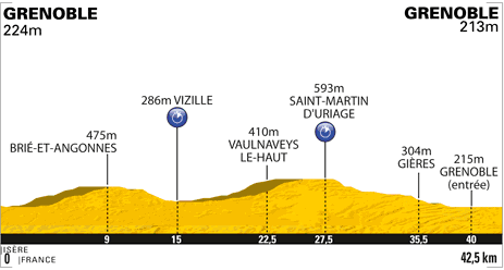 ![]() samedi 23 juillet 2011 ![]() (Isère) : Grenoble D5 (km 0) - Eybens (km 2.5) - Le Ruisselet (km 6) - Tavernolles (km 6.5) - Brié-et-Angonnes (km 9) - Vizille (km 14) - Les Corniers (km 16.5) - Maison Blanche (km 20) - Vaulnaveys-le-Haut (km 20.5) - Vaulnaveys-Le-Haut D111 (km 22.5) - Belmont (km 24) - Le Bouloud (km 26) - Saint-Martin-d'Uriage (km 27.5) - Uriage-les-Bains (km 30) - Le Sonnant d'Uriage (km 32) - Gières (km 35.5) - Saint-Martin-d'Hères (km 37.5) - Grenoble (entrée) (km 40) - Grenoble (km 42.5). ![]() ![]() ![]() Vidéo DailyMotion ![]() Étape : ![]() 1. Tony Martin (All) en 55'33" (moy. 45.905 km/h) 2. Cadel Evans (Aus) à 7" 4. Thomas De Gendt (Bel) à 1'29" 5. Richie Porte (Aus) à 1'30" 6. Jean-Christophe Péraud (Fra) à 1'33" 7. Samuel Sanchez (Esp) à 1'37" 8. Fabian Cancellara (Sui) à 1'42" 9. Peter Velits (Svq) à 2'03" 10. Rein Taaramäe (Est) 11. Tom Danielson (Usa) à 2'08" 12. Edvald Boasson Hagen (Nor) à 2'10" 13. Thomas Voeckler (Fra) à 2'14" 14. Maxime Monfort (Bel) à 2'36" 15. Kristjan Koren (Slo) 16. Adriano Malori (Ita) à 2'38" 17. Andy Schleck (Lux) 18. Lieuwe Westra (Hol) à 2'39" 19. Christophe Riblon (Fra) 20. Fränk Schleck (Lux) à 2'41" 21. Pierre Rolland (Fra) à 2'50" 22. Jérôme Coppel (Fra) à 2'51" 23. Jürgen Roelandts (Bel) à 2'57" 24. Carlos Barredo (Esp) à 2'58" 25. Christian Vandevelde (Usa) à 3'00" 26. Sandy Casar (Fra) à 3'03" 27. Jérémy Roy (Fra) à 3'23" 28. Sylvain Chavanel (Fra) à 3'28" 29. Danny Pate (Usa) à 3'30" 30. Vladimir Karpets (Rus) à 3'36" 31. Damiano Cunego (Ita) à 3'38" 32. David Millar (Gbr) à 3'41" 33. Maciej Bodnar (Pol) à 3'43" 34. Ivan Basso (Ita) à 3'47" 35. Nicki Sørensen (Dan) à 3'51" 36. Lars Ytting Bak (Dan) à 3'57" 37. Chris Anker Sørensen (Dan) à 3'58" 38. Maxime Bouet (Fra) à 3'59" 39. Robert Gesink (Hol) à 4'01" 40. Maarten Tjallingii (Hol) à 4'07" 41. Haimar Zubeldia (Esp) à 4'10" 42. Gorka Verdugo (Esp) à 4'13" 43. Markel Irizar (Esp) à 4'18" 44. Juan Antonio Flecha (Esp) à 4'20" 45. Christian Knees (All) à 4'23" 46. Geraint Thomas (Gbr) à 4'24" 47. Anthony Delaplace (Fra) à 4'30" 48. Daniel Oss (Ita) à 4'35" 49. Dmitriy Muravyev (Kaz) à 4'36" 50. Kevin De Weert (Bel) à 4'38" 51. Rui Alberto Costa (Por) à 4'39" 52. Arnold Jeannesson (Fra) à 4'42" 53. Rob Ruijgh (Hol) à 4'43" 54. Jelle Vanendert (Bel) à 4'44" 55. Stuart O'Grady (Aus) 56. Mikhail Ignatiev (Rus) à 4'46" 57. Ramunas Navardauskas (Lit) à 4'48" 58. George Hincapie (Usa) à 4'49" 59. Anthony Charteau (Fra) à 4'52" 60. Jérôme Pineau (Fra) 61. Xabier Zandio (Esp) à 4'54" 62. Ryder Hesjedal (Can) à 4'56" 63. Tony Gallopin (Fra) à 5'00" 64. Cyril Gautier (Fra) à 5'01" 65. Andrey Zeits (Kaz) à 5'05" 66. Egoi Martinez (Esp) à 5'09" 67. Tejay Van Garderen (Usa) à 5'11" 68. Hubert Dupont (Fra) à 5'12" 69. Jakob Fuglsang (Dan) à 5'15" 70. Michael Schär (Sui) à 5'16" 71. Luis Leon Sanchez (Esp) 72. Philippe Gilbert (Bel) à 5'19" 73. Julien El Farès (Fra) à 5'20" 74. Sébastien Minard (Fra) à 5'26" 75. Grischa Niermann (All) à 5'27" 76. Yury Trofimov (Rus) à 5'30" 77. Sylwester Szmyd (Pol) à 5'35" 78. Levi Leipheimer (Usa) à 5'38" 79. Sergio Miguel Paulinho (Por) à 5'42" 80. Perrig Quemeneur (Fra) à 5'43" 81. Vladimir Gusev (Rus) à 5'46" 82. Ivan Santaromita (Ita) 83. Tomas Vaitkus (Lit) à 5'47" 84. Matthew Harley Goss (Aus) à 5'48" 85. Brent Bookwalter (Usa) à 5'51" 86. Maciej Paterski (Pol) à 5'52" 87. David Loosli (Sui) à 5'53" 88. Anthony Roux (Fra) à 5'54" 89. Gianni Meersman (Bel) 90. Linus Gerdemann (All) à 5'56" 91. José Joaquin Rojas (Esp) à 5'57" 92. Sebastian Lang (All) à 6'01" 93. Yannick Talabardon (Fra) à 6'02" 94. Simon Gerrans (Aus) à 6'03" 95. Romain Zingle (Bel) à 6'05" 96. Rémy Di Gregorio (Fra) à 6'07" 97. Dries Devenyns (Bel) à 6'08" 98. Vincent Jérôme (Fra) 99. Roman Kreuziger (Tch) à 6'10" 100. Grega Bole (Slo) à 6'11" 101. Daniel Navarro (Esp) à 6'14" 102. David Arroyo (Esp) 103. Sébastien Turgot (Fra) à 6'15" 104. Imanol Erviti (Esp) à 6'18" 105. Thor Hushovd (Nor) à 6'19" 106. Fabrice Jeandesboz (Fra) à 6'21" 107. Egor Silin (Rus) à 6'23" 108. Johnny Hoogerland (Hol) 109. David Moncoutié (Fra) à 6'25" 110. Gorka Izagirre (Esp) 111. Steve Morabito (Sui) à 6'28" 112. Sébastien Hinault (Fra) 113. Marco Marcato (Ita) à 6'29" 114. Nicolas Roche (Irl) 115. Manuel Quinziato (Ita) à 6'30" 116. Jesus Hernandez (Esp) à 6'32" 117. José Ivan Gutierrez (Esp) à 6'34" 118. Joost Posthuma (Hol) à 6'36" 119. Paolo Longo-Borghini (Ita) à 6'45" 120. Arnaud Coyot (Fra) à 6'47" 121. Amaël Moinard (Fra) à 6'50" 122. Rigoberto Uran (Col) à 6'51" 123. Andriy Grivko (Ukr) à 6'54" 124. Laurens Ten Dam (Hol) à 6'56" 125. Alessandro Petacchi (Ita) 126. Jonathan Hivert (Fra) à 7'04" 127. Ruben Perez (Esp) à 7'08" 128. Marcus Burghardt (All) à 7'09" 129. Andrey Amador (Crc) 130. Ben Swift (Gbr) à 7'14" 131. Samuel Dumoulin (Fra) à 7'19" 132. Julian Dean (Nzl) à 7'22" 133. Jimmy Engoulvent (Fra) à 7'24" 134. Yohann Gène (Fra) à 7'28" 135. Blel Kadri (Fra) à 7'30" 136. Alan Perez (Esp) à 7'31" 137. Marcel Sieberg (All) à 7'36" 138. Addy Engels (Hol) à 7'39" 139. André Greipel (All) 140. Danilo Hondo (All) 141. Tristan Valentin (Fra) à 7'41" 142. Tyler Farrar (Usa) à 7'44" 143. Mickaël Delage (Fra) à 7'53" 144. Bauke Mollema (Hol) à 7'54" 145. Francisco José Ventoso (Esp) à 7'55" 146. Laurent Mangel (Fra) 147. Gerald Ciolek (All) à 8'07" 148. Arthur Vichot (Fra) à 8'09" 149. Fabio Sabatini (Ita) à 8'11" 150. Bernhard Eisel (Aut) 151. Matteo Tosatto (Ita) à 8'16" 152. Pablo Urtasun (Esp) à 8'19" 153. Mark Renshaw (Aus) à 8'26" 154. Brian Vandborg (Dan) à 8'27" 155. Matteo Bono (Ita) à 8'32" 156. Mark Cavendish (Gbr) à 8'35" 157. Jens Voigt (All) à 8'37" 158. Alessandro Vanotti (Ita) à 8'44" 159. Dmitriy Fofonov (Kaz) à 8'46" 160. Denys Kostyuk (Ukr) à 9'03" 161. Mickaël Buffaz (Fra) à 9'17" 162. Benjamin Nov