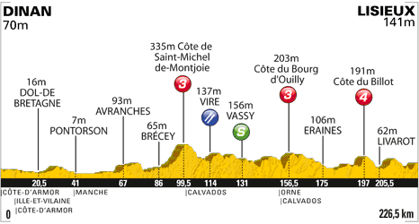 ![]() jeudi 7 juillet 2011 ![]() (Côtes-d'Armor) : Dinan (km 0) - Saint-Piat (km 1.5) - La Ganterie (km 4) - (Ille-et-Vilaine) : Plerguer D676 (km 14) - Vildé-Bidon (km 17) - Dol-de-Bretagne (km 20.5) - Baguer-Pican D576 (km 26) - Sains D576 (km 36.5) - Mont Rouault (km 38) - Ville Chérel (km 40) - (Manche) : Pontorson D75 (km 41) - Beauvoir D976 (km 46.5) - Le Mont-Saint-Michel (km 49) - Ardevon/Quartier de la Rive D275 (km 50.5) - Bas-Courtils D75 (km 55) - Courtils D43 (km 57) - Céaux D113 (km 59) - Pontaubault (km 165) - Avranches (km 67) - Saint-Senier-sous-Avranches D5 (km 69.5) - Tirepied (km 79) - Vernix D911 (km 82) - Brécey (km 86) - Saint-Laurent-de-Cuves D39 (km 91) - Saint-Pois (km 95.5) - Saint-Michel-de-Montjoie (km 99) - Côte de Saint-Michel de Montjoie (km 99.5-GPM3) - (Calvados) : Champ-du-Boult D150 (km 103) - Vire (km 114-ravitaillement) - Vaudry D512 (km 117.5) - Viessoix (km 121.5) - Vassy (km 131) - Saint-Germain-du-Crioult (km 136) - Condé-sur-Noireau (km 138.5) - Saint-Denis-de-Méré D562 (km 143.5) - Saint-Marc d'Ouilly D1 (km 151) - (Orne) : Les Planches (km 152) - (Calvados) : Pont-d'Ouilly D511 (km 153) - Le Bourg d'Ouilly (km 156) - Côte du Bourg d'Ouilly (km 156.5-GPM3) - Pierrepont (km 161.5) - La Corbetière (km 164.5) - Falaise (km 170) - Eraines D39 (km 175) - Damblainville (km 178) - La gare de Couliboeuf (km 180) - Morteaux-Couliboeuf D39 B (km 181) - Barou-en-Auge (km 184) - Amméville D39 (km 191) - Le Billot (km 197) - Côte du Billot (km 197-GPM4) - Heurtevent D38 (km 202) - Quartier de l'Eglise (km 204) - Le Mesnil-Bacley D4 (km 205) - Livarot (km 205.5) - Le Pot Blanc (Saint-Germain-de-Livet) D579 (km 213) - Saint-Martin-de-la-Lieue (km 219) - entrée Lisieux (km 221.5) - D267 Lisieux (km 226.5). ![]() ![]() ![]() Vidéo DailyMotion ![]() Étape : ![]() 1. Edvald Boasson Hagen (Nor) en 5h13'37" (moy. 43.333 km/h) 2. Matthew Harley Goss (Aus) 3. Thor Hushovd (Nor) 4. Romain Feillu (Fra) 5. José Joaquin Rojas (Esp) 6. Arthur Vichot (Fra) 7. Philippe Gilbert (Bel) 8. Gerald Ciolek (All) 9. Marco Marcato (Ita) 10. Arnold Jeannesson (Fra) 11. Jakob Fuglsang (Dan) 12. Cadel Evans (Aus) 13. Julien El Farès (Fra) 14. Sébastien Hinault (Fra) 15. Andreas Klöden (All) 16. Geraint Thomas (Gbr) 17. Borut Bozic (Slo) 18. Samuel Dumoulin (Fra) 19. Cyril Gautier (Fra) 20. Linus Gerdemann (All) 21. Nicolas Roche (Irl) 22. Alexandre Vinokourov (Kaz) 23. Rob Ruijgh (Hol) 24. Egoi Martinez (Esp) 25. Maxime Bouet (Fra) 26. Tony Martin (All) 27. Christopher Horner (Usa) 28. Samuel Sanchez (Esp) 29. Jean-Christophe Péraud (Fra) 30. Jürgen Van den Broeck (Bel) 31. Grega Bole (Slo) 32. Andy Schleck (Lux) 33. Tom Danielson (Usa) 34. Romain Zingle (Bel) 35. Kevin De Weert (Bel) 36. Ryder Hesjedal (Can) 37. Dries Devenyns (Bel) 38. Maxime Monfort (Bel) 39. Bauke Mollema (Hol) 40. Fränk Schleck (Lux) 41. Damiano Cunego (Ita) 42. Roman Kreuziger (Tch) 43. Rigoberto Uran (Col) 44. Jérôme Coppel (Fra) 45. George Hincapie (Usa) 46. Jérôme Pineau (Fra) 47. David Millar (Gbr) 49. Christian Vandevelde (Usa) 50. Ivan Basso (Ita) 51. Peter Velits (Svq) 52. Carlos Barredo (Esp) 53. Robert Gesink (Hol) 54. Haimar Zubeldia (Esp) 55. Vladimir Karpets (Rus) 56. Bradley Wiggins (Gbr) 57. Egor Silin (Rus) 58. Gorka Verdugo (Esp) 59. Yury Trofimov (Rus) 60. Alexandr Kolobnev (Rus) 61. Juan Antonio Flecha (Esp) 62. Thomas Voeckler (Fra) 63. Pierre Rolland (Fra) à 23" 64. Sandy Casar (Fra) 65. Rui Alberto Costa (Por) à 26" 66. Luis Leon Sanchez (Esp) 67. Laurens Ten Dam (Hol) 68. Rein Taaramäe (Est) à 28" 69. Vladimir Gusev (Rus) à 30" 70. Wouter Poels (Hol) 71. Anthony Charteau (Fra) à 48" 72. Ruben Perez (Esp) 73. Rémi Pauriol (Fra) 74. Dmitriy Fofonov (Kaz) 75. Björn Leukemans (Bel) 76. Maarten Tjallingii (Hol) 77. Sébastien Turgot (Fra) 78. Tomas Vaitkus (Lit) 79. José Ivan Gutierrez (Esp) 80. Kristjan Koren (Slo) 81. Amets Txurruka (Esp) 82. David Moncoutié (Fra) 83. Pavel Brutt (Rus) 84. Tristan Valentin (Fra) 85. Tony Gallopin (Fra) 86. Yannick Talabardon (Fra) 87. Leonardo Duque (Col) 88. Alessandro Petacchi (Ita) 89. Jonathan Hivert (Fra) 90. David Loosli (Sui) 91. Levi Leipheimer (Usa) à 1'05" 92. Jelle Vanendert (Bel) 93. John Gadret (Fra) 94. Maxim Iglinskiy (Kaz) 95. Johnny Hoogerland (Hol) 96. Anthony Delaplace (Fra) 97. Andrey Zeits (Kaz) à 1'34" 98. Daniel Oss (Ita) 99. Christian Knees (All) à 1'44" 100. Alessandro Vanotti (Ita) 101. Mark Cavendish (Gbr) 102. Paolo Longo-Borghini (Ita) 103. Simon Gerrans (Aus) 104. Rémy Di Gregorio (Fra) 105. Maciej Paterski (Pol) 106. Ben Swift (Gbr) 107. Gianni Meersman (Bel) 108. Mickaël Delage (Fra) 109. Nicki Sørensen (Dan) 110. Adriano Malori (Ita) 111. Arnaud Coyot (Fra) 112. Sébastien Minard (Fra) 113. William Bonnet (Fra) 114. Anthony Roux (Fra) 115. Denis Galimzyanov (Rus) 116. Thomas De Gendt (Bel) à 2'00" 117. Jérémie Galland (Fra) à 2'23" 118. Sebastian Lang (All) 119. Matteo Tosatto (Ita) 120. Fabian Cancellara (Sui) 121. Benjamin Noval (Esp) 122. Francisco José Ventoso (Esp) 123. Jürgen Roelandts (Bel) 124. Tyler Farrar (Usa) 125. Michael Schär (Sui) 126. Brent Bookwalter (Usa) 127. Mikhail Ignatiev (Rus) 128. Daniel Navarro (Esp) 129. Matteo Bono (Ita) 130. Maciej Bodnar (Pol) 131. Danilo Hondo (All) 132. Juan Manuel Garate (Esp) 133. Lars Boom (Hol) 134. Tejay Van Garderen (Usa) 135. Denys Kostyuk (Ukr) 136. Amaël Moinard (Fra) 137. Imanol Erviti (Esp) 138. David Arroyo (Esp) 139. Leonardo Bertagnolli (Ita) 140. Niki Terpstra (Hol) 141. Alan Perez (Esp) 142. Gorka Izagirre (Esp) 143. Julian Dean (Nzl) 144. Steve Morabito (Sui) 145. Christophe Riblon (Fra) 146. Hubert Dupont (Fra) 147. Fabrice Jeandesboz (Fra) 148. Andriy Grivko (Ukr) 149. Ramunas Navardauskas (Lit) 150. Danny Pate (Usa) 151. Joost Posthuma (Hol) 152. Manuel Quinziato (Ita) 153. Brian Vandborg (Dan) 154. Yohann Gène (Fra) 155. Tom Boonen (Bel) 156. Markel Irizar (Esp) 157. Stuart O'Grady (Aus) 158. Yaroslav Popovyc