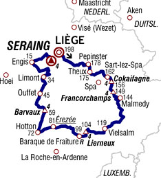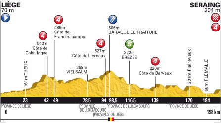 ![]() dimanche 1er juillet 2012 ![]() (BELGIQUE) - (Liège) : Liège (km 0) - Vaux-sous-Chèvremont (km 1.5) - Chaudfontaine (km 3) - Foret (km 6) - Fraipont (km 10.5) - Fraipont Nessonveaux (km 12.5) - Nessonveaux (km 13) - Pepinster (km 19.5) - Juslenville (km 22.5) - Theux (km 23) - Polleur (km 30.5) - Tiège (km 34.5) - Sart-lez-Spa (km 36) - Côte de Cokaifagne (km 42-GPM4) - Francorchamps (km 45) - Côte de Francorchamps (km 49-GPM4) - Burnenville (km 50) - Malmedy (km 54) - Falize (km 55) - Cligneval (km 55.5) - Belvaux (km 57) - Lasnenville (km 58.5) - Pont (km 61.5) - Recht (km 66.5) - (Luxembourg) : Petit-Thier (km 73.5) - Ville-du-Bois (km 77) - Vielsalm (km 78.5) - Salm-Château (km 81) - La Bédinne (km 83) - (Liège) : Les Sarts (km 84) - Joubiéval (km 86) - Sart (km 86) - Verleumont (km 89) - Lierneux (km 91.5) - Côte de Lierneux (km 94-GPM4) - (Luxembourg) : Regné (km 95.5) - Baraque de Fraiture (km 98.5-ravitaillement) - Manhay (km 107) - Grandmenil (km 108) - Érezée (km 116.5-sprint) - Fisenne (km 119.5) - Soy (km 121) - Hotton (km 126) - Biron (près) (km 130.5) - Barvaux-sur-Ourthe (km 135.5) - Côte de Barvaux (km 139-GPM4) - Tohogne (km 141) - Jenneret (km 149) - (Liège) : Ouffet (km 152.5) - Hody (km 159) - Tavier (près) (km 162) - Limont (Anthisnes) (km 163.5) - Plainevaux (km 170) - Neuville-Domaine (km 174.5) - Neuville-en-Condroz (km 177.5) - Engis (km 182.5) - Flémalle (km 184) - Jemeppe (km 190) - entrée Seraing (km 192.5) - Côte de Seraing (km 198-GPM4) - Seraing (km 198). ![]() ![]() ![]() 188 partants. - Édet tente une échappée dès le départ. Il est suivi par 5 autres coureurs : Gène, Delaplace, Bouet, Morkov & Urtasun. Au km 24, un passage à niveau fait perdre 1'24" aux fuyards. Le peloton ne s'affole pas et l'écart varie jusqu'à 4'50" au sommet de la côte de Francorchamps au km 49. - A 23 km de l'arrivée, l'écart est tombé à moins de 30". Le peloton est étiré et nerveux. Plusieurs coureurs tombent sans gravité dont Rojas, Rogers, L.L. Sanchez. Un spectateur provoque celle de Valverde et Péraud. - L'échappée est finalement terminée à 9 km de Seraing. Bouet tente de filer mais il est vite avalé par le peloton sur les quais de la Meuse. Dans la côte de Seraing, Chavanel sort en force mais manque de punch dans les plus gros pourcentages. Cancellara déborde Chavanel et file avec Sagan dans sa roue. Boasson Hagen parvient à les rejoindre. Sagan refuse les relais et vient coiffer ses "compagnons" sur la ligne. Cancellara reste en jaune. ![]() Étape : ![]() 1. Peter Sagan (Svq) en 4h58'19" (moy. 39.823 km/h) 2. Fabian Cancellara (Sui) 3. Edvald Boasson Hagen (Nor) 4. Philippe Gilbert (Bel) 5. Bauke Mollema (Hol) 6. Alejandro Valverde (Esp) 7. Robert Gesink (Hol) 8. Daniel Martin (Irl) 9. Ryder Hesjedal (Can) 10. Dries Devenyns (Bel) 11. Jürgen Van den Broeck (Bel) 12. Sylvain Chavanel (Fra) 13. Simon Gerrans (Aus) 14. Samuel Dumoulin (Fra) 15. Vincenzo Nibali (Ita) 16. Bradley Wiggins (Gbr) 17. Janez Brajkovic (Slo) 18. Nicolas Roche (Irl) 19. Pierre Rolland (Fra) 20. Cadel Evans (Aus) 21. Tejay Van Garderen (Usa) 22. Michael Rogers (Aus) 23. Michele Scarponi (Ita) 24. Mikaël Chérel (Fra) 25. Rein Taaramäe (Est) 26. Kanstantsin Siutsou (Blr) 27. Marco Marcato (Ita) 28. Maxime Monfort (Bel) 29. Samuel Sanchez (Esp) 30. Arthur Vichot (Fra) 31. Jean-Christophe Péraud (Fra) 32. Christian Vande Velde (Usa) 33. Tony Martin (All) 34. Fränk Schleck (Lux) 35. Andreas Klöden (All) 36. Ivan Basso (Ita) 37. Tom Danielson (Usa) 38. Haimar Zubeldia (Esp) 39. Jelle Vanendert (Bel) 40. Pieter Weening (Hol) 41. Wouter Poels (Hol) 42. Thomas Voeckler (Fra) 43. Vladimir Gusev (Rus) 44. Denis Menchov (Rus) 45. Dominik Nerz (All) 46. Robert Kiserlovski (Cro) 47. Koen De Kort (Hol) 48. Eduard Vorganov (Rus) 49. Mikel Astarloza (Esp) à 14" 50. Michael Albasini (Sui) 51. Lieuwe Westra (Hol) à 17" 52. Rafael Valls (Esp) 53. Rui Alberto Costa (Por) 54. Levi Leipheimer (Usa) 55. Matthieu Ladagnous (Fra) 56. Oscar Freire (Esp) à 21" 57. Rob Ruijgh (Hol) 58. Thibaut Pinot (Fra) à 23" 59. Chris Anker Sørensen (Dan) 60. Christophe Riblon (Fra) 61. Steven Kruijswijk (Hol) 62. Juan José Cobo (Esp) 63. Tony Gallopin (Fra) 64. Andriy Grivko (Ukr) 65. Cyril Gautier (Fra) 66. Giovanni Bernaudeau (Fra) 67. Nick Nuyens (Bel) 68. Giampaolo Caruso (Ita) 69. Yury Trofimov (Rus) 70. Johnny Hoogerland (Hol) 71. Jérôme Coppel (Fra) 72. Vasil Kiryienka (Blr) à 40" 73. Egoi Martinez (Esp) 74. Dmitriy Fofonov (Kaz) à 45" 75. Andrey Kashechkin (Kaz) 76. Jorge Azanza (Esp) 77. Alessandro Petacchi (Ita) 78. Yann Huguet (Fra) 79. Ruben Plaza (Esp) 80. Sébastien Hinault (Fra) 81. Danilo Hondo (All) à 55" 82. Bram Tankink (Hol) 83. Christopher Horner (Usa) 84. Marcus Burghardt (All) 85. Federico Canuti (Ita) à 1'05" 86. Maxime Bouet (Fra) à 1'16" 87. Roy Curvers (Hol) 88. Fabrice Jeandesboz (Fra) 89. Fredrik Kessiakoff (Sue) 90. Davide Malacarne (Ita) 91. Amaël Moinard (Fra) 92. Simone Stortoni (Ita) 93. Johannes Fröhlinger (All) 94. Laurens Ten Dam (Hol) à 1'20" 95. Christopher Froome (Gbr) à 1'25" 96. Christophe Kern (Fra) 97. Luis Angel Mate (Esp) 98. Maxim Iglinskiy (Kaz) 99. Yukiya Arashiro (Jap) 100. Peter Velits (Svq) à 1'52" 101. Sandy Casar (Fra) à 2'02" 102. José Ivan Gutierrez (Esp) à 2'07" 103. Alessandro Vanotti (Ita) 104. Cyril Lemoine (Fra) 105. Gorka Izagirre (Esp) 106. Nicki Sørensen (Dan) 107. Kevin De Weert (Bel) 108. Maarten Wynants (Bel) 109. Kenny-Robert Van Hummel (Hol) 110. Imanol Erviti (Esp) 111. Johan Vansummeren (Bel) 112. Aliaksandr Kuschynski (Blr) 113. Kristjan Koren (Slo) 114. Kris Boeckmans (Bel) 115. Baden Cooke (Aus) 116. Cédric Pineau (Fra) 117. Vincent Jérôme (Fra) 118. David Moncoutié (Fra) 119. Romain Zingle (Bel) 120. Rémy Di Gregorio (Fra) 121. Yauheni Hutarovich (Blr) 122. Anders Lund (Dan) 123. Yaroslav Popovych (Ukr) 124. Jonathan Cantwell (Aus) 125. Mark Renshaw (Aus) 126. Ruben Perez (Esp) 127. Sylw