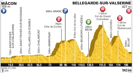 ![]() mercredi 11 juillet 2012 ![]() (Saône-et-Loire) : Mâcon (km 0) - Cormoranche-sur-Saône (km 5.5) - Les Leynards (km 10) - Bas Mizeriat (km 13) - Saint-Didier-Sur-Chalaronne (km 14.5) - Saint-Étienne-sur-Chalaronne (km 20) - Valeins (km 23.5) - St-Trivier-Sur-Moignans (km 30.5) - Bouligneux (km 40) - Villars-les-Dombes (km 43.5) - Versailleux (km 51) - Chalamont (km 56.5) - Le Mas Pugues (km 63.5) - Priay (km 66.5) - Le Genoud (km 70) - Ambronay (km 73) - Saint-Jean-Le-Vieux (km 76.5) - Jujurieux (km 79) - Châtillon de Cornelle (km 86.5) - Côte de Corlier (km 90-GPM2) - Corlier (km 91.5) - Aranc (km 96) - Col de La Berche (km 97.5) - Hauteville-Lompnes (km 102) - Mélogne (km 104) - Cormaranche-en-Bugey (km 105) - Col de La Lèbe (km 110) - Samonod (km 118.5) - Belmont-Luthézieu (km 119.5) - Chassin (km 122.5) - Don (km 123.5) - Artemare (km 125) - Ameyzieu (km 126.5) - Béon (km 130.5) - Culoz (km 133) - La Sapette (km 146.5) - Col du Grand Colombier (km 151.5-GPM HC) - Les Bordèzes (km 162) - Lochieu (km 164) - Boirin (km 166) - Brénaz (km 166.5) - Larnin (km 168) - Sothonod (km 169.5) - Col de Richemond (km 174-GPM3) - Craz (km 181.5) - Injoux (km 183.5) - Billiat (km 186) - Bellegarde-sur-Valserine (km 194.5). ![]() ![]() ![]() 175 partants - C'est Sagan qui déclenche les hostilités au km 2. Il est rejoint par Grivko et Lemoine qui se relève rapidement. Sagan et Grivko sont absorbés par un groupe de contre au km 32. Ils sont désormais 25 en tête dont Péraud, Casar, Ladagnous, Voigt, L.L. Sanchez, Scarponi, Voeckler. A 75 km du but, l'écart est supérieur à 7'. - Le groupe de tête aborde le Grand Colombier et Sagan et Millar sont les premiers à être lâchés. Scarponi accélère et fait le ménage. Seuls Péraud, L.L. Sanchez, Devenyns & Voeckler le suivent. Sanchez attaque 2 km plus loin et cette fois-ci c'est Péraud qui décroche. Dans le peloton seul Van den Broeck tente quelques accélérations. Au sommet Voeckler est en tête avec plus de 5' d'avance sur le peloton. - Dans la descente du Grand Colombier, Nibali, le spécialiste, sort du peloton et prend 1' d'avance, récupère son équipier Sagan mais aborde le col de Richemond seul. Il sera repris par le groupe "maillot jaune" à 20 km de l'arrivée. A l'avant de la course, Voigt revient sur les 4 échappés. Devenyns attaque franchement à 3 km du but. Avec un temps de retard, Voeckler va le chercher et le dépose à 2 km de la ligne pour gagner l'étape. Wiggins toujours maillot jaune. ![]() Étape : ![]() 1. Thomas Voeckler (Fra) en 4h46'26" (moy. 40.742 km/h) 2. Michele Scarponi (Ita) à 3" 3. Jens Voigt (All) à 7" 4. Luis Leon Sanchez (Esp) à 23" 5. Dries Devenyns (Bel) à 30" 6. Sandy Casar (Fra) à 2'44" 7. Egoi Martinez (Esp) 8. Pierre Rolland (Fra) 9. Jürgen Van den Broeck (Bel) 10. Dmitriy Fofonov (Kaz) à 2'52" 11. Thibaut Pinot (Fra) à 3'16" 12. Cadel Evans (Aus) 13. Bradley Wiggins (Gbr) 14. Nicolas Roche (Irl) 15. Vincenzo Nibali (Ita) 16. Denis Menchov (Rus) 17. Alejandro Valverde (Esp) 18. Christopher Froome (Gbr) 19. Rui Alberto Costa (Por) 20. Jérôme Coppel (Fra) 21. Maxime Monfort (Bel) 22. Janez Brajkovic (Slo) 23. Haimar Zubeldia (Esp) 24. Andreas Klöden (All) 25. Rein Taaramäe (Est) 26. Fränk Schleck (Lux) 27. Tejay Van Garderen (Usa) à 3'33" 28. Laurens Ten Dam (Hol) à 3'40" 29. Robert Kiserlovski (Cro) 30. Rafael Valls (Esp) 31. Levi Leipheimer (Usa) 32. Richie Porte (Aus) 33. Ivan Basso (Ita) 34. Christopher Horner (Usa) à 3'54" 35. Andriy Grivko (Ukr) à 4'06" 36. Marcus Burghardt (All) à 4'24" 37. Jelle Vanendert (Bel) à 8'16" 38. Chris Anker Sørensen (Dan) à 9'07" 39. Fabrice Jeandesboz (Fra) 40. Michael Rogers (Aus) 41. Jean-Christophe Péraud (Fra) 42. Matthieu Ladagnous (Fra) 43. Alexandre Vinokourov (Kaz) 44. Giampaolo Caruso (Ita) 45. Yury Trofimov (Rus) 46. Steven Kruijswijk (Hol) à 11'41" 47. Philippe Gilbert (Bel) 48. Juan José Cobo (Esp) 49. George Hincapie (Usa) 50. Amaël Moinard (Fra) 51. Michael Mørkøv (Dan) 52. Stephen Cummings (Gbr) 53. Eduard Vorganov (Rus) 54. David Zabriskie (Usa) 55. Yaroslav Popovych (Ukr) 56. Peter Sagan (Svq) à 12'25" 57. Marco Marzano (Ita) à 15'04" 58. Sylwester Szmyd (Pol) 59. David Millar (Gbr) 60. Simon Gerrans (Aus) 61. Dominik Nerz (All) 62. Peter Velits (Svq) 63. Guillaume Levarlet (Fra) 64. David Moncoutié (Fra) 65. Vladimir Karpets (Rus) 66. Vladimir Gusev (Rus) 67. Brice Feillu (Fra) 68. Simone Stortoni (Ita) 69. Robert Gesink (Hol) 70. Karsten Kroon (Hol) 71. Johnny Hoogerland (Hol) 72. Sergio Miguel Paulinho (Por) 73. Yukiya Arashiro (Jap) 74. Alessandro Vanotti (Ita) à 17'26" 75. Edvald Boasson Hagen (Nor) 76. Maxime Bouet (Fra) à 19'05" 77. Marco Marcato (Ita) 78. Davide Malacarne (Ita) 79. Yauheni Hutarovich (Blr) 80. Jérôme Pineau (Fra) 81. Sylvain Chavanel (Fra) 82. Arthur Vichot (Fra) 83. Jérémy Roy (Fra) 84. Giovanni Bernaudeau (Fra) 85. Sébastien Minard (Fra) 86. Christophe Riblon (Fra) 87. Joan Horrach (Esp) 88. Pierrick Fedrigo (Fra) 89. Christian Vande Velde (Usa) 90. Daniel Martin (Irl) 91. Michael Schär (Sui) 92. Anthony Roux (Fra) à 27'27" 93. Koen De Kort (Hol) 94. Martin Velits (Svq) 95. Bram Tankink (Hol) 96. Alessandro Petacchi (Ita) 97. Francis De Greef (Bel) 98. Kristjan Koren (Slo) 99. Fredrik Kessiakoff (Sue) 100. Cédric Pineau (Fra) 101. Roy Curvers (Hol) 102. Manuel Quinziato (Ita) 103. Danilo Hondo (All) 104. Yuriy Krivtsov (Fra) 105. Federico Canuti (Ita) 106. Adam Hansen (Aus) 107. Stuart O'Grady (Aus) 108. Nicki Sørensen (Dan) 109. Fabian Cancellara (Sui) 110. Anders Lund (Dan) 111. Albert Timmer (Hol) 112. Yann Huguet (Fra) 113. Lieuwe Westra (Hol) 114. Luis Angel Mate (Esp) 115. Samuel Dumoulin (Fra) 116. Nicolas Edet (Fra) 117. Jorge Azanza (Esp) 118. Ruben Perez (Esp) 119. Lars Ytting Bak (Dan) 120. Daniel Oss (Ita) 121. Jonathan Cantwell (Aus) 122. Christian Knees (All) 123. Matthew Harley Goss (Aus) 124. André Greipel (All) 125. Jürgen Roelandts (Bel) 126.