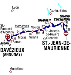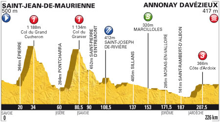 ![]() vendredi 13 juillet 2012 ![]() (Savoie) : Saint-Jean de Maurienne (km 0) - Épierre (km 20) - Saint-Pierre-de-Belleville (km 21.5) - Saint-Alban-Des-Hurtières (km 25.5) - Col du Grand Cucheron (km 34-GPM1) - Les Granges (km 38) - La Coche (km 38.5) - Les Plattires (km 40) - Le Blanchet (km 40.5) - Le Villard de la Table (km 43.5) - Repidon (km 44.5) - Le Verneil (km 46) - Presle (km 48.5) - La Rochette (km 51.5) - Détrier (km 54) - (Isère) : Pontcharra (km 61) - La Gache (km 64.5) - Barraux (près) (km 66.5) - Chapareillan (km 69.5) - La Palud (km 73) - (Savoie) : Col du Granier (km 80.5-GPM1) - Entremont-le-Vieux (km 85) - Saint-Pierre-d'Entremont (km 89.5) - (Isère) : Saint-Pierre-d'Entremont (km 90) - Le Châtelard (km 97) - Berland (km 98) - Saint-Laurent-du-Pont (km 103) - Saint-Joseph-de-Rivière (km 108.5) - Saint-Étienne-de-Crossey (km 113.5) - Le Pilet (km 117.5) - Voiron (km 118.5) - Saint-Cassien (km 122.5) - Route de Voiron (km 125.5) - Charnècles (près) (km 126.5) - Rives (km 128) - Beaucroissant (km 130.5) - Izeaux (km 135) - Sillans (km 137) - Saint-Étienne-de-Saint-Geoirs (km 142) - Brézins (km 144.5) - Marcilloles (km 153) - (Drôme) : La Saône (km 168) - Moras-en-Valloire (km 171.5) - Saint-Sorlin-en-Valloire (km 174.5) - Anneyron (km 180) - Saint-Rambert-d'Albon (km 187) - (Ardèche) : Andance (km 194.5) - Cance (km 198.5) - Silon (km 199.5) - Sarras (km 200) - Ardoix (km 207) - Côte d'Ardoix (km 207.5-GPM3) - Chamas (km 209) - Quintenas (km 214.5) - entrée Annonay (km 220.5) - Davézieux (km 226) - Annonay-Davézieux (km 226). ![]() ![]() ![]() 166 partants. - La course est calme jusqu'au km 17 où 19 coureurs prennent le large dont Gautier, Millar, Péraud, Engoulvent et Bouet. Au sommet du col du Grand Cucheron, il ne reste que 11 unités dans ce groupe. Kiserlovski passe en tête. Derrière, Horner est parti en contre. David Moncoutié chute dans la descente et doit abandonner. - En haut du col du Granier c'est encore Kiserlovski qui passe premier devant 4 rescapés de l'échappée initiale : Gautier, Millar, Péraud et Martinez. Dans la descente du col, un groupe de contre-attaquants sorte du peloton mais la présence de Sagan les condamne et les Sky les reprennent au km 108 (ravitaillement). Dès lors les échappés creusent leur avance qui passe à 12'40" au km 130. - Dans la dernière bosse à 4 km du but, Martinez place des démarrages mais c'est Péraud qui file à 2.5 km du but. Millar revient sur lui et gagne le sprint à Annonay/Davézieux, 45 ans après la mort de Tom Simpson sur le Ventoux. Pendant ce temps Sagan et Goss se dispute vigoureusement le sprint. Goss sera déclassé. Wiggins toujours maillot jaune. ![]() Étape : ![]() 1. David Millar (Gbr) en 5h42'46" (moy. 39.560 km/h) 2. Jean-Christophe Péraud (Fra) 3. Egoi Martinez (Esp) à 5" 4. Cyril Gautier (Fra) 5. Robert Kiserlovski (Cro) 6. Peter Sagan (Svq) à 7'53" 7. Matthew Harley Goss (Aus) * 8. Sébastien Hinault (Fra) à 7'54" 9. Cadel Evans (Aus) 10. Luca Paolini (Ita) 11. Julien Simon (Fra) 12. Bradley Wiggins (Gbr) 13. Marco Marcato (Ita) 14. Nicolas Roche (Irl) 15. Christopher Froome (Gbr) 16. Janez Brajkovic (Slo) 17. Vincenzo Nibali (Ita) 18. Jürgen Van den Broeck (Bel) 19. Daryl Impey (Afs) 20. Jelle Vanendert (Bel) 21. Tejay Van Garderen (Usa) 22. Michele Scarponi (Ita) 23. Pierre Rolland (Fra) 24. Philippe Gilbert (Bel) 25. Koen De Kort (Hol) 26. Dominik Nerz (All) 27. Jürgen Roelandts (Bel) 28. Jens Voigt (All) 29. Chris Anker Sørensen (Dan) 30. Christopher Horner (Usa) 31. Andreas Klöden (All) 32. Maxime Monfort (Bel) 33. Juan José Cobo (Esp) 34. Haimar Zubeldia (Esp) 35. Peter Velits (Svq) 36. Fränk Schleck (Lux) 37. Eduard Vorganov (Rus) 38. Rui Alberto Costa (Por) 39. Jérôme Coppel (Fra) 40. Thibaut Pinot (Fra) 41. Nick Nuyens (Bel) 42. Jimmy Engoulvent (Fra) à 8'01" 43. Michael Rogers (Aus) 44. Johnny Hoogerland (Hol) à 8'17" 45. Andriy Grivko (Ukr) 46. Laurens Ten Dam (Hol) 47. Pierrick Fedrigo (Fra) 48. Guillaume Levarlet (Fra) à 8'31" 49. Simon Gerrans (Aus) 50. Giampaolo Caruso (Ita) 51. Lars Ytting Bak (Dan) 52. Alejandro Valverde (Esp) à 8'39" 53. Maxime Bouet (Fra) 54. Christophe Riblon (Fra) 55. Mikaël Chérel (Fra) 56. Edvald Boasson Hagen (Nor) à 8'54" 57. George Hincapie (Usa) 58. Denis Menchov (Rus) à 8'55" 59. Samuel Dumoulin (Fra) 60. Sébastien Minard (Fra) 61. Kevin De Weert (Bel) 62. Tony Gallopin (Fra) 63. Baden Cooke (Aus) à 8'57" 64. Levi Leipheimer (Usa) à 9'08" 65. Kris Boeckmans (Bel) 66. Fabrice Jeandesboz (Fra) 67. Roy Curvers (Hol) 68. Bert Grabsch (All) 69. Sandy Casar (Fra) 70. Matthieu Sprick (Fra) 71. Vladimir Karpets (Rus) 72. Jorge Azanza (Esp) 73. Michael Schär (Sui) 74. Yann Huguet (Fra) 75. Simone Stortoni (Ita) 76. Brett Lancaster (Aus) à 9'38" 77. Daniel Oss (Ita) à 9'43" 78. Yaroslav Popovych (Ukr) à 9'49" 79. Fredrik Kessiakoff (Sue) 80. Dmitriy Fofonov (Kaz) 81. Adam Hansen (Aus) 82. Julien Fouchard (Fra) à 10'15" 83. Francis De Greef (Bel) 84. Stuart O'Grady (Aus) 85. Sylvain Chavanel (Fra) 86. Bram Tankink (Hol) 87. Marcus Burghardt (All) 88. Danilo Hondo (All) 89. Martin Velits (Svq) 90. Stephen Cummings (Gbr) 91. Daniel Martin (Irl) 92. Romain Zingle (Bel) 93. Pieter Weening (Hol) 94. Manuel Quinziato (Ita) 95. Amaël Moinard (Fra) 96. Maxim Iglinskiy (Kaz) 97. Yauheni Hutarovich (Blr) 98. Marco Marzano (Ita) 99. Joan Horrach (Esp) 100. Yukiya Arashiro (Jap) 101. Yury Trofimov (Rus) 102. Vladimir Gusev (Rus) 103. Cédric Pineau (Fra) 104. Sebastian Langeveld (Hol) 105. Jean-Marc Marino (Fra) à 10'20" 106. Cyril Lemoine (Fra) 107. Christian Knees (All) à 10'36" 108. Patrick Gretsch (All) 109. Kristjan Koren (Slo) 110. Sylwester Szmyd (Pol) 111. Aliaksandr Kuschynski (Blr) 112. Vincent Jérôme (Fra) 113. Jonathan Cantwell (Aus) 114. Bernhard Eisel (Aut) à 11'59" 115. Albert Timmer (Hol) 116. Jérémy Roy (Fra) 117. Kenny-Robert Van Hummel (Hol) 118. Anthony Roux (Fra) 119. Nicolas Edet (Fra) 