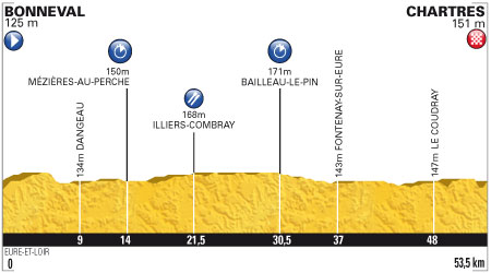 ![]() samedi 21 juillet 2012 ![]() (Eure-et-Loir) : Bonneval (km 0) - La Louveterie (km 1.5) - Montharville (km 4.5) - Le Soussy (km 7) - Dangeau (km 9) - Sonville (km 10.5) - La Tremblaye (Bullou) (km 12) - Mézières-Au-Perche (km 14) - Le Moulin-Neuf (km 16.5) - La Billanche (km 18) - Illiers-Combray (km 19.5) - Illiers-Combray (km 21.5) - Beaurouvre (km 23.5) - Bailleau-Le-Pin (km 30.5) - Pont-Tranchefêtu (km 35.5) - Fontenay-Sur-Eure (km 37) - Goindreville (km 39.5) - Tachainville (km 42.5) - La Varenne (km 43) - Morancez (km 45.5) - Le Coudray (km 48) - Luisant (km 49) - entrée Chartres (km 51) - Chartres (km 53.5). ![]() ![]() ![]() 153 partants. Temps intermédiaires : - km 14 : Wiggins en 16'49", Froome à 12", Van Garderen à 35", L.L. Sanchez à 38", P. Velits à 39", Gretsch & Nibali à 41", Klöden à 51", Zabriskie à 53", Kiryenka à 55". - km 30.5 : Wiggins en 36'41", Froome à 54", L.L. Sanchez à 58", Gretsch à 1'14", P. Velits à 1'16", Van Garderen à 1'22", Kiryenka à 1'29", Porte à 1'41", Sprick à 1'47", Taaramae à 1'49" Nibali est 16ème à 3'38". Evans souffrant, ne se classe qu'à la 52ème place. ![]() Étape : ![]() 1. Bradley Wiggins (Gbr) en 1h04'13" (moy. 49.987 km/h) 2. Christopher Froome (Gbr) à 1'16" 3. Luis Leon Sanchez (Esp) à 1'50" 4. Peter Velits (Svq) à 2'02" 5. Richie Porte (Aus) à 2'25" 6. Patrick Gretsch (All) à 2'28" 7. Tejay Van Garderen (Usa) à 2'34" 8. Vasil Kiryienka (Blr) à 2'46" 9. Rein Taaramäe (Est) à 2'50" 10. Jérémy Roy (Fra) à 3'05" 11. David Zabriskie (Usa) à 3'12" 12. Matthieu Sprick (Fra) à 3'20" 13. Ruben Plaza (Esp) à 3'24" 14. Daniel Oss (Ita) à 3'27" 15. Anthony Roux (Fra) à 3'34" 16. Vincenzo Nibali (Ita) à 3'38" 17. Christian Vande Velde (Usa) à 3'40" 18. Bert Grabsch (All) à 3'43" 19. Andreas Klöden (All) à 3'49" 20. Jens Voigt (All) 21. Christophe Kern (Fra) à 3'56" 22. Dries Devenyns (Bel) à 3'57" 23. Lars Ytting Bak (Dan) à 4'05" 24. Maxime Monfort (Bel) à 4'06" 25. Dominik Nerz (All) à 4'14" 26. Jürgen Van den Broeck (Bel) à 4'22" 27. Manuel Quinziato (Ita) à 4'24" 28. Denis Menchov (Rus) à 4'28" 29. Aliaksandr Kuschynski (Blr) 30. Maxime Bouet (Fra) à 4'32" 31. Andriy Grivko (Ukr) à 4'37" 32. Daniel Martin (Irl) à 4'41" 33. Sandy Casar (Fra) à 4'53" 34. George Hincapie (Usa) à 4'57" 35. Yaroslav Popovych (Ukr) à 5'08" 36. Eduard Vorganov (Rus) à 5'09" 37. Johan Vansummeren (Bel) à 5'11" 38. Ivan Basso (Ita) à 5'15" 39. Vladimir Karpets (Rus) à 5'17" 40. Luca Paolini (Ita) à 5'25" 41. Thibaut Pinot (Fra) à 5'31" 42. Haimar Zubeldia (Esp) à 5'32" 43. Kevin De Weert (Bel) à 5'33" 44. Christopher Horner (Usa) 45. Peter Sagan (Svq) à 5'34" 46. Kris Boeckmans (Bel) à 5'35" 47. Adam Hansen (Aus) à 5'37" 48. Janez Brajkovic (Slo) à 5'38" 49. Fredrik Kessiakoff (Sue) à 5'48" 50. Michele Scarponi (Ita) à 5'49" 51. Yann Huguet (Fra) à 5'53" 52. Cadel Evans (Aus) à 5'54" 53. Michael Rogers (Aus) à 5'55" 54. Laurens Ten Dam (Hol) à 6'01" 55. Andrey Kashechkin (Kaz) à 6'03" 56. Maxim Iglinskiy (Kaz) à 6'06" 57. Yukiya Arashiro (Jap) 58. Michael Schär (Sui) à 6'07" 59. Christian Knees (All) 60. Alexandre Vinokourov (Kaz) à 6'09" 61. Borut Bozic (Slo) à 6'12" 62. Michael Albasini (Sui) 63. Simon Gerrans (Aus) à 6'13" 64. Pierre Rolland (Fra) à 6'14" 65. Egoi Martinez (Esp) 66. Julien Fouchard (Fra) à 6'17" 67. Amaël Moinard (Fra) à 6'18" 68. Bernhard Eisel (Aut) à 6'19" 69. David Millar (Gbr) à 6'22" 70. Cyril Lemoine (Fra) à 6'24" 71. Albert Timmer (Hol) 72. Kristjan Koren (Slo) 73. Johnny Hoogerland (Hol) à 6'28" 74. Christophe Riblon (Fra) à 6'29" 75. Koen De Kort (Hol) à 6'31" 76. Jean-Christophe Péraud (Fra) à 6'38" 77. Nicolas Roche (Irl) à 6'39" 78. Chris Anker Sørensen (Dan) à 6'41" 79. Danilo Hondo (All) à 6'43" 80. Bram Tankink (Hol) à 6'44" 81. Giampaolo Caruso (Ita) à 6'45" 82. Mark Cavendish (Gbr) à 6'58" 83. Gregory Henderson (Nzl) à 7'01" 84. Sergio Miguel Paulinho (Por) 85. Nicki Sørensen (Dan) à 7'02" 86. Brice Feillu (Fra) 87. Juan José Cobo (Esp) 88. Rui Alberto Costa (Por) à 7'12" 89. Sylwester Szmyd (Pol) 90. Davide Malacarne (Ita) à 7'14" 91. Dmitriy Fofonov (Kaz) à 7'17" 92. Matthieu Ladagnous (Fra) à 7'27" 93. Steven Kruijswijk (Hol) à 7'32" 94. Francis De Greef (Bel) à 7'33" 95. Yury Trofimov (Rus) à 7'35" 96. Cyril Gautier (Fra) à 7'39" 97. Marcus Burghardt (All) à 7'47" 98. Daryl Impey (Afs) à 7'48" 99. Pierrick Fedrigo (Fra) à 7'51" 100. Stephen Cummings (Gbr) 101. Joan Horrach (Esp) à 7'54" 102. Jorge Azanza (Esp) à 7'57" 103. Edvald Boasson Hagen (Nor) 104. Pieter Weening (Hol) à 8'01" 105. Marcel Sieberg (All) à 8'02" 106. Jürgen Roelandts (Bel) 107. Jérôme Pineau (Fra) 108. Ruben Perez (Esp) à 8'09" 109. Pablo Urtasun (Esp) à 8'10" 110. Cédric Pineau (Fra) à 8'13" 111. Rafael Valls (Esp) à 8'24" 112. Yohann Gène (Fra) à 8'26" 113. Alejandro Valverde (Esp) à 8'36" 114. Jimmy Engoulvent (Fra) 115. Jan Ghyselinck (Bel) à 8'40" 116. Gorka Izagirre (Esp) à 8'46" 117. Julien Simon (Fra) à 8'48" 118. Jelle Vanendert (Bel) à 8'55" 119. Anders Lund (Dan) à 8'56" 120. Matthew Harley Goss (Aus) à 8'57" 121. Philippe Gilbert (Bel) à 8'58" 122. Nicolas Edet (Fra) 123. Martin Velits (Svq) 124. Blel Kadri (Fra) à 8'59" 125. Roy Curvers (Hol) à 9'00" 126. Simone Stortoni (Ita) 127. Juan José Haedo (Arg) à 9'02" 128. Romain Zingle (Bel) 129. Federico Canuti (Ita) à 9'03" 130. André Greipel (All) à 9'04" 131. Nick Nuyens (Bel) à 9'06" 132. Sébastien Hinault (Fra) 133. Jonathan Cantwell (Aus) 134. Michael Mørkøv (Dan) à 9'11" 135. Mikaël Chérel (Fra) 136. Luis Angel Mate (Esp) à 9'14" 137. Fabrice Jeandesboz (Fra) à 9'22" 138. Jérôme Coppel (Fra) à 9'32" 139. Stuart O'Grady (Aus) 140. Thomas Voeckler (Fra) à 9'33" 141. Levi Leipheimer (Usa) à 9'41" 142. Marco Marcato (Ita) à 9'47" 143. Baden Cooke (Aus) à 9'55" 144. Sebastian Langeveld (Hol) à 9'59" 145. Guillaume Levarlet (Fra