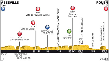 ![]() mercredi 4 juillet 2012 ![]() (Somme) : Abbeville (km 0) - Miannay (km 4.5) - Petit Miannay (km 8.5) - Valines (km 12) - Petit-Saucourt (km 14.5) - Fressenneville (km 15) - Gros Jacques (km 24.5) - St-Quentin-la-Motte-Crx-au-Bailly (km 25.5) - (Seine-Maritime) : Eu (km 29.5) - (Somme) : Mers-les-Bains (km 31.5) - (Seine-Maritime) : Le Tréport (km 33.5) - Côte du Mont Huon (km 38-GPM4) - Flocques (km 39) -Saint-Léonard (km 44.5) - Les Hauts de Tocqueville (km 48) - Biville-sur-Mer (km 50.5) - Saint-Martin-en-Campagne (km 54) - Derchigny (km 57.5) - Grèges (près) (km 61) - Dieppe (km 65.5) - Côte de Dieppe (km 69-GPM4) - Pourville-sur-Mer (km 71.5) - Hautot-sur-Mer (km 73.5) - Côte de Pourville-sur-Mer (km 74-GPM4) - Varengeville-sur-Mer (km 74) - Le Haut de Blancmesnil (km 78) - Sainte-Marguerite-sur-Mer (km 79) - Quiberville-sur-Mer (km 81.5) - Ramouville (km 85.5) - Saint-Aubin-sur-Mer (km 86.5) - Sotteville-sur-Mer (km 90) - Veules-les-Roses (km 94-ravitaillement) - Saint-Valery-en-Caux (km 98.5) - Ingouville (près) (km 103.5) - Saint-Sylvain (km 104.5) - Janville (km 107) - Paluel (km 109) - Malleville-les-Grès (km 111) - Auberville-la-Manuel (km 113) - Saint-Martin-aux-Buneaux (km 116) - Les Petites Dalles (km 118) - Sassetot-le-Mauconduit (km 120.5) - Saint-Pierre-en-Port (km 124.5) - Életot (km 129) - Senneville-sur-Fécamp (près) (km 133.5) - Fécamp (km 140-sprint) - Toussaint (km 142.5) - Côte de Toussaint (km 143-GPM4) - Ypreville-Biville (km 152) - Fauville-en-Caux (près) (km 158.5) - Bermonville (près) (km 161.5) - Allouville-Bellefosse (km 167.5) - Louvetot (km 172) - Maulévrier-Sainte-Gertrude (km 175) - Caudebec-en-Caux (km 177.5) - Le Trait (km 185) - Hameau de Saint-Paul (km 192.5) - Duclair (km 193) - Les Sablons (km 200) - Le Mesnil (km 200) - Saint-Martin-de-Boscherville (km 202.5) - Canteleu (km 207.5) - entrée Rouen (km 210.5) - Rouen (km 214.5). ![]() ![]() ![]() 195 partants Météo : temps ensoleillé - Un départ très rapide. Arashiro, Moncoutié et Delaplace s'échappent et comptent déjà 2' d'avance après quelques kilomètres de course. Au km 15, ils comptent plus de 5'. Leur avance croît encore pour atteindre 7' au km 20. Le peloton ne s'intéresse pas à la poursuite et l'écart va culminer à 8'40". - Au km 38, dans la côte du Mont Huon, Moncoutié passe en tête. Les Lotto commencent à prendre les choses en main et les Radioshack s'y mettent. Delaplace passe en tête dans la côte de Dieppe au km 69 puis Moncoutié encore dans celle de Pourville sur Mer juste après (km 74). Au km 80, l'écart est tombé sous les 7'. - Au km 115, l'écart est de 6'15" sur un peloton emmené par les Lotto et les Orica green edge. Arashiro passe en tête au sprint de Fécamp (km 140). Le trio a encore 6' d'avance dans la dernière côte passée en tête par Delaplace. Au km 160, ils n'ont plus que 5'. Arashiro place une attaque à 35 km du but mais va être repris par les deux Français. A 25 km de l'arrivée, l'écart est tombé sous les 2', aux 14 km à 1'. Ils sont repris aux 6 km. Dans le peloton Grivko, Chavanel, Pinot, Boué, Gilbert tentent une sortie. Puis ce sont Chavanel, Poels et Dumoulin qui prennent quelques secondes. A 3 km du but, nouvelle chute massive qui entraîne notamment Hunter et Cavendish à terre. - Greipel gagne le sprint devant Petacchi, Cancellara reste maillot jaune. ![]() Étape : ![]() 1. André Greipel (All) en 5h18'32" (moy. 40.404 km/h) 2. Alessandro Petacchi (Ita) 3. Tom Veelers (Hol) 4. Matthew Harley Goss (Aus) 5. Peter Sagan (Svq) 6. Jonathan Cantwell (Aus) 7. Daryl Impey (Afs) 8. Kris Boeckmans (Bel) 9. Edvald Boasson Hagen (Nor) 10. Ruben Perez (Esp) 11. Gregory Henderson (Nzl) 12. Jürgen Roelandts (Bel) 13. Dmitriy Fofonov (Kaz) 14. Peter Velits (Svq) 15. Rémy Di Gregorio (Fra) 16. Marcus Burghardt (All) 17. Patrick Gretsch (All) 18. Egoi Martinez (Esp) 19. Janez Brajkovic (Slo) 20. Gorka Izagirre (Esp) 21. Andreas Klöden (All) 22. Samuel Sanchez (Esp) 23. Marco Marcato (Ita) 24. Danilo Hondo (All) 25. Jorge Azanza (Esp) 26. Sylvain Chavanel (Fra) 27. Cadel Evans (Aus) 28. Michael Rogers (Aus) 29. Marcel Sieberg (All) 30. Roy Curvers (Hol) 31. Koen De Kort (Hol) 32. Cyril Gautier (Fra) 33. Pierre Rolland (Fra) 34. Anthony Roux (Fra) 35. Robert Gesink (Hol) 36. Christopher Froome (Gbr) 37. Sandy Casar (Fra) 38. Johannes Fröhlinger (All) 39. Luis Angel Mate (Esp) 40. Imanol Erviti (Esp) 41. José Ivan Gutierrez (Esp) 42. Jan Ghyselinck (Bel) 43. Vincenzo Nibali (Ita) 44. Vladimir Gusev (Rus) 45. Ryder Hesjedal (Can) 46. Baden Cooke (Aus) 47. Ivan Basso (Ita) 48. Ruben Plaza (Esp) 49. Adam Hansen (Aus) 50. Maxim Iglinskiy (Kaz) 51. Mikel Astarloza (Esp) 52. Andriy Grivko (Ukr) 53. Robert Kiserlovski (Cro) 54. Vincent Jérôme (Fra) 55. Nicolas Roche (Irl) 56. Jean-Christophe Péraud (Fra) 57. Nick Nuyens (Bel) 58. Alejandro Valverde (Esp) 59. Andrey Kashechkin (Kaz) 60. Maxime Monfort (Bel) 61. Amaël Moinard (Fra) 62. Dries Devenyns (Bel) 63. Christopher Horner (Usa) 64. Fränk Schleck (Lux) 65. Rui Alberto Costa (Por) 66. Kevin De Weert (Bel) 67. Levi Leipheimer (Usa) 68. Kenny-Robert Van Hummel (Hol) 69. Romain Zingle (Bel) 70. Rafael Valls (Esp) 71. Michele Scarponi (Ita) 72. Daniel Martin (Irl) 73. Guillaume Levarlet (Fra) 74. Lieuwe Westra (Hol) 75. Giovanni Bernaudeau (Fra) 76. George Hincapie (Usa) 77. Bert Grabsch (All) 78. Maxime Bouet (Fra) 79. Yuriy Krivtsov (Fra) 80. Juan José Cobo (Esp) 81. Mikaël Chérel (Fra) 82. Matthieu Ladagnous (Fra) 83. Christophe Riblon (Fra) 84. Chris Anker Sørensen (Dan) 85. Pierrick Fedrigo (Fra) 86. Fabrice Jeandesboz (Fra) 87. Jérôme Coppel (Fra) 88. Jimmy Engoulvent (Fra) 89. Jens Voigt (All) 90. Nicki Sørensen (Dan) 91. Sergio Miguel Paulinho (Por) 92. Christian Knees (All) 93. Karsten Kroon (Hol) 94. Anders Lund (Dan) 95. Martin Velits (Svq) 96. Dominik Nerz (All) 97. Thibaut Pinot (Fra) 98. Arthur Vichot (Fra) 99. Yaroslav Popovych (Ukr) 100. Maarten Wyn