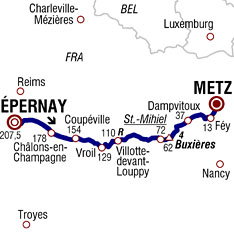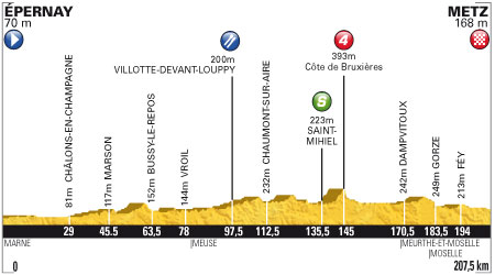 ![]() vendredi 6 juillet 2012 ![]() (Marne) : Épernay (km 0) - Bisseuil (km 6) - Tours-sur-Marne (km 7.5) - Condé-sur-Marne (km 13) - Aigny (km 15) - Vraux (km 17.5) - Juvigny (km 19) - Recy (km 25.5) - Saint-Martin-sur-le-Pré (km 27) - Châlons-en-Champagne (km 29) - Saint-Memmie (km 33.5) - Longevas (km 41) - Marson (km 45.5) - Saint-Jean-sur-Moivre (km 50) - Coupéville (km 53) - Le Fresne (km 54.5) - Bussy-le-Repos (km 63.5) - Possesse (km 67.5) - Charmont (km 73) - Vroil (km 78) - (Meuse) : Nettancourt (près) (km 82.5) - Brabant-le-Roi (près) (km 87) - Laheycourt (km 92.5) - Villotte-devant-Louppy (km 97.5-ravitaillement) - Lisle-en-Barrois (km 101) - Rembercourt-Sommaisne (km 106) - Chaumont-sur-Aire (km 112.5) - Longchamps-sur-Aire (près) (km 117) - Pierrefitte-sur-Aire (km 119) - Fresnes-au-Mont (km 128) - Chauvoncourt (km 134) - Saint-Mihiel (km 135.5-sprint) - Côte de Buxières (km 145-GPM4) - Woinville (km 147.5) - Buxérulles (km 148.5) - Buxières-sous-les-Côtes (km 149.5) - Heudicourt-sous-les-Côtes (km 152) - Saint-Benoît-en-Woëvre (km 165.5) - (Meurthe-et-Moselle) : Dampvitoux (km 170.5) - Champs (km 175) - Les Baraques (km 179) - (Moselle) : Gorze (km 183.5) - Novéant-sur-Moselle (km 189) - Corny-sur-Moselle (km 191) - Féy (km 194) - Augny (près) (km 198) - Marly (km 200) - Montigny-lès-Metz (km 202.5) - entrée Metz (km 204) - Metz (km 205). ![]() ![]() ![]() 194 partants - Aujourd'hui c'est au km 5 que part l'échappée matinale. Elle est lancée par Zabriskie, suivi de Malacarne, Zingle, et Kroon. - Au km 37, une chute intervient dans le peloton touchant notamment Greipel le vainqueur de la veille. Les échappés sont toujours devant lorsque, à 25 km du but, une nouvelle chute importante entraine une partie du peloton à terre. Danielson, Poels, Astarloza, Vigano abandonnent. Rolland, Hesjedal, Valverde, Gesink, Vansummeren et Frank Schleck sont également à terre. Le Luxembourgeois et Valverde vont y laisser 2'09" sur les favoris. - Les échappés sont repris à 2.5 km du but sauf Zabriskie qui résistera 1 km de plus et sera repris par les Lotto de Greipel mais Sagan est le plus puissant et l'emporte avec son maillot vert. Cancellara toujours en jaune. ![]() Étape : ![]() 1. Peter Sagan (Svq) en 4h37'00" (moy. 44.404 km/h) 2. André Greipel (All) 3. Matthew Harley Goss (Aus) 4. Kenny-Robert Van Hummel (Hol) 5. Juan José Haedo (Arg) 6. Gregory Henderson (Nzl) 7. Alessandro Petacchi (Ita) 8. Luca Paolini (Ita) 9. Daryl Impey (Afs) 10. Brett Lancaster (Aus) à 4" 11. Sébastien Hinault (Fra) 12. Roy Curvers (Hol) 13. Julien Simon (Fra) 14. Cadel Evans (Aus) 15. Bernhard Eisel (Aut) 16. Vincenzo Nibali (Ita) 17. Marco Marcato (Ita) 18. Andreas Klöden (All) 19. Samuel Sanchez (Esp) 20. Nicolas Roche (Irl) 21. Bradley Wiggins (Gbr) 22. Ruben Perez (Esp) 23. Maxime Monfort (Bel) 24. Michael Rogers (Aus) 25. Samuel Dumoulin (Fra) 26. Jürgen Van den Broeck (Bel) 27. Jürgen Roelandts (Bel) 28. Peter Velits (Svq) 29. George Hincapie (Usa) 30. Kris Boeckmans (Bel) 31. Egoi Martinez (Esp) 32. Jonathan Cantwell (Aus) 33. Tony Gallopin (Fra) 34. Philippe Gilbert (Bel) 35. Gorka Izagirre (Esp) 36. Christian Knees (All) 37. Fabian Cancellara (Sui) 38. Sylvain Chavanel (Fra) 39. Tejay Van Garderen (Usa) 40. Mikaël Chérel (Fra) 41. Jérôme Pineau (Fra) 42. Christopher Froome (Gbr) 43. Kevin De Weert (Bel) 44. Christopher Horner (Usa) 45. Jorge Azanza (Esp) 46. Levi Leipheimer (Usa) 47. Sébastien Minard (Fra) 48. Jérémy Roy (Fra) 49. Rémy Di Gregorio (Fra) 50. Haimar Zubeldia (Esp) 51. Denis Menchov (Rus) 52. Bert Grabsch (All) 53. Vladimir Gusev (Rus) 54. Ivan Basso (Ita) 55. Jérôme Coppel (Fra) 56. Eduard Vorganov (Rus) 57. Michael Schär (Sui) 58. Rui Alberto Costa (Por) 59. Baden Cooke (Aus) 60. Maxime Bouet (Fra) 61. Jens Voigt (All) 62. Alessandro Vanotti (Ita) à 15" 63. Danilo Hondo (All) à 16" 64. Marcel Sieberg (All) à 21" 65. Michael Mørkøv (Dan) à 32" 66. Marcus Burghardt (All) 67. Stephen Cummings (Gbr) 68. Davide Malacarne (Ita) 69. Jean-Marc Marino (Fra) 70. Pablo Urtasun (Esp) 71. Karsten Kroon (Hol) à 55" 72. David Zabriskie (Usa) 73. Adam Hansen (Aus) à 57" 74. Manuel Quinziato (Ita) à 1'10" 75. Lars Ytting Bak (Dan) à 1'20" 76. Simon Gerrans (Aus) à 1'22" 77. Stuart O'Grady (Aus) 78. Rein Taaramäe (Est) à 4" 79. Romain Zingle (Bel) à 1'39" 80. Michele Scarponi (Ita) à 2'09" 81. Janez Brajkovic (Slo) 82. Fränk Schleck (Lux) 83. Cyril Gautier (Fra) 84. Sergio Miguel Paulinho (Por) 85. Pierre Rolland (Fra) 86. Thibaut Pinot (Fra) 87. Patrick Gretsch (All) 88. Bauke Mollema (Hol) 89. Arthur Vichot (Fra) 90. Christophe Riblon (Fra) 91. Chris Anker Sørensen (Dan) 92. Yauheni Hutarovich (Blr) 93. Giovanni Bernaudeau (Fra) 94. Sylwester Szmyd (Pol) 95. Jelle Vanendert (Bel) 96. Nick Nuyens (Bel) 97. Edvald Boasson Hagen (Nor) 98. Jean-Christophe Péraud (Fra) 99. Matthieu Ladagnous (Fra) 100. Rafael Valls (Esp) 101. Alejandro Valverde (Esp) 102. Marco Marzano (Ita) 103. Martin Velits (Svq) 104. Amaël Moinard (Fra) 105. Nicolas Edet (Fra) 106. Tony Martin (All) 107. Kristjan Koren (Slo) à 2'18" 108. Juan José Cobo (Esp) à 2'21" 109. Blel Kadri (Fra) à 3'13" 110. Robert Gesink (Hol) à 3'31" 111. Steven Kruijswijk (Hol) 112. Borut Bozic (Slo) à 3'52" 113. Michael Albasini (Sui) à 4'53" 114. Sebastian Langeveld (Hol) 115. Sandy Casar (Fra) à 5'11" 116. Koen De Kort (Hol) à 6'02" 117. Albert Timmer (Hol) 118. Andrey Kashechkin (Kaz) 119. Tom Veelers (Hol) 120. Joan Horrach (Esp) 121. Yuriy Krivtsov (Fra) 122. Mark Renshaw (Aus) 123. Mark Cavendish (Gbr) 124. Pierrick Fedrigo (Fra) 125. Yaroslav Popovych (Ukr) 126. Andriy Grivko (Ukr) 127. Pieter Weening (Hol) 128. Cédric Pineau (Fra) 129. Johnny Hoogerland (Hol) 130. Thomas Voeckler (Fra) 131. Yohann Gène (Fra) 132. Daniel Oss (Ita) 133. David Moncoutié (Fra) 134. Giampaolo Caruso (Ita) 135. Oscar Freire (Esp) 136. Luis Leon Sanchez (Esp) 137. Vincent Jérôme (Fra) 138.