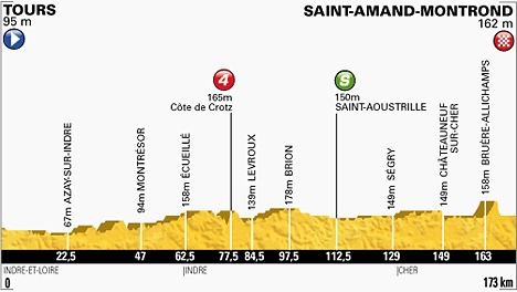 ![]() vendredi 12 juillet 2013 ![]() (Indre-et-Loire) : Tours (km 0) - Esvres (près de) (km 8) - Saint-Blaise (km 10.5) - Truyes (km 11) - Cormery (km 11.5) - Courçay (km 16) - Reignac-sur-Indre (km 20) - Azay-sur-Indre (km 22.5) - Morillon (km 25) - Chédigny (km 27.5) - Saint-Quentin-sur-Indrois (km 29.5) - La Palissière (km 32) - Genillé (km 36.5) - La Clémencerie (km 40.5) - Chemillé-sur-Indrois (km 44.5) - Montrésor (km 47) - Villeloin-Coulangé (km 49.5) - Coulangé (km 51.5) - Nouans-les-Fontaines (km 55.5) - (Indre) : Écueillé (km 62.5) - Gehée (près de) (km 76) - Côte de Crotz (km 77.5-GPM4) - Moulins-sur-Céphons (km 81.5) - Terroir (km 83.5) - Levroux (km 84.5) - Les Vignes du Château (km 87) - Levroux (km 87) - La Folie (km 97) - Brion (km 97.5) - La Champenoise (km 103.5) - Saint-Aoustrille (km 112.5-sprint) - Le Chaumet (km 113.5) - Issoudun (km 117.5) - Chouday (près de) (km 126.5) - Ségry-Village (km 128) - Ségry (km 129) - (Cher) : Mareuil-Sur-Arnon (km 134) - Les Loges (km 141) - Le Poireuil (km 146) - Chérigny (km 146.5) - Les Brossats (km 148) - Les Grandes Forêts (km 148.5) - Châteauneuf-sur-Cher (km 149) - Rousson (km 154.5) - Saint-Loup-des-Chaumes (près de) (km 157) - Bruère-Allichamps (km 163) - entrée Saint-Amand-Montrond (km 169) - Saint-Amand-Montrond (km 173). ![]() ![]() ![]() Vidéo DailyMotion ![]() Étape : ![]() 1. Mark Cavendish (Gbr) en 3h40'08" (moy: 47.153 km/h) 2. Peter Sagan (Svq) 3. Bauke Mollema (Hol) 4. Jakob Fuglsang (Dan) 5. Niki Terpstra (Hol) 6. Roman Kreuziger (Tch) 7. Alberto Contador (Esp) 8. Laurens Ten Dam (Hol) 9. Sylvain Chavanel (Fra) à 6" 10. Michael Rogers (Aus) à 9" 11. Nicolas Roche (Irl) à 11" 12. Daniele Bennati (Ita) à 17" 13. Maciej Bodnar (Pol) à 19" 14. Matteo Tosatto (Ita) à 53" 15. André Greipel (All) à 1'09" 16. Michal Kwiatkowski (Pol) 17. William Bonnet (Fra) 18. Anthony Delaplace (Fra) 19. Daniel Martin (Irl) 20. John Degenkolb (All) 21. Cadel Evans (Aus) 22. Jean-Christophe Péraud (Fra) 23. Andy Schleck (Lux) 24. Koen De Kort (Hol) 25. Nairo Alexander Quintana (Col) 26. Christopher Froome (Gbr) 27. Matteo Trentin (Ita) 28. Simon Gerrans (Aus) 29. Maxime Monfort (Bel) 30. Andrew Talansky (Usa) 31. Daniel Navarro (Esp) 32. Alexander Kristoff (Nor) 33. Amaël Moinard (Fra) 34. Joaquin Rodriguez (Esp) 35. Alan Marangoni (Ita) 36. Marcus Burghardt (All) 37. Jack Bauer (Nzl) 38. Peter Velits (Svq) 39. Christophe Riblon (Fra) 40. Jérôme Pineau (Fra) 41. Manuel Quinziato (Ita) 42. Alberto Losada (Esp) 43. Arnold Jeannesson (Fra) 44. Marcel Sieberg (All) 45. Francesco Gavazzi (Ita) 46. Arthur Vichot (Fra) 47. Jesus Hernandez (Esp) 48. Tejay Van Garderen (Usa) 49. Steve Morabito (Sui) 50. Hubert Dupont (Fra) 51. Lars Ytting Bak (Dan) 52. Sébastien Minard (Fra) 53. Maarten Wynants (Bel) 54. Lars Boom (Hol) 55. Andreas Klöden (All) 56. Bram Tankink (Hol) 57. Ramunas Navardauskas (Lit) 58. Tony Martin (All) à 1'37" 59. Ian Stannard (Gbr) à 1'54" 60. Aliaksandr Kuschynski (Blr) à 2'14" 61. Pavel Brutt (Rus) à 2'15" 62. Tom Leezer (Hol) à 2'34" 63. Geraint Thomas (Gbr) à 2'39" 64. Sep Vanmarcke (Bel) à 2'43" 65. Frederik Willems (Bel) à 3'32" 66. Kanstantsin Siutsou (Blr) à 4'30" 67. Tom Veelers (Hol) à 5'29" 68. Bart De Clercq (Bel) 69. José Joaquin Rojas (Esp) à 9'54" 70. Alejandro Valverde (Esp) 71. Laurent Didier (Lux) 72. Maxime Méderel (Fra) 73. Haimar Zubeldia (Esp) 74. David Veilleux (Can) 75. Pierrick Fedrigo (Fra) 76. Przemyslaw Niemiec (Pol) 77. Gatis Smukulis (Let) 78. Matthew Harley Goss (Aus) 79. Daryl Impey (Afs) 80. Kris Boeckmans (Bel) 81. Juan José Oroz (Esp) 82. Markel Irizar (Esp) 83. Rui Alberto Costa (Por) 84. Boy Van Poppel (Hol) 85. Jürgen Roelandts (Bel) 86. Kristjan Koren (Slo) 87. Gorka Izagirre (Esp) 88. Johannes Fröhlinger (All) 89. Jens Voigt (All) 90. Robert Gesink (Hol) 91. Julien Simon (Fra) 92. Alexis Vuillermoz (Fra) 93. Tom Dumoulin (Hol) 94. Cyril Lemoine (Fra) 95. Adam Hansen (Aus) 96. Roy Curvers (Hol) 97. Davide Malacarne (Ita) 98. Svein Tuft (Can) 99. Richie Porte (Aus) 100. Brent Bookwalter (Usa) 101. Philippe Gilbert (Bel) 102. Lars-Petter Nordhaug (Nor) 103. Fabio Sabatini (Ita) 104. Wouter Poels (Hol) 105. Julien El Farès (Fra) 106. Yukiya Arashiro (Jap) 107. Igor Anton (Esp) 108. Tom Danielson (Usa) 109. David Lopez Garcia (Esp) 110. Mikel Nieve (Esp) 111. Christophe Le Mével (Fra) 112. Stuart O'Grady (Aus) 113. Rein Taaramäe (Est) 114. José Rodolfo Serpa (Col) 115. Rudy Molard (Fra) 116. Pierre Rolland (Fra) 117. Cyril Gautier (Fra) 118. Enrico Gasparotto (Ita) 119. Luis Angel Mate (Esp) 120. Assan Bazayev (Kaz) à 10'05" 121. Romain Bardet (Fra) à 10'07" 122. Gert Steegmans (Bel) 123. Lieuwe Westra (Hol) 124. Marcel Kittel (All) 125. Roberto Ferrari (Ita) 126. Brett Lancaster (Aus) 127. Danny Van Poppel (Hol) à 10'11" 128. Alexey Lutsenko (Kaz) 129. Daniel Moreno (Esp) 130. Thibaut Pinot (Fra) 131. David Millar (Gbr) 132. Yury Trofimov (Rus) 133. Manuele Mori (Ita) 134. Dmitriy Muravyev (Kaz) 135. John Gadret (Fra) 136. Jon Izagirre (Esp) 137. Davide Cimolai (Ita) 138. Juan José Lobato (Esp) 139. Simon Geschke (All) 140. Juan Antonio Flecha (Esp) 141. Moreno Moser (Ita) 142. Alexandre Geniez (Fra) 143. Jean-Marc Marino (Fra) 144. Sergey Lagutin (Ouz) 145. Eduard Vorganov (Rus) 146. Alessandro De Marchi (Ita) 147. Samuel Dumoulin (Fra) 148. Murilo Antonio Fischer (Bre) à 10'19" 149. Michael Albasini (Sui) 150. Yohann Gène (Fra) 151. Jonathan Hivert (Fra) 152. Jérôme Cousin (Fra) 153. Kévin Reza (Fra) à 10'23" 154. Peter Kennaugh (Gbr) 155. Ruben Perez (Esp) à 11'47" 156. Cameron Meyer (Aus) à 13'36" 157. Damiano Cunego (Ita) 158. Ruben Plaza (Esp) 159. Johnny Hoogerland (Hol) 160. Sergio Miguel Paulinho (Por) 161. Thomas De Gendt (Bel) 162. Blel Kadri (Fra) 163. Romain Sicard (Fra) 164. Mikel Astarloza (Esp) 165. Simon Clarke (Aus) 166. Gregory Henderson (Nzl) 167. Jérémy Roy (Fra) 168. Thomas Voeckler (Fra) 169. Jér