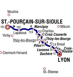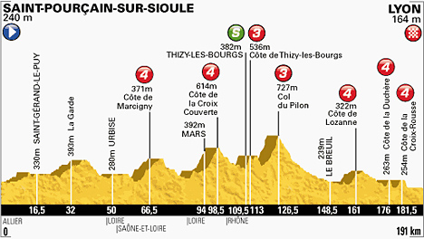 ![]() samedi 13 juillet 2013 ![]() (Allier) : Saint-Pourcain-sur-Sioule (km 0) - Villemouze (km 2) - Chazeuil (km 5) - Varennes-sur-Allier (km 5) - Rongères (près de) (km 11) - Saint-Gérand-le-Puy (km 16.5) - Périgny (km 20.5) - Lapalisse (km 25.5) - Les Minaires 29.5 - La Garde (km 32) - Andelaroche (près de) (km 36) - Montaiguët-en-Forez (km 42) - (Loire) : Urbise (km 50) - (Saône-et-Loire) : Chambilly (km 60.5) - Marcigny (km 62.5) - Côte de Marcigny (km 66.5-GPM3) - Saint-Julien-de-Jonzy (km 73) - Saint-Bonnet-de-Cray (près de) (km 78.5) - (Loire) : Charlieu (km 84) - Chandon (près de) (km 89.5) - Mars (km 94) - Cuinzier (km 95) - Côte de La Croix Couverte (km 98.5-GPM4) - Les Arras (km 100) - (Rhône) : Cours-la-Ville (km 100.5) - Pont-Trambouze (km 104.5) - Pont Gauthier (km 106.5) - Le Ronzy (km 108) - Thizy-Les-Bourgs (km 109.5-sprint) - Côte de Thizy-les-Bourgs (km 113-GPM3) - Saint-Jean-La-Bussière (km 115) - Amplepuis (km 118.5) - Ronno (près de) (km 123.5) - Col du Pilon (km 126.5-GPM3) - Valsonne (km 133) - Saint-Clément-sur-Valsonne (km 136.5) - Les Ponts Tarrets (km 146.5) - Le Breuil (km 148.5) - Chessy (près de) (km 151.5) - Châtillon d'Azergues (près de) (km 153.5) - Belmont-d'Azergues (près de) (km 155.5) - Lozanne (km 157) - Côte de Lozanne (km 161-GPM4) - La Tour-de-Salvagny (km 162.5) - Montcourant (km 165) - Chenerond (km 166) - Charbonnières-les-Bains (km 167.5) - Tassin-la-Demi-Lune (km 170) - entrée Lyon (km 174) - Côte de la Duchère (km 176) - Côte de La Croix-Rousse (km 181.5) - Caluire-et-Cuire (km 183) - entrée Lyon (km 184) - Lyon (km 191). ![]() ![]() ![]() Vidéo DailyMotion ![]() Étape : ![]() 1. Matteo Trentin (Ita) en 4h15'11" (moy: 44.908 km/h) 2. Michael Albasini (Sui) 3. Andrew Talansky (Usa) 4. José Joaquin Rojas (Esp) 5. Egoitz Garcia (Esp) 6. Lars Ytting Bak (Dan) 7. Simon Geschke (All) 8. Arthur Vichot (Fra) 9. Pavel Brutt (Rus) 10. Cyril Gautier (Fra) 11. Julien Simon (Fra) 12. Jan Bakelants (Bel) 13. Blel Kadri (Fra) à 10" 14. Marcus Burghardt (All) 15. Imanol Erviti (Esp) à 46" 16. Tejay Van Garderen (Usa) à 1'35" 17. Jens Voigt (All) à 4'31" 18. David Millar (Gbr) 19. Ian Stannard (Gbr) à 7'17" 20. Kanstantsin Siutsou (Blr) 21. Peter Kennaugh (Gbr) 22. Christopher Froome (Gbr) 23. Matteo Tosatto (Ita) 24. Alberto Contador (Esp) 25. Richie Porte (Aus) 26. Daniele Bennati (Ita) 27. Robert Gesink (Hol) 28. Roman Kreuziger (Tch) 29. Bauke Mollema (Hol) 30. Jonathan Castroviejo (Esp) 31. Alejandro Valverde (Esp) 32. Sébastien Minard (Fra) 33. Michael Rogers (Aus) 34. Nairo Alexander Quintana (Col) 35. Lars Boom (Hol) 36. Nicolas Roche (Irl) 37. Francesco Gavazzi (Ita) 38. Andrey Amador (Crc) 39. Samuel Dumoulin (Fra) 40. Christophe Riblon (Fra) 41. Hubert Dupont (Fra) 42. Jakob Fuglsang (Dan) 43. Cadel Evans (Aus) 44. Philippe Gilbert (Bel) 45. André Greipel (All) 46. Marcel Sieberg (All) 47. Stuart O'Grady (Aus) 48. Joaquin Rodriguez (Esp) 49. Ruben Perez (Esp) 50. Daniel Martin (Irl) 51. Maxime Monfort (Bel) 52. Roy Curvers (Hol) 53. Jack Bauer (Nzl) 54. Johannes Fröhlinger (All) 55. Tom Danielson (Usa) 56. Jean-Christophe Péraud (Fra) 57. Davide Malacarne (Ita) 58. Wouter Poels (Hol) 59. Tom Dumoulin (Hol) 60. Roberto Ferrari (Ita) 61. Daniel Navarro (Esp) 62. Yury Trofimov (Rus) 63. Christophe Le Mével (Fra) 64. Laurent Didier (Lux) 65. Jürgen Roelandts (Bel) 66. Steve Morabito (Sui) 67. Rudy Molard (Fra) 68. Aliaksandr Kuschynski (Blr) 69. Juan José Oroz (Esp) 70. Rein Taaramäe (Est) 71. Juan José Lobato (Esp) 72. Romain Bardet (Fra) 73. Mikel Nieve (Esp) 74. Mikel Astarloza (Esp) 75. Kristjan Koren (Slo) 76. Manuel Quinziato (Ita) 77. Michal Kwiatkowski (Pol) 78. Peter Velits (Svq) 79. Bart De Clercq (Bel) 80. Jérôme Pineau (Fra) 81. Mark Cavendish (Gbr) 82. Gert Steegmans (Bel) 83. Sylvain Chavanel (Fra) 84. Haimar Zubeldia (Esp) 85. Maxime Méderel (Fra) 86. Fabio Sabatini (Ita) 87. Simon Clarke (Aus) 88. Brent Bookwalter (Usa) 89. Simon Gerrans (Aus) 90. Eduard Vorganov (Rus) 91. Andreas Klöden (All) 92. Albert Timmer (Hol) 93. Jon Izagirre (Esp) 94. Andy Schleck (Lux) 95. Koen De Kort (Hol) 96. Maciej Bodnar (Pol) 97. Brian Vandborg (Dan) 98. Luis Angel Mate (Esp) 99. Enrico Gasparotto (Ita) 100. Boy Van Poppel (Hol) 101. Thomas De Gendt (Bel) 102. Laurens Ten Dam (Hol) 103. Bram Tankink (Hol) 104. Matthew Harley Goss (Aus) 105. Peter Sagan (Svq) 106. Gatis Smukulis (Let) 107. Daryl Impey (Afs) 108. Danny Van Poppel (Hol) 109. Amaël Moinard (Fra) 110. Igor Anton (Esp) 111. José Rodolfo Serpa (Col) 112. Alexis Vuillermoz (Fra) 113. Markel Irizar (Esp) 114. Adam Hansen (Aus) 115. Pierrick Fedrigo (Fra) 116. Guillaume Levarlet (Fra) 117. Manuele Mori (Ita) 118. Lieuwe Westra (Hol) 119. John Gadret (Fra) 120. Rui Alberto Costa (Por) 121. Ruben Plaza (Esp) 122. Yukiya Arashiro (Jap) 123. John Degenkolb (All) 124. Marcel Kittel (All) 125. Tony Gallopin (Fra) 126. Daniel Moreno (Esp) 127. Alberto Losada (Esp) 128. Damiano Cunego (Ita) 129. Przemyslaw Niemiec (Pol) 130. Alan Marangoni (Ita) 131. Pierre Rolland (Fra) 132. Alexander Kristoff (Nor) 133. Sergio Miguel Paulinho (Por) 134. Brice Feillu (Fra) 135. Romain Sicard (Fra) 136. Moreno Moser (Ita) 137. Arnold Jeannesson (Fra) 138. Jean-Marc Marino (Fra) 139. Thibaut Pinot (Fra) 140. William Bonnet (Fra) 141. Anthony Delaplace (Fra) 142. Julien El Farès (Fra) 143. Jesus Hernandez (Esp) 144. Brett Lancaster (Aus) 145. Maarten Wynants (Bel) 146. Juan Antonio Flecha (Esp) 147. Jérôme Coppel (Fra) 148. David Veilleux (Can) 149. Murilo Antonio Fischer (Bre) 150. Elia Favilli (Ita) 151. Cyril Lemoine (Fra) 152. Lars-Petter Nordhaug (Nor) 153. Assan Bazayev (Kaz) 154. Tony Martin (All) 155. Cameron Meyer (Aus) 156. Svein Tuft (Can) 157. Gregory Henderson (Nzl) 158. Dmitriy Muravyev (Kaz) 159. Niki Terpstra (Hol) 160. Thomas Voeckler (Fra) 161. Yohann Gène (Fra) 162. Davide Cimolai (Ita) 163. Johnny Hoogerland (Hol) 164. Jérémy Roy (Fra) 165. Ramun