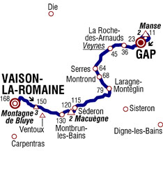 ![]() mardi 16 juillet 2013 ![]() (Vaucluse) : Vaison-La-Romaine (km 0) - Puyméras (km 4) - Faucon (km 6) - (Drôme) : Mollans-sur-Ouvèze (km 11) - Col de Veaux (km 14) - Côte de la Montagne de Bluye (km 17.5-GPM3) - (Vaucluse) : Saint-Léger-du-Ventoux (km 22) - Brantes (près de) (km 27.5) - Savoillan (près de) (km 31.5) - (Drôme) : Reilhanette (près de) (km 35.5) - Montbrun-Les-Bains (km 38) - Barret-de-Lioure (km 46) - Col de Macuègne (km 48-GPM2) - Séderon (km 53) - Lachau (près de) (km 63) - La Calandre (km 64) - (Hautes-Alpes) : Le Pont (km 70) - Serre des Ormes (km 70.5) - Les Granges (km 72.5) - Barret-sur-Méouge (km 73.5) - Châteauneuf-de-Chabre (km 84) - Laragne-Montéglin (km 88.5) - Eyguians (km 94.5) - Montrond (km 99.5) - Serres (km 104) - Pont de Chabestan (km 113) - Veynes (km 123-sprint) - La Roche-des-Arnauds (km 132) - Les Marcellons (km 134.5) - La Freissinouse (km 138) - La Selle (km 139.5) - Gap (km 145) - Col de Manse (km 156.5-GPM2) - La Rochette (km 160) - Le Villard (km 161.5) - Pont-Sarrazin (km 164.5) - Gap (km 168). ![]() ![]() ![]() Vidéo DailyMotion ![]() Étape : ![]() 1. Rui Alberto Costa (Por) en 3h52'45" (moy: 43.308 km/h) 2. Christophe Riblon (Fra) à 42" 3. Arnold Jeannesson (Fra) 4. Jérôme Coppel (Fra) 5. Andreas Klöden (All) 6. Tom Dumoulin (Hol) à 1'00" 7. Mikel Astarloza (Esp) à 1'01" 8. Philippe Gilbert (Bel) à 1'04" 9. Cameron Meyer (Aus) 10. Ramunas Navardauskas (Lit) 11. Peter Velits (Svq) 12. Cyril Gautier (Fra) 13. Yury Trofimov (Rus) 14. Laurent Didier (Lux) 15. Thomas De Gendt (Bel) à 1'09" 16. Nicolas Roche (Irl) à 1'26" 17. Jean-Marc Marino (Fra) 18. Daniel Navarro (Esp) 19. Thomas Voeckler (Fra) 20. Johnny Hoogerland (Hol) à 2'21" 21. Tony Gallopin (Fra) à 2'26" 22. Manuele Mori (Ita) à 3'34" 23. Blel Kadri (Fra) à 3'42" 24. Michael Albasini (Sui) 25. Adam Hansen (Aus) 26. Manuel Quinziato (Ita) à 5'27" 27. Nairo Alexander Quintana (Col) à 11'08" 28. Joaquin Rodriguez (Esp) 29. Christopher Froome (Gbr) 30. Bauke Mollema (Hol) 31. Roman Kreuziger (Tch) 32. Alberto Contador (Esp) 33. Alejandro Valverde (Esp) 34. Richie Porte (Aus) 35. Andrew Talansky (Usa) à 12'08" 36. Jean-Christophe Péraud (Fra) 37. Maxime Monfort (Bel) 38. Jakob Fuglsang (Dan) 39. Laurens Ten Dam (Hol) 40. Cadel Evans (Aus) 41. Steve Morabito (Sui) 42. Romain Bardet (Fra) 43. Daniel Martin (Irl) 44. Michael Rogers (Aus) 45. Sylvain Chavanel (Fra) à 12'47" 46. Michal Kwiatkowski (Pol) 47. John Gadret (Fra) 48. José Rodolfo Serpa (Col) 49. Rudy Molard (Fra) 50. Robert Gesink (Hol) 51. Hubert Dupont (Fra) 52. Bram Tankink (Hol) 53. Mikel Nieve (Esp) 54. Julien El Farès (Fra) à 13'01" 55. Alexis Vuillermoz (Fra) 56. Jan Bakelants (Bel) 57. Andy Schleck (Lux) 58. Pierre Rolland (Fra) 59. Wouter Poels (Hol) 60. Daniel Moreno (Esp) 61. Maxime Méderel (Fra) 62. Arthur Vichot (Fra) à 15'10" 63. Alexandre Geniez (Fra) 64. Luis Angel Mate (Esp) 65. Gorka Izagirre (Esp) 66. Lieuwe Westra (Hol) à 15'41" 67. Juan José Oroz (Esp) 68. Eduard Vorganov (Rus) 69. José Joaquin Rojas (Esp) à 16'54" 70. Przemyslaw Niemiec (Pol) 71. Enrico Gasparotto (Ita) 72. Kanstantsin Siutsou (Blr) 73. Andrey Amador (Crc) 74. David Lopez Garcia (Esp) 75. Cyril Lemoine (Fra) à 17'59" 76. Pierrick Fedrigo (Fra) à 18'28" 77. Bart De Clercq (Bel) 78. Simon Geschke (All) à 19'16" 79. Johannes Fröhlinger (All) 80. Jon Izagirre (Esp) 81. Sébastien Minard (Fra) 82. Anthony Delaplace (Fra) 83. Guillaume Levarlet (Fra) 84. Tejay Van Garderen (Usa) 85. Kristjan Koren (Slo) 86. Amaël Moinard (Fra) 87. Haimar Zubeldia (Esp) 88. Juan Antonio Flecha (Esp) 89. Imanol Erviti (Esp) 90. Samuel Dumoulin (Fra) 91. Sergey Lagutin (Ouz) 92. Francesco Gavazzi (Ita) 93. Rein Taaramäe (Est) 94. David Millar (Gbr) à 20'57" 95. Stuart O'Grady (Aus) 96. Aliaksandr Kuschynski (Blr) 97. Matteo Tosatto (Ita) 98. Lars-Petter Nordhaug (Nor) 99. Simon Gerrans (Aus) 100. Brent Bookwalter (Usa) 101. David Veilleux (Can) 102. Kévin Reza (Fra) 103. Alberto Losada (Esp) 104. Gatis Smukulis (Let) 105. Boy Van Poppel (Hol) 106. Tony Martin (All) 107. Markel Irizar (Esp) 108. Lars Ytting Bak (Dan) 109. Jesus Hernandez (Esp) 110. Damiano Cunego (Ita) 111. Gregory Henderson (Nzl) 112. Tom Danielson (Usa) 113. Sergio Miguel Paulinho (Por) 114. Yukiya Arashiro (Jap) 115. Jérôme Cousin (Fra) 116. Jack Bauer (Nzl) 117. Ruben Plaza (Esp) 118. Ryder Hesjedal (Can) 119. Pavel Brutt (Rus) 120. Ruben Perez (Esp) 121. Jonathan Castroviejo (Esp) 122. Romain Sicard (Fra) 123. Alessandro De Marchi (Ita) 124. Jürgen Roelandts (Bel) 125. Jérôme Pineau (Fra) à 21'46" 126. Jens Voigt (All) 127. Koen De Kort (Hol) 128. André Greipel (All) 129. Marcus Burghardt (All) 130. Fabio Sabatini (Ita) 131. Alan Marangoni (Ita) 132. Marcel Sieberg (All) 133. Maciej Bodnar (Pol) 134. Lars Boom (Hol) 135. Albert Timmer (Hol) 136. Moreno Moser (Ita) 137. Peter Sagan (Svq) 138. Mark Cavendish (Gbr) 139. Elia Favilli (Ita) 140. Frederik Willems (Bel) 141. Roy Curvers (Hol) 142. John Degenkolb (All) 143. Alexander Kristoff (Nor) 144. Tom Veelers (Hol) 145. Igor Anton (Esp) 146. Juan José Lobato (Esp) 147. Tom Leezer (Hol) 148. Marcel Kittel (All) 149. William Bonnet (Fra) 150. Julien Simon (Fra) 151. Egoitz Garcia (Esp) 152. Gert Steegmans (Bel) 153. Murilo Antonio Fischer (Bre) 154. Daniele Bennati (Ita) 155. Jérémy Roy (Fra) 156. Niki Terpstra (Hol) 157. Maarten Wynants (Bel) 158. Brett Lancaster (Aus) 159. Simon Clarke (Aus) 160. Daryl Impey (Afs) 161. Matthew Harley Goss (Aus) 162. Yohann Gène (Fra) 163. Sep Vanmarcke (Bel) 164. Dmitriy Muravyev (Kaz) 165. Brian Vandborg (Dan) 166. Svein Tuft (Can) 167. Assan Bazayev (Kaz) 168. Brice Feillu (Fra) 169. Alexey Lutsenko (Kaz) 170. Ian Stannard (Gbr) 171. Matteo Trentin (Ita) 172. Geraint Thomas (Gbr) 173. Davide Malacarne (Ita) 174. Peter Kennaugh (Gbr) 175. Jonathan Hivert (Fra) 176. Christophe Le Mével (Fra) 177. Roberto Ferrari (Ita) 178. Davide Cimolai (Ita) 179. Kris 