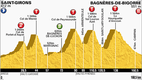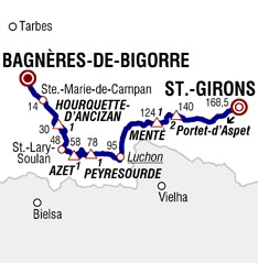 ![]() dimanche 7 juillet 2013 ![]() (Ariège) : Saint-Girons (km 0) - Moulis (km 2) - Luzenac (km 4) - La Forge (km 5.5) - Engomer (km 5.5) - Audressein (km 10) - Argein (km 13) - Aucazein (km 14.5) - Illartein (km 15.5) - Augistrou (km 17.5) - Orgibet (km 18) - Augirein (près de) (km 20) - Saint-Lary (km 22.5) - (Haute-Garonne) : Portet-d'Aspet (km 26) - Col de Portet d'Aspet (km 28.5-GPM2) - Pont de l'Oule (km 32.5) - Couledoux (km 34.5) - Ger de Boutx (km 38) - Col de Menté (km 44-GPM1) - La Chapelle (km 50) - Boutx (km 50.5) - Lez (près de) (km 53) - Saint-Béat (km 54) - Marignac (km 57) - Cierp-Gaud (km 58) - Anos (km 61) - Lège (près de) (km 64) - Bagnères-de-Luchon (km 73-sprint) - Saint-Aventin (km 81) - Castillon-de-Larboust (près de) (km 82.5) - Cazeaux-de-Larboust (km 82.5) - Garin (km 84) - Col de Peyresourde (km 90-sprint) - (Hautes-Pyrénées) : Loudervielle (près de) (km 95.5) - Estarvielle (km 97.5) - Armenteule (km 99) - Aranvielle (km 100) - Loudenvielle (km 101) - Génos (km 102.5) - Col de Val Louron-Azet (km 110.5-GPM1) - Azet (km 114.5) - Estensan (km 117) - Sailhan (km 118) - Saint-Lary-Soulan (km 120.5) - Bourisp (km 123) - Guchan (près de) (km 125.5) - Guchen (km 127) - La Hourquette d'Ancizan (km 138-GPM1) - La Séoube (km 151) - Sainte-Marie de Campan (km 154.5) - Rimoula (km 157) - Galade (km 157.5) - Campan (km 160.5) - Beaudéan (km 162) - Bagnères-de-Bigorre (km 165.5) - Gerde (km 165.5) - entrée Bagnères-de-Bigorre (km 167.5) - Bagnères-de-Bigorre (km 168.5). ![]() ![]() ![]() Vidéo DailyMotion ![]() Étape : ![]() 1. Daniel Martin (Irl) en 4h43'03" (moy: 35.718 km/h) 2. Jakob Fuglsang (Dan) 3. Michal Kwiatkowski (Pol) à 20" 4. Daniel Moreno (Esp) 5. Joaquim Rodriguez (Esp) 6. Cadel Evans (Aus) 7. Wouter Poels (Hol) 8. Bauke Mollema (Hol) 9. Daniel Navarro (Esp) 10. Maxime Monfort (Bel) 11. Alejandro Valverde (Esp) 12. Andy Schleck (Lux) 13. Alberto Contador (Esp) 14. Christopher Froome (Gbr) 15. Roman Kreuziger (Tch) 16. Mikel Nieve (Esp) 17. Laurens Ten Dam (Hol) 18. Jean-Christophe Péraud (Fra) 19. Nairo Alexander Quintana (Col) 20. Rui Alberto Costa (Por) 21. Hubert Dupont (Fra) 22. Robert Gesink (Hol) à 25" 23. Steve Morabito (Sui) 24. Romain Bardet (Fra) à 3'54" 25. Jon Izagirre (Esp) 26. Igor Anton (Esp) 27. Cyril Gautier (Fra) 28. Michael Rogers (Aus) 29. José Rodolfo Serpa (Col) 30. Sylvain Chavanel (Fra) à 7'07" 31. Davide Malacarne (Ita) 32. Damiano Cunego (Ita) 33. Andrew Talansky (Usa) 34. Bart De Clercq (Bel) 35. Ruben Plaza (Esp) 36. Simon Clarke (Aus) 37. Marcus Burghardt (All) à 7'57" 38. Pierre Rolland (Fra) 39. Jens Voigt (All) 40. Alexey Lutsenko (Kaz) 41. Jan Bakelants (Bel) 42. Arthur Vichot (Fra) à 11'38" 43. Mikel Astarloza (Esp) 44. Juan José Oroz (Esp) 45. Christophe Le Mével (Fra) 46. Laurent Didier (Lux) 47. Maxime Méderel (Fra) 48. Lars-Petter Nordhaug (Nor) 49. Przemyslaw Niemiec (Pol) 50. Peter Velits (Svq) 51. Tom Dumoulin (Hol) 52. Enrico Gasparotto (Ita) 53. Imanol Erviti (Esp) 54. Jonathan Castroviejo (Esp) 55. Jesus Hernandez (Esp) 56. John Gadret (Fra) 57. Eduard Vorganov (Rus) 58. Sep Vanmarcke (Bel) à 17'59" 59. Ryder Hesjedal (Can) 60. Richie Porte (Aus) 61. Yury Trofimov (Rus) 62. Bram Tankink (Hol) à 18'59" 63. Alexis Vuillermoz (Fra) 64. Sergey Lagutin (Ouz) 65. Johannes Fröhlinger (All) 66. Thomas De Gendt (Bel) 67. Simon Gerrans (Aus) 68. Pavel Brutt (Rus) à 20'26" 69. Murilo Antonio Fischer (Bre) 70. Kévin Reza (Fra) 71. David Veilleux (Can) 72. Tony Gallopin (Fra) 73. Manuel Quinziato (Ita) 74. Matteo Tosatto (Ita) 75. Lars Ytting Bak (Dan) 76. Pierrick Fedrigo (Fra) 77. Sergio Miguel Paulinho (Por) 78. Aliaksandr Kuschynski (Blr) 79. Alberto Losada (Esp) 80. Andrey Amador (Crc) 81. José Joaquin Rojas (Esp) à 22'43" 82. Brent Bookwalter (Usa) 83. Luis Angel Mate (Esp) 84. Manuele Mori (Ita) 85. Fabio Sabatini (Ita) 86. Tejay Van Garderen (Usa) 87. Haimar Zubeldia (Esp) 88. Philippe Gilbert (Bel) 89. Gatis Smukulis (Let) 90. Daryl Impey (Afs) 91. Michael Albasini (Sui) 92. Francesco Gavazzi (Ita) 93. Maarten Wynants (Bel) 94. Juan Antonio Flecha (Esp) 95. Sébastien Minard (Fra) 96. Daniele Bennati (Ita) 97. Adam Hansen (Aus) 98. Brice Feillu (Fra) 99. Simon Geschke (All) 100. John Degenkolb (All) 101. Peter Kennaugh (Gbr) 102. Geraint Thomas (Gbr) 103. Matteo Trentin (Ita) 104. Alessandro De Marchi (Ita) 105. Peter Sagan (Svq) 106. Tom Danielson (Usa) 107. Arnold Jeannesson (Fra) 108. Jérémy Roy (Fra) 109. Yukiya Arashiro (Jap) 110. Johnny Hoogerland (Hol) à 25'12" 111. Kristjan Koren (Slo) 112. Julien Simon (Fra) 113. Frederik Willems (Bel) 114. Stuart O'Grady (Aus) 115. Andreas Klöden (All) 116. Julien El Farès (Fra) 117. Lars Boom (Hol) 118. Alan Marangoni (Ita) 119. Romain Sicard (Fra) 120. Elia Favilli (Ita) 121. Svein Tuft (Can) 122. Rein Taaramäe (Est) 123. Roy Curvers (Hol) 124. Moreno Moser (Ita) 125. Albert Timmer (Hol) 126. Guillaume Levarlet (Fra) 127. Marcel Kittel (All) 128. Matthew Harley Goss (Aus) 129. Brett Lancaster (Aus) 130. Thibaut Pinot (Fra) 131. Cameron Meyer (Aus) 132. Blel Kadri (Fra) 133. Alexandre Geniez (Fra) 134. Tony Martin (All) 135. Jonathan Hivert (Fra) 136. Yohann Gène (Fra) 137. Niki Terpstra (Hol) à 26'20" 138. Roberto Ferrari (Ita) 139. Ian Stannard (Gbr) 140. Maciej Bodnar (Pol) 141. Mark Cavendish (Gbr) 142. Danny Van Poppel (Hol) 143. André Greipel (All) 144. Brian Vandborg (Dan) 145. Egoitz Garcia (Esp) 146. Koen De Kort (Hol) 147. Tom Veelers (Hol) 148. Markel Irizar (Esp) 149. Boy Van Poppel (Hol) 150. Gert Steegmans (Bel) 151. Davide Cimolai (Ita) 152. Gregory Henderson (Nzl) 153. Marcel Sieberg (All) 154. Christophe Riblon (Fra) 155. Jack Bauer (Nzl) 156. Nicolas Roche (Irl) 157. Cyril Lemoine (Fra) 158. Lieuwe Westra (Hol) 159. William Bonnet (Fra) 160. Jérôme Cousin (Fra) 161. Jérôme Coppel (Fra) 162. Alexander Kristoff (Nor) 163. David Millar (Gbr) 164. Anthony Delaplace (Fra) 165. Edvald Boasson Hagen (Nor) 166. Da