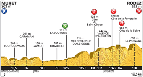 ![]() vendredi 17 juillet 2015 ![]() 12h40 (Haute-Garonne) : D74 Muret (km 0) - Venerque (km 0) - Espanès (km 4.5) - Les Crouzat-Pérès (km 5.5) - D24 Montbrun-Lauragais (km 7) - Baroux (km 10.5) - Montgiscard (km 12) - D31 Fourquevaux (près de) (km 19.5) - Préserville (km 22.5) - D18 Fontenilles (km 27.5) - D38 Maureville (km 31) - D11 Caraman (km 36) - Vendine (km 44) - (Tarn) : D87 En Célazard (km 49.5) - Lacougotte-Cadoul (près de) (km 53) - Lavaur (km 58.5) - Le Grès (km 63.5) - D631 Saint-Sernin (km 70.5) - Larmès (km 72.5) - Briatexte (km 73.5) - Graulhet (km 79) - Le Pont-Vieux (km 90.5) - Laboutarie (km 92.5-sprint) - D612 Mousquette (km 101) - D74 Mouzieys-Teulet (km 110.5) - Bessoulet (km 113.5) - Villefranche-d'Albigeois (km 115.5) - D74 Ambialet (km 127) - Côte de Saint-Cirgue (km 131-GPM3) - Levergnassou (km 132.5) - Valence-d'Albigeois (km 137) - D903 La Barraque (km 142) - (Aveyron) : Courviala (km 145.5) - Saint-Jean-Delnous (km 147) - Réquista (km 150) - D902 Côte de la Pomparie (km 156.5-GPM4) - La Bernadie (km 161) - Laselve (km 162.5) - La Rosière-Basse (km 165.5) - Côte de la Selve (km 167) - La Baraque-de-Bégon (km 168) - Loupis (km 169) - Cassagnes-Bégonhès (km 171.5) - La Pendarie (km 175.5) - Pont-de-Grandfuel (km 178.5) - La Burgayrolle (km 179.5) - Bonnecombe (km 183.5) - Le Devez (km 186.5) - La Primaube (km 188) - D888 La Boissonnade (km 191.5) - La Mouline (km 193) - D212 Le Lachet (km 193.5) - Olemps (près de) (km 194.5) - La Mouline (km 195) - Rodez / entrée (km 196) - D84 Rodez / Av. de Saint-Pierre (km 198.5). ![]() ![]() ![]() Vidéo DailyMotion ![]() Étape : ![]() 1. Greg Van Avermaet (Bel) en 4h43'42" (moy : 41.980 km/h) 2. Peter Sagan (Svq) 3. Jan Bakelants (Bel) à 3" 4. John Degenkolb (All) à 7" 5. Paul Martens (All) 6. Christopher Froome (Gbr) 7. Vincenzo Nibali (Ita) 8. Alberto Contador (Esp) 9. Alejandro Valverde (Esp) 10. Tejay Van Garderen (Usa) 11. Tony Gallopin (Fra) 12. Nairo Alexander Quintana (Col) 13. Robert Gesink (Hol) 14. Geraint Thomas (Gbr) 15. Zdenek Stybar (Tch) à 17" 16. Warren Barguil (Fra) 17. Michael Matthews (Aus) 18. Mathias Frank (Sui) 19. Pierre Rolland (Fra) 20. Wilco Kelderman (Hol) à 24" 21. Tanel Kangert (Est) à 28" 22. Armindo Fonseca (Fra) 23. José Herrada (Esp) 24. Serge Pauwels (Bel) 25. Romain Bardet (Fra) 26. Mikaël Chérel (Fra) 27. Samuel Sanchez (Esp) 28. Cyril Gautier (Fra) à 37" 29. Thomas De Gendt (Bel) 30. Edvald Boasson Hagen (Nor) 31. Andrew Talansky (Usa) à 42" 32. Thibaut Pinot (Fra) 33. Jarlinson Pantano (Col) à 45" 34. Alexander Kristoff (Nor) 35. Arnaud Démare (Fra) à 47" 36. Michele Scarponi (Ita) à 57" 37. Mark Cavendish (Gbr) à 58" 38. Filippo Pozzato (Ita) 39. Eduardo Sepulveda (Arg) à 7" 40. Nelson Felipe Oliveira (Por) à 58" 41. Luis Angel Mate (Esp) 42. Lars Ytting Bak (Dan) 43. Kristjan Koren (Slo) à 1'13" 44. Laurens Ten Dam (Hol) à 1'16" 45. Nicolas Roche (Irl) 46. Benoît Vaugrenard (Fra) à 1'18" 47. Stef Clement (Hol) à 1'23" 48. Reinardt Janse Van Rensburg (Afs) à 1'25" 49. Steven Kruijswijk (Hol) à 1'26" 50. Julien Vermote (Bel) à 1'28" 51. Jérémy Roy (Fra) 52. Adriano Malori (Ita) à 1'33" 53. Michal Golas (Pol) à 1'58" 54. Sylvain Chavanel (Fra) 55. Jan Barta (Tch) 56. Alexis Vuillermoz (Fra) 57. Tiago José Machado (Por) 58. Michael Schär (Sui) 59. Haimar Zubeldia (Esp) 60. Steve Morabito (Sui) 61. Reto Hollenstein (Sui) 62. Ruben Plaza (Esp) 63. Bob Jungels (Lux) 64. Adam Yates (Gbr) 65. Angelo Tulik (Fra) à 2'14" 66. Lieuwe Westra (Hol) à 2'19" 67. Roman Kreuziger (Tch) 68. Stephen Cummings (Gbr) 69. Bram Tankink (Hol) 70. Matteo Trentin (Ita) à 2'22" 71. Bryan Coquard (Fra) à 2'24" 72. Winner Andrew Anacona (Col) 73. Marco Haller (Aut) 74. Marcel Wyss (Sui) à 2'27" 75. Jérôme Coppel (Fra) 76. Rigoberto Uran (Col) 77. Gorka Izagirre (Esp) à 2'32" 78. Jonathan Castroviejo (Esp) 79. Emanuel Buchmann (All) à 2'41" 80. Romain Sicard (Fra) à 2'49" 81. Daniel Teklehaimanot (Ery) à 2'52" 82. Pierrick Fedrigo (Fra) à 3'04" 83. Jacques Janse Van Rensburg (Afs) à 3'09" 84. Simon Geschke (All) à 3'16" 85. Alexandre Geniez (Fra) à 3'36" 86. Matthieu Ladagnous (Fra) 87. Alberto Losada (Esp) à 3'41" 88. Bauke Mollema (Hol) à 7" 89. Perrig Quemeneur (Fra) à 4'00" 90. Matteo Bono (Ita) à 4'26" 91. Rafael Valls (Esp) 92. Pierre-Luc Périchon (Fra) à 4'53" 93. Thomas Voeckler (Fra) à 5'03" 94. Geoffrey Soupe (Fra) à 5'21" 95. Pieter Weening (Hol) à 5'31" 96. Jean-Christophe Péraud (Fra) à 5'44" 97. Nathan Haas (Aus) 98. Markel Irizar (Esp) à 5'55" 99. Brice Feillu (Fra) 100. Martin Elmiger (Sui) 101. Wouter Poels (Hol) à 5'59" 102. Daniel Martin (Irl) à 6'07" 103. Simon Yates (Gbr) à 6'50" 104. José João Mendes (Por) à 7'44" 105. Julien Simon (Fra) à 8'11" 106. Rohan Dennis (Aus) à 8'13" 107. Kristijan Durasek (Cro) à 8'28" 108. José Rodolfo Serpa (Col) 109. Damiano Caruso (Ita) 110. Danilo Wyss (Sui) 111. Anthony Delaplace (Fra) 112. Florian Vachon (Fra) 113. Nicolas Edet (Fra) 114. Yohann Gène (Fra) 115. Leopold König (Tch) à 8'54" 116. Koen De Kort (Hol) à 9'43" 117. Luke Rowe (Gbr) 118. Giampaolo Caruso (Ita) 119. Richie Porte (Aus) 120. Daniel Navarro (Esp) 121. Ryder Hesjedal (Can) 122. Joaquin Rodriguez (Esp) 123. Merhawi Kudus Ghebremedhin (Ery) 124. Florian Sénéchal (Fra) 125. Louis Meintjes (Afs) 126. Michael Rogers (Aus) 127. Jacopo Guarnieri (Ita) à 10'03" 128. Daniel Oss (Ita) 129. Dmitriy Gruzdev (Kaz) 130. Manuel Quinziato (Ita) à 11'22" 131. Arnaud Gérard (Fra) 132. Paul Voss (All) à 11'24" 133. Matteo Tosatto (Ita) 134. Grégory Rast (Sui) 135. Luke Durbridge (Aus) 136. Svein Tuft (Can) 137. Ian Stannard (Gbr) à 11'26" 138. Rafal Majka (Pol) 139. Michal Kwiatkowski (Pol) 140. Bartosz Huzarski (Pol) 141. Damien Gaudin (Fra) 142. Peter Kennaugh (Gbr) à 12'03" 143. Dylan Van Baarle (Hol) à 12'10" 144. Jos Van Emden (Hol) 145. Adam Hansen (Aus) 146. Davide Cimolai (Ita) 147. Andriy Grivko (Uk