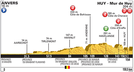 ![]() lundi 6 juillet 2015 ![]() 13h40 (Anvers) : N10 Anvers (km 0) - Lier (lkm 4.5) - Koningshooikt (km 10) - Berlaar-Heikant (km 15.5) - (Brabant flamand) : Begijnendijk (km 27.5) - Aarschot (km 31.5) - Rillaar (km 37.) - Tielt-Winge (km 42) - Meensel-Kiezegem (47.5) - Glabbeek (km 50.5) - N29 Bunsbeek (km 54.5) - Sint-Margriet-Houtem (km 56.5) - Tirlemont (km 57.5) - N64 Bost (près de) (km 64.5) - (Brabant wallon) : Opheylissem (km 70.5) - Linsmeau (km 72.5) - (Liège) : Lincent (km 75) - N80 Hannut (km 84) - Moxhe (km 86) - Burdinne (près de) (km 91.5) - (Namur) : Bierwart (km 95.5) - N921 Velaine (km 101) - Seilles (km 102 - Andenne (km 105) - Côte de Bohisseau (km 109-GPM4) - Bousalle (km 109.5) - N698 Perwez (km 113) - Haillot (km 115.5) - Ohey (km 117.5) - N983 Evelette (km 122.5) - Havelange (km 128) - (Liège) : N636 Pailhe (km 132) - Pont-de-Bonne (km 136.5) - Ereffe (km 141) - Grand-Marchin (km 143) - Côte d'Ereffe (km 143-GPM4) - Marchin (km 145) - N641 Huy (km 150.5) - Côte de Cherave (km 154-GPM4) - N698 Ahin (km 155.5) - Huy (km 156.5) - Huy / Mur de Huy (km 159.5-GPM3). ![]() ![]() ![]() Vidéo DailyMotion ![]() Étape : ![]() 1. Joaquin Rodriguez (Esp) en 3h26'54" (moy: 46.254 km/h) 2. Christopher Froome (Gbr) 3. Alexis Vuillermoz (Fra) à 4" 4. Daniel Martin (Irl) à 5" 5. Tony Gallopin (Fra) à 8" 6. Tejay Van Garderen (Usa) à 11" 7. Vincenzo Nibali (Ita) 8. Simon Yates (Gbr) 9. Nairo Alexander Quintana (Col) 10. Bauke Mollema (Hol) 11. Alejandro Valverde (Esp) 12. Alberto Contador (Esp) à 18" 13. Julian David Arredondo (Col) à 19" 14. Robert Gesink (Hol) à 22" 15. Greg Van Avermaet (Bel) 16. Jean-Christophe Péraud (Fra) à 24" 17. Warren Barguil (Fra) 18. Julien Simon (Fra) à 28" 19. Rigoberto Uran (Col) à 34" 20. Pierre Rolland (Fra) à 36" 21. Romain Bardet (Fra) 22. Louis Meintjes (Afs) 23. Cyril Gautier (Fra) 24. Ryder Hesjedal (Can) à 40" 25. Andrew Talansky (Usa) 26. Tony Martin (All) 27. Peter Sagan (Svq) 28. Eduardo Sepulveda (Arg) à 45" 29. Daniel Navarro (Esp) 30. Merhawi Kudus Ghebremedhin (Ery) 31. Zdenek Stybar (Tch) à 52" 32. Adam Yates (Gbr) à 1'00" 33. Giampaolo Caruso (Ita) à 1'05" 34. Jan Bakelants (Bel) à 1'08" 35. Samuel Sanchez (Esp) à 1'10" 36. Geraint Thomas (Gbr) 37. Luis Angel Mate (Esp) 38. Rui Alberto Costa (Por) à 1'13" 39. Tiago José Machado (Por) 40. Haimar Zubeldia (Esp) à 1'15" 41. Paul Voss (All) à 1'20" 42. Michele Scarponi (Ita) à 1'22" 43. Bob Jungels (Lux) à 1'25" 44. Leopold König (Tch) 45. Armindo Fonseca (Fra) 46. Paul Martens (All) 47. Alberto Losada (Esp) 48. Roman Kreuziger (Tch) 49. Michal Kwiatkowski (Pol) 50. Dominik Nerz (All) 51. Jacques Janse Van Rensburg (Afs) à 1'29" 52. Thibaut Pinot (Fra) à 1'33" 53. Gorka Izagirre (Esp) 54. Georg Preidler (Aut) à 1'39" 55. Jakob Fuglsang (Dan) 56. Rafal Majka (Pol) à 1'52" 57. Emanuel Buchmann (All) à 1'59" 58. Wilco Kelderman (Hol) 59. Mikaël Chérel (Fra) 60. Steven Kruijswijk (Hol) 61. Bartosz Huzarski (Pol) 62. Romain Sicard (Fra) 63. Mathias Frank (Sui) 64. Sylvain Chavanel (Fra) 65. Jérémy Roy (Fra) à 2'08" 66. Edvald Boasson Hagen (Nor) 67. Steve Morabito (Sui) 68. Anthony Delaplace (Fra) 69. Marcel Wyss (Sui) à 2'17" 70. Jarlinson Pantano (Col) à 2'29" 71. Kristjan Koren (Slo) 72. Florian Vachon (Fra) 73. Tanel Kangert (Est) 74. Simon Geschke (All) à 2'53" 75. Pierrick Fedrigo (Fra) à 3'03" 76. Tim Wellens (Bel) à 3'24" 77. Jan Barta (Tch) à 3'58" 78. Stef Clement (Hol) 79. Richie Porte (Aus) 80. Koen De Kort (Hol) 81. Stephen Cummings (Gbr) 82. Serge Pauwels (Bel) 83. Ivan Basso (Ita) 84. Michael Rogers (Aus) 85. Perrig Quemeneur (Fra) 86. José Herrada (Esp) 87. Christophe Riblon (Fra) 88. Lars Ytting Bak (Dan) 89. Ben Gastauer (Lux) 90. Daniel Teklehaimanot (Ery) 91. Reto Hollenstein (Sui) 92. Bram Tankink (Hol) à 4'14" 93. Thomas Voeckler (Fra) 94. José Rodolfo Serpa (Col) à 4'16" 95. Jérôme Coppel (Fra) 96. Brice Feillu (Fra) 97. Angelo Tulik (Fra) à 4'24" 98. Julien Vermote (Bel) à 4'33" 99. Reinardt Janse Van Rensburg (Afs) 100. Nathan Haas (Aus) à 4'36" 101. Daniel Oss (Ita) à 5'17" 102. Ruben Plaza (Esp) à 6'13" 103. Nicolas Roche (Irl) 104. Kristijan Durasek (Cro) 105. Pieter Weening (Hol) 106. Matteo Bono (Ita) 107. Nelson Felipe Oliveira (Por) 108. Ramunas Navardauskas (Lit) 109. Michal Golas (Pol) 110. Michael Albasini (Sui) à 6'25" 111. Rafael Valls (Esp) à 6'35" 112. Michael Schär (Sui) à 6'49" 113. Danilo Wyss (Sui) 114. Damiano Caruso (Ita) 115. Grégory Rast (Sui) 116. Winner Andrew Anacona (Col) à 7'17" 117. Laurent Didier (Lux) 118. Arnaud Gérard (Fra) à 8'01" 119. Peter Kennaugh (Gbr) à 8'11" 120. Andriy Grivko (Ukr) à 8'14" 121. Rein Taaramäe (Est) à 8'26" 122. Rohan Dennis (Aus) à 9'40" 123. Jonathan Castroviejo (Esp) à 10'15" 124. Luca Paolini (Ita) à 10'38" 125. Luke Durbridge (Aus) à 10'45" 126. Dylan Van Baarle (Hol) 127. Thomas De Gendt (Bel) 128. Matthieu Ladagnous (Fra) 129. Roy Curvers (Hol) 130. Lieuwe Westra (Hol) 131. Frédéric Brun (Fra) 132. Wouter Poels (Hol) 133. Alexandre Geniez (Fra) 134. Lars Boom (Hol) à 10'48" 135. Benoît Vaugrenard (Fra) à 10'54" 136. Ramon Sinkeldam (Hol) 137. Marcel Sieberg (All) 138. Nicolas Edet (Fra) 139. Albert Timmer (Hol) 140. Bryan Coquard (Fra) 141. Matthias Brändle (Aut) 142. Bryan Nauleau (Fra) 143. Geoffrey Soupe (Fra) 144. Adam Hansen (Aus) 145. Jos Van Emden (Hol) 146. André Greipel (All) 147. Sébastien Chavanel (Fra) 148. Sep Vanmarcke (Bel) 149. Martin Elmiger (Sui) 150. Arnaud Démare (Fra) 151. Stijn Devolder (Bel) 152. Dmitriy Gruzdev (Kaz) 153. Matteo Trentin (Ita) 154. Adriano Malori (Ita) 155. Imanol Erviti (Esp) 156. Damien Gaudin (Fra) à 11'02" 157. Florian Sénéchal (Fra) 158. Yohann Gène (Fra) 159. Pierre-Luc Périchon (Fra) 160. Jack Bauer (Nzl) 161. Jens Debusschere (Bel) 162. José João Mendes (Por) 163. Tyler Farrar (Usa) 164. Daniele Bennati (Ita) à 11'09" 165. Matteo Tosatto (Ita) 166. Michael Valgren An