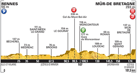 ![]() samedi 11 juillet 2015 ![]() 13h00 (Ile-et-Vilaine) : Rennes - La Vizeule - Montgermont - D637 Rennes (km 0) - La Brosse (km 1.5) - La Chapelle-des-Fougeretz (près de) (km 2) - Montgerval (km 4) - D27 Gévezé (km 8.5) - Langouet (près de) (km 14) - Saint-Gondran (près de) (km 16.5) - La Chapelle-Chaussée (km 17) - La Guimondais (km 20.5) - Bécherel (km 25) - D20 Saint-Pern (près de) (km 29) - D220 Médréac (km 35) - Quédillac (km 41.5) - D664 Saint-Méen-le-Grand (km 50) - D125 Le Pied-de-Mouton (km 54) - (Côtes-d'Armor) : D19 Boudélan (km 58.5) - Plumaugat (km 61) - Cambel (km 65.5) - Broons (km 67.5) - D25 Les Champs-Quéneux (km 71) - Sévignac (km 74.5) - La Touche-Joubin (km 78) - Plénée-Jugon (km81) - D792 Le Gouray (près de) (km 89.5) - Collinée (près de) (km 93.5) - D6 Les Vaux-Régniers (km 97.5) - Col du Mont Bel-Air (km 99.5-GPM4) - Lesmadières (km 104) - Trédaniel (km 104.5) - Le Vau-Lorrain (km 106) - D768 Moncontour / gare (km 108.5-sprint) - La Tantouille (km 112) - Montorien (km 117) - Plouguenast (km 119) - Saint-Théo (km 122) - La Motte (km 125) - D700 Loudeac (km 130) - Saint-Maudan (km 140.5) - La Croix de la Ville-Gestin (km 142) - Saint-Roch (km 143) - (Morbihan) : D11 Saint-Samson (km 144) - Rohan (km 145.5) - D125 Saint-Gouvry (km 148) - Gueltas (km 150.5) - La Croix-de-Bolan (km 155.5) - Saint-Gérand (km 158) - Le Couëdic (km 160) - (Côtes-d'Armor) : D767 Saint-Jean (km 172.5) - Mûr de Bretagne (km 174) - D35 Pont-Quémer (km 176.5) - D767 Mûr de Bretagne (km 181.5). ![]() ![]() ![]() Vidéo DailyMotion ![]() Étape : ![]() 1. Alexis Vuillermoz (Fra) en 4h20'55" (moy: 41.737 km/h) 2. Daniel Martin (Irl) à 5" 3. Alejandro Valverde (Esp) à 10" 4. Peter Sagan (Svq) 5. Tony Gallopin (Fra) 6. Greg Van Avermaet (Bel) 7. Adam Yates (Gbr) 8. Christopher Froome (Gbr) 9. Bauke Mollema (Hol) 10. Tejay Van Garderen (Usa) 11. Julian David Arredondo (Col) 12. Joaquin Rodriguez (Esp) 13. Warren Barguil (Fra) 14. Alberto Contador (Esp) 15. Rigoberto Uran (Col) 16. Roman Kreuziger (Tch) 17. Nairo Alexander Quintana (Col) 18. Julien Simon (Fra) 19. Robert Gesink (Hol) 20. Pierre Rolland (Fra) 21. Gorka Izagirre (Esp) 22. Samuel Sanchez (Esp) 23. Simon Yates (Gbr) 24. Jean-Christophe Péraud (Fra) 25. Mathias Frank (Sui) 26. Paul Martens (All) 27. Bob Jungels (Lux) 28. Serge Pauwels (Bel) à 20" 29. Haimar Zubeldia (Esp) 30. Vincenzo Nibali (Ita) 31. Andrew Talansky (Usa) 32. Thibaut Pinot (Fra) à 25" 33. Jan Bakelants (Bel) à 31" 34. Romain Bardet (Fra) 35. Paul Voss (All) à 33" 36. Dominik Nerz (All) 37. Cyril Gautier (Fra) 38. Zdenek Stybar (Tch) 39. Marcel Wyss (Sui) 40. Simon Geschke (All) 41. Jarlinson Pantano (Col) à 41" 42. Thomas Voeckler (Fra) 43. Luis Angel Mate (Esp) à 45" 44. Steven Kruijswijk (Hol) 45. Eduardo Sepulveda (Arg) 46. Pierrick Fedrigo (Fra) 47. Rui Alberto Costa (Por) 48. Geraint Thomas (Gbr) à 59" 49. Tiago José Machado (Por) 50. Giampaolo Caruso (Ita) 51. Alberto Losada (Esp) 52. Tanel Kangert (Est) 53. Edvald Boasson Hagen (Nor) à 1'02" 54. Sylvain Chavanel (Fra) 55. Anthony Delaplace (Fra) 56. Jakob Fuglsang (Dan) à 1'09" 57. Georg Preidler (Aut) 58. Laurens Ten Dam (Hol) 59. Jacques Janse Van Rensburg (Afs) 60. Mikaël Chérel (Fra) 61. Winner Andrew Anacona (Col) 62. Rafael Valls (Esp) à 1'13" 63. Daniel Teklehaimanot (Ery) 64. Armindo Fonseca (Fra) 65. Jan Barta (Tch) à 1'40" 66. Brice Feillu (Fra) 67. José João Mendes (Por) 68. Stef Clement (Hol) à 2'00" 69. Jérôme Coppel (Fra) 70. Koen De Kort (Hol) 71. Bram Tankink (Hol) 72. Ruben Plaza (Esp) 73. Geoffrey Soupe (Fra) à 2'08" 74. Steve Morabito (Sui) 75. Andriy Grivko (Ukr) à 2'26" 76. Markel Irizar (Esp) 77. Roy Curvers (Hol) 78. Sep Vanmarcke (Bel) à 2'36" 79. Jonathan Castroviejo (Esp) à 2'49" 80. Kristjan Koren (Slo) 81. Kristijan Durasek (Cro) 82. Benoît Vaugrenard (Fra) 83. Ben Gastauer (Lux) 84. Reinardt Janse Van Rensburg (Afs) 85. Reto Hollenstein (Sui) 86. Perrig Quemeneur (Fra) à 3'05" 87. Bryan Nauleau (Fra) 88. Jos Van Emden (Hol) à 3'08" 89. Filippo Pozzato (Ita) 90. José Herrada (Esp) 91. Ramon Sinkeldam (Hol) 92. Luke Durbridge (Aus) 93. Wilco Kelderman (Hol) 94. Tom Leezer (Hol) 95. Adam Hansen (Aus) 96. Michal Kwiatkowski (Pol) 97. Richie Porte (Aus) 98. Johan Vansummeren (Bel) à 3'26" 99. Tim Wellens (Bel) 100. Matthieu Ladagnous (Fra) à 3'34" 101. Matteo Bono (Ita) à 3'59" 102. José Rodolfo Serpa (Col) 103. Arnaud Gérard (Fra) à 4'02" 104. Florian Vachon (Fra) 105. Christophe Laporte (Fra) 106. Leopold König (Tch) à 4'07" 107. Alexandre Geniez (Fra) à 4'28" 108. Marco Haller (Aut) à 4'39" 109. Thomas De Gendt (Bel) à 4'52" 110. Bryan Coquard (Fra) 111. Arnaud Démare (Fra) à 4'55" 112. Angelo Tulik (Fra) 113. Pieter Weening (Hol) à 5'14" 114. Daniele Bennati (Ita) à 5'42" 115. Michael Rogers (Aus) 116. Ryder Hesjedal (Can) 117. Damiano Caruso (Ita) 118. Alexander Kristoff (Nor) 119. Tyler Farrar (Usa) à 6'12" 120. Ivan Basso (Ita) 121. Julien Vermote (Bel) 122. Grégory Rast (Sui) 123. Stijn Devolder (Bel) 124. Florian Sénéchal (Fra) 125. Lars Ytting Bak (Dan) 126. Michael Valgren Andersen (Dan) 127. Daniel Navarro (Esp) 128. Rein Taaramäe (Est) 129. Marcel Sieberg (All) 130. André Greipel (All) 131. Jacopo Guarnieri (Ita) 132. Stephen Cummings (Gbr) 133. Imanol Erviti (Esp) 134. Daniel Oss (Ita) 135. Ian Stannard (Gbr) 136. Matteo Trentin (Ita) à 7'58" 137. Matteo Tosatto (Ita) 138. Christophe Riblon (Fra) 139. Nicolas Roche (Irl) 140. Michael Schär (Sui) 141. Manuel Quinziato (Ita) 142. Rohan Dennis (Aus) 143. Sébastien Chavanel (Fra) 144. Jérémy Roy (Fra) 145. Lars Boom (Hol) 146. Danilo Wyss (Sui) 147. Martin Elmiger (Sui) 148. Lieuwe Westra (Hol) 149. Pierre-Luc Périchon (Fra) 150. Matthias Brändle (Aut) 151. Laurent Didier (Lux) 152. Michal Golas (Pol) 153. Rafal Majka (Pol) 154. Bartosz Huzarski (Pol) 155. John Degenkolb (All) 156. Jens Debusschere (Bel) 157. Yohann Gène (Fra) 158. Sam Ben