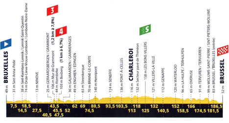 ![]() BRUXELLES > BRUXELLES, 194.5 km samedi 6 juillet 2019 ![]() 12h00 (BELGIQUE) - Bruxelles (km 0) - Anderlecht (km 1.5) - (Brabant Flamand) : N282 Lennik-St-Quentin (km 14.5) - (Flandre-Orientale) - Ninove (km 27.5) - N45 Smeerebbe-Vloerzegem (km 34) - Grammont (km 40.5) - Mur de Grammont (km 43.5-GPM3) - Atembeke (km 45.5) - Bosberg (km 47.5-GPM4) - (Brabant-Flamand) : Gammerages (km 52) - (Hainaut) : Enghien (km 62) - N55 Hoves (km 64) - Braine-le-Comte (km 74.5) - N534 Plan incliné de Ronquières (km 86-ravitaillement) - Seneffe (km 93.5) - Pont-à-Celles (km 103.5) - Charleroi (km 113) - Thiméon (secteur pavé) (km 118) - Les Bons Villers (km 125) - (Brabant-Wallon) - Villers-la-Ville (km 132) - Genappe(km 140.5) - Braine-l'Alleud (km 151) - N27 Waterloo (km 152) - N253 La Hulpe (km 158.5) - (Brabant-Flamand) : Overijse (km 166) - Tervuren (km 174.5) - (Bruxelles-Capitale) : Woluwe-Saint-Pierre (km 181.5) - Etterbeek (km 185.5) - Bruxelles (km 194.5). ![]() ![]() ![]() vidéo DailyMotion ![]() Étape : ![]() 1. Mike Teunissen (Hol) en 4h22'47" (moy : 44.409 km/h) 2. Peter Sagan (Slq) 3. Caleb Ewan (Aus) 4. Giacomo Nizzolo (Ita) 5. Sonny Colbrelli (Ita) 6. Michael Matthews (Aus) 7. Matteo Trentin (Ita) 8. Oliver Naesen (Bel) 9. Elia Viviani (Ita) 10. Jasper Stuyven (Bel) 11. Greg Van Avermaet (Bel) 12. Alberto Bettiol (Ita) 13. Andrea Pasqualon (Ita) 14. Alexander Kristoff (Nor) 15. Amund Grøndahl Jansen (Nor) 16. Wout Van Aert (Bel) 17. Christophe Laporte (Fra) 18. André Greipel (All) 19. Daryl Impey (Afs) 20. Guillaume Martin (Fra) 21. Julian Alaphilippe (Fra) 22. Yoann Offredo (Fra) 23. Simon Clarke (Aus) 24. Vincenzo Nibali (Ita) 25. Patrick Bevin (Nzl) 26. Xandro Meurisse (Bel) 27. Sebastian Langeveld (Hol) 28. Jasper De Buyst (Bel) 29. Julien Simon (Fra) 30. Maximiliano Richeze (Arg) 31. Jens Debusschere (Bel) 32. Edvald Boasson Hagen (Nor) 33. Kasper Asgreen (Dan) 34. Cees Bol (Hol) 35. Ivan Garcia (Esp) 36. Marcus Burghardt (All) 37. Niccolò Bonifazio (Ita) 38. Michael Mørkøv (Dan) 39. Jan Tratnik (Slo) 40. Nicolas Roche (Irl) 41. Rick Zabel (All) 42. Patrick Konrad (Aut) 43. Jasper Philipsen (Bel) 44. Jens Keukeleire (Bel) 45. Michael Hepburn (Aus) 46. Adam Yates (Gbr) 47. Roman Kreuziger (Tch) 48. Dylan Teuns (Bel) 49. Roger Kluge (All) 50. Yves Lampaert (Bel) 51. Enric Mas (Esp) 52. Tiesj Benoot (Bel) 53. Nairo Quintana (Col) 54. Alexey Lutsenko (Kaz) 55. Pierre Luc Perichon (Fra) 56. Steven Kruijswijk (Hol) 57. Andrey Amador (Crc) 58. Lilian Calmejane (Fra) 59. Nils Politt (All) 60. Giulio Ciccone (Ita) 61. Daniel Oss (Ita) 62. Odd Christian Eiking (Nor) 63. Frederik Backaert (Bel) 64. Richie Porte (Aus) 65. David Gaudu (Fra) 66. Rudy Molard (Fra) 67. Alejandro Valverde (Esp) 68. Michael Valgren Andersen (Dan) 69. Fabio Felline (Ita) 70. Maximilian Schachmann (All) 71. Gregor Mühlberger (Aut) 72. Matthieu Ladagnous (Fra) 73. Wilco Kelderman (Hol) 74. Gorka Izagirre Insausti (Esp) 75. Tejay Van Garderen (Usa) 76. Thibaut Pinot (Fra) 77. Romain Sicard (Fra) 78. Tony Martin (All) 79. Luis León Sanchez (Esp) 80. Gianni Moscon (Ita) 81. Egan Bernal (Col) 82. Rigoberto Uran (Col) 83. Marc Soler (Esp) 84. Sergio Henao (Col) 85. Reinardt Janse Van Rensburg (Afs) 86. Lennard Kämna (All) 87. Michael Woods (Can) 88. Mikel Landa (Esp) 89. Mikael Cherel (Fra) 90. Laurens De Plus (Bel) 91. Hugo Houle (Can) 92. Romain Bardet (Fra) 93. Jakob Fuglsang (Dan) 94. Nelson Oliveira (Por) 95. Paul Ourselin (Fra) 96. Magnus Cort Nielsen (Dan) 97. Omar Fraile (Esp) 98. Mads Würtz Schmidt (Dan) 99. Anthony Turgis (Fra) 100. Natnael Berhane (Ery) 101. Warren Barguil (Fra) 102. José Gonçalves (Por) 103. Ilnur Zakarin (Rus) 104. Luke Durbridge (Aus) 105. Fabio Aru (Ita) 106. Vegard Stake Laengen (Nor) 107. Søren Kragh Andersen (Dan) 108. Rein Taaramäe (Est) 109. Tanel Kangert (Est) 110. Alex Dowsett (Gbr) 111. Geraint Thomas (Gbr) 112. Michael Schär (Sui) 113. Damiano Caruso (Ita) 114. Joseph Rosskopf (Usa) 115. Simon Geschke (All) 116. Koen de Kort (Hol) 117. Julien Bernard (Fra) 118. Nicolas Edet (Fra) 119. Nikias Arndt (All) 120. Rui Costa (Por) 121. Daniel Martin (Irl) 122. Kevin Van Melsen (Bel) 123. Wout Poels (Hol) 124. Tim Wellens (Bel) 125. Stefan Küng (Sui) 126. Amael Moinard (Fra) 127. Anthony Delaplace (Fra) 128. Aime De Gendt (Bel) 129. Pello Bilbao (Esp) 130. Thomas De Gendt (Bel) 131. Maxime Monfort (Bel) 132. Ben King (Usa) 133. Anthony Roux (Fra) 134. William Bonnet (Fra) 135. Mathias Frank (Sui) 136. Tony Gallopin (Fra) 137. Sébastien Reichenbach (Sui) 138. Lars Bak (Dan) 139. Maxime Bouet (Fra) 140. Tom Scully (Nzl) 141. Jesus Herrada (Esp) 142. Stephen Cummings (Gbr) 143. Fabien Grellier (Fra) 144. Anthony Perez (Fra) 145. Chad Haga (Usa) 146. Simon Yates (Gbr) 147. Jack Haig (Aus) 148. Florian Vachon (Fra) 149. Kevin Ledanois (Fra) 150. Imanol Erviti (Esp) 151. Alessandro De Marchi (Ita) 152. Serge Pauwels (Bel) 153. Sven Erik Bystrøm (Nor) 154. Dylan van Baarle (Hol) 155. Bauke Mollema (Hol) 156. Alexis Gougeard (Fra) 157. Niki Terpstra (Hol) 158. Rohan Dennis (Aus) 159. Matej Mohoric (Slo) 160. Michal Kwiatkowski (Pol) 161. Christopher Juul Jensen (Dan) 162. Luke Rowe (Gbr) 163. Stéphane Rossetto (Fra) à 3:06 164. Alexis Vuillermoz (Fra) 165. Toms Skujins (Let) à 3:32 166. Carlos Verona (Esp) 167. Marco Haller (Aut) 168. Elie Gesbert (Fra) à 4:11 169. Dries Devenyns (Bel) 170. Lukasz Wisniowski (Pol) 171. Jonathan Castroviejo (Esp) à 4:11 172. George Bennett (Nzl) 173. Emanuel Buchmann (All) 174. Lukas Pöstlberger (Aut) à 4'36" 175. Dylan Groenewegen (Hol) 176. Benoit Cosnefroy (Fra) Prix de la combativité : Stéphane Rossetto (Fra) Classement général : ![]() 1. Mike Teunissen (Hol) en 4h22'37" 2. Peter Sagan (Slq) à 4" 3. Caleb Ewan (Aus) à 6" 4. Giacomo Nizzolo (Ita) à 10" 5. Sonny Colbrelli (Ita) 6. Michael Matthews (Aus) 7. Matteo Trentin (Ita) 8. Oliver Naesen (Bel) 9. Elia Viviani (Ita) 10. Jasper Stuyven (Bel) 11. Greg Van Avermaet (Bel