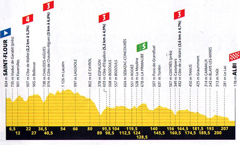 ![]() lundi 15 juillet 2019 ![]() 12h10 (Cantal) : Saint-Flour (km 0) - Viaduc de Garabit (près de) (km 6.5) - D13 Faverolles (km 12) - D13 Côte de Mallet (km 22-GPM4) - Fridefont (km 23.5) - Bellevue (km 27) - Chaudes-Aigues (km 36.5) - Côte de Chaudes-Aigues (km 40.5-GPM3) - Maisonneuve (km 46.5) - (Aveyron) : Lacalm (km 54) - Laguiole (km 66) - La Vitarelle (km 76.5) - Le Cayrol (km 80) - Espalion (km 89) - D920 Côte d'Espalion (km 95.5-GPM3) - Bozouls (km 98.5-ravitaillement) -D988 Sébazac-Concourès (km 112.5) - D224 Onet-le-Château (km 117.5) - D988 Rodez (km 98) - La Mouline (km 124) - D888 La Primaube (km 128.5-sprint) - Pont-de-Grandfuel (km 140) - Tonkin (km 145.5) - Centrés (près de) (km 156) - D10 Castelpers (km 160.5) - Côte de la Malric (km 164.5-GPM3) - (Tarn) : D53 Tréban (km 172.5) - Tanus (km 174.5) - La Croix de Mille (km 183) - Carmaux (km 189.5) - Blaye-les-Mines (km 193) - Taix (km 200) - Cité des Homps (km 201) - D25 Saint-Sernin-les-Mailhoc (km 205) - Le Lac (km 207) - Albi / Place du Vigan (km 217.5). ![]() ![]() ![]() vidéo DailyMotion ![]() Étape : ![]() 1. Wout Van Aert (Bel) en 4h49'39" (moy : 45.054 km/h) 2. Elia Viviani (Ita) 3. Caleb Ewan (Aus) 4. Michael Matthews (Aus) 5. Peter Sagan (Slq) 6. Jasper Philipsen (Bel) 7. Sonny Colbrelli (Ita) 8. Matteo Trentin (Ita) 9. Oliver Naesen (Bel) 10. Greg Van Avermaet (Bel) 11. Julian Alaphilippe (Fra) 12. Geraint Thomas (Gbr) 13. Mads Würtz Schmidt (Dan) 14. Egan Bernal (Col) 15. Maximiliano Richeze (Arg) 16. Patrick Konrad (Aut) 17. Cees Bol (Hol) 18. Steven Kruijswijk (Hol) 19. Enric Mas (Esp) 20. Romain Bardet (Fra) 21. Nairo Quintana (Col) 22. Emanuel Buchmann (All) 23. Adam Yates (Gbr) 24. Roman Kreuziger (Tch) 25. Daniel Martin (Irl) 26. Warren Barguil (Fra) 27. Alejandro Valverde (Esp) 28. Mikael Cherel (Fra) 29. Anthony Turgis (Fra) à 10" 30. Sven Erik Bystrøm (Nor) à 14" 31. Nikias Arndt (All) à 18" 32. Tony Gallopin (Fra) à 22" 33. Yves Lampaert (Bel) à 29" 34. Kasper Asgreen (Dan) 35. Marcus Burghardt (All) à 30" 36. Kevin Ledanois (Fra) à 37" 37. Søren Kragh Andersen (Dan) à 44" 38. Wilco Kelderman (Hol) à 46" 39. Lennard Kämna (All) à 1'01" 40. Dylan van Baarle (Hol) à 1'04" 41. Daniel Oss (Ita) à 1'33" 42. Luke Rowe (Gbr) 43. Gianni Moscon (Ita) à 1'35" 44. Bauke Mollema (Hol) à 1'40" 45. Thibaut Pinot (Fra) 46. Xandro Meurisse (Bel) 47. Edvald Boasson Hagen (Nor) 48. Rigoberto Uran (Col) 49. Richie Porte (Aus) 50. Alexey Lutsenko (Kaz) 51. Jakob Fuglsang (Dan) 52. Jasper De Buyst (Bel) 53. Rudy Molard (Fra) 54. Sébastien Reichenbach (Sui) à 1'44" 55. Mikel Landa (Esp) à 2'09" 56. Michael Hepburn (Aus) 57. Giulio Ciccone (Ita) 58. Fabio Aru (Ita) 59. Sergio Henao (Col) 60. Amund Grøndahl Jansen (Nor) 61. Andrea Pasqualon (Ita) 62. Guillaume Martin (Fra) 63. Ben King (Usa) à 2'14" 64. Ilnur Zakarin (Rus) 65. Reinardt Janse Van Rensburg (Afs) 66. David Gaudu (Fra) à 2'17" 67. Anthony Roux (Fra) 68. Mathias Frank (Sui) 69. Fabio Felline (Ita) 70. Jack Haig (Aus) 71. Alexander Kristoff (Nor) à 2'19" 72. Mike Teunissen (Hol) 73. Laurens De Plus (Bel) 74. Roger Kluge (All) à 2'27" 75. Andrey Amador (Crc) 76. Jens Keukeleire (Bel) 77. Imanol Erviti (Esp) à 2'46" 78. Michal Kwiatkowski (Pol) à 3'31" 79. Gregor Mühlberger (Aut) à 4'40" 80. Vincenzo Nibali (Ita) à 5'04" 81. Marc Soler (Esp) à 5'58" 82. Nelson Oliveira (Por) 83. Julien Bernard (Fra) à 8'32" 84. Maximilian Schachmann (All) à 8'45" 85. Thomas De Gendt (Bel) à 9'41" 86. Tim Wellens (Bel) 87. Maxime Monfort (Bel) 88. Alberto Bettiol (Ita) 89. Nils Politt (All) 90. Natnael Berhane (Ery) 91. Matthieu Ladagnous (Fra) 92. Alexis Vuillermoz (Fra) 93. Frederik Backaert (Bel) 94. Jonathan Castroviejo (Esp) 95. Odd Christian Eiking (Nor) 96. Michael Schär (Sui) 97. Tiesj Benoot (Bel) 98. Joseph Rosskopf (Usa) 99. Tom Scully (Nzl) 100. Lars Bak (Dan) 101. Michael Woods (Can) 102. Kevin Van Melsen (Bel) 103. Ivan Garcia (Esp) 104. Omar Fraile (Esp) 105. Aime De Gendt (Bel) 106. Dylan Groenewegen (Hol) 107. André Greipel (All) 108. Lukasz Wisniowski (Pol) 109. Lukas Pöstlberger (Aut) 110. José Gonçalves (Por) 111. Rein Taaramäe (Est) 112. Paul Ourselin (Fra) 113. Rui Costa (Por) 114. Jan Tratnik (Slo) 115. Pello Bilbao (Esp) 116. Tanel Kangert (Est) 117. Simon Yates (Gbr) 118. Julien Simon (Fra) 119. Pierre Luc Perichon (Fra) 120. Serge Pauwels (Bel) 121. Michael Mørkøv (Dan) 122. Vegard Stake Laengen (Nor) 123. Dries Devenyns (Bel) 124. Giacomo Nizzolo (Ita) 125. Stefan Küng (Sui) 126. Daryl Impey (Afs) 127. Chad Haga (Usa) 128. Magnus Cort Nielsen (Dan) 129. Hugo Houle (Can) 130. Koen de Kort (Hol) 131. Fabien Grellier (Fra) 132. George Bennett (Nzl) 133. Luke Durbridge (Aus) 134. Lilian Calmejane (Fra) 135. Florian Vachon (Fra) 136. Amael Moinard (Fra) 137. Elie Gesbert (Fra) 138. Dylan Teuns (Bel) 139. Nicolas Roche (Irl) 140. Damiano Caruso (Ita) 141. Jesus Herrada (Esp) 142. Niccolò Bonifazio (Ita) 143. Carlos Verona (Esp) 144. Jasper Stuyven (Bel) 145. Wout Poels (Hol) 146. Maxime Bouet (Fra) 147. Stéphane Rossetto (Fra) 148. Niki Terpstra (Hol) 149. Luis León Sanchez (Esp) 150. Gorka Izagirre Insausti (Esp) 151. Alexis Gougeard (Fra) 152. Matej Mohoric (Slo) 153. Michael Valgren Andersen (Dan) 154. Alex Dowsett (Gbr) 155. Simon Geschke (All) 156. Anthony Delaplace (Fra) 157. Benoit Cosnefroy (Fra) 158. Christopher Juul Jensen (Dan) 159. William Bonnet (Fra) 160. Jens Debusschere (Bel) 161. Rohan Dennis (Aus) 162. Stephen Cummings (Gbr) 163. Anthony Perez (Fra) 164. Marco Haller (Aut) 165. Tony Martin (All) 166. Romain Sicard (Fra) 167. Simon Clarke (Aus) 168. Toms Skujins (Let) 169. Sebastian Langeveld (Hol) 170. Yoann Offredo (Fra) à 21'02" 171. Rick Zabel (All) Prix de la combativité : Natnael Berhane (Ery) Classement général : ![]() 1. Julian Alaphilippe (Fra) en 43h27'15" 2. Geraint Thomas (Gbr) à 1'12" 3. Egan Bernal (Col) à 1'16" 4. Steven Kruijswijk (Hol) à 1'27" 5. Emanuel Buchm