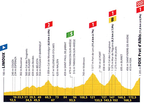 ![]() dimanche 21 juillet 2019 ![]() 12h05 (Aude) : D118 Limoux (km 0) - Alet-les-Bains (près de) (km 6) - Couiza (km 12.5) - D12 Montazels (km 15) - Espéraza (km 16) - D12 Fa (km 19) - Saint-Jean-de-Paracol (près de) (km 29) - Col des Tougnets (km 31) - D121 Puivert (km 35) - (Ariège) : D117 Col del Teil (km 43) - Bélesta (km 45) - D9 Fougax-et-Barrineuf (km 49) - Col de Montségur (km 60-GPM2) - Montferrier (km 65) - Villeneuve-d'Olmes (km 67) - D117 Nalzen (km 73) - Celles (km 93) - Saint-Paul-de-Jarrat (km 84) - D618 Mercus (km 89) - Bompas (km 91) - Tarascon-sur-Ariège (km 93-sprint-ravitaillement) - Niaux (km 98) - Capoulet-et-Junac km 100) - Vicdessos (km 108) - D18 Port de Lers (km 121-GPM1) - Étang de Lers (près de) (km 124) - Massat (km 137) - D618 Espiès (km 140) - Col des Caougnous (km 143) - D17 Mur de Péguère (km 147-GPM1-bonus) Saint-Pierre-de-Rivière (km 168) - Foix (km 172) - D421 Raygnac (km 174.5) - Reins (km 176) - Prat d'Albis (km 185-GPM1). ![]() ![]() ![]() vidéo DailyMotion ![]() Étape : ![]() 1. Simon Yates (Gbr) en 4h47'04" (moy : 38.667 km/h) 2. Thibaut Pinot (Fra) à 33" 3. Mikel Landa (Esp) 4. Emanuel Buchmann (All) à 51" 5. Egan Bernal (Col) 6. Lennard Kämna (All) à 1'03" 7. Geraint Thomas (Gbr) à 1'22" 8. Steven Kruijswijk (Hol) 9. Alejandro Valverde (Esp) 10. Richie Porte (Aus) à 1'30" 11. Julian Alaphilippe (Fra) à 1'49" 12. Wout Poels (Hol) 13. Warren Barguil (Fra) à 1'54" 14. Jakob Fuglsang (Dan) 15. Guillaume Martin (Fra) à 2'08" 16. Sébastien Reichenbach (Sui) à 2'55" 17. Roman Kreuziger (Tch) à 2'58" 18. Romain Bardet (Fra) 19. Nairo Quintana (Col) 20. Rigoberto Uran (Col) 21. Daniel Martin (Irl) à 3'38" 22. Xandro Meurisse (Bel) à 3'45" 23. Tanel Kangert (Est) 24. Tony Gallopin (Fra) à 4'02" 25. Simon Geschke (All) à 4'24" 26. Fabio Aru (Ita) à 4'45" 27. David Gaudu (Fra) à 5'20" 28. Jack Haig (Aus) à 6'24" 29. Alexey Lutsenko (Kaz) à 6'59" 30. Jonathan Castroviejo (Esp) à 9'59" 31. Rudy Molard (Fra) à 10'06" 32. Julien Bernard (Fra) 33. Jesus Herrada (Esp) à 10'08" 34. George Bennett (Nzl) à 11'42" 35. Michael Woods (Can) 36. Gregor Mühlberger (Aut) 37. Giulio Ciccone (Ita) à 12'57" 38. Pello Bilbao (Esp) 39. Dylan Van Baarle (Hol) à 13'37" 40. Fabien Grellier (Fra) à 13'53" 41. Mikael Cherel (Fra) 42. Laurens De Plus (Bel) à 14'21" 43. Stéphane Rossetto (Fra) à 16'12" 44. Ben King (Usa) 45. Michael Valgren Andersen (Dan) 46. Omar Fraile (Esp) à 18'56" 47. Marc Soler (Esp) 48. Oliver Naesen (Bel) 49. Alexis Vuillermoz (Fra) à 19'15" 50. Paul Ourselin (Fra) 51. Anthony Delaplace (Fra) 52. Michael Schär (Sui) à 20'27" 53. Stefan Küng (Sui) 54. Fabio Felline (Ita) à 21'16" 55. Gianni Moscon (Ita) à 21'37" 56. Anthony Roux (Fra) à 22'17" 57. Magnus Cort Nielsen (Dan) à 23'19" 58. Andrey Amador (Crc) à 24'18" 59. Carlos Verona (Esp) à 24'30" 60. Imanol Erviti (Esp) 61. Adam Yates (Gbr) 62. Nelson Oliveira (Por) 63. Hugo Houle (Can) 64. Nicolas Roche (Irl) 65. Søren Kragh Andersen (Dan) 66. Simon Clarke (Aus) à 24'43" 67. Dries Devenyns (Bel) à 25'43" 68. Thomas De Gendt (Bel) à 26'48" 69. Serge Pauwels (Bel) 70. Nils Politt (All) 71. Daniel Oss (Ita) 72. Florian Vachon (Fra) 73. Frederik Backaert (Bel) 74. Koen De Kort (Hol) 75. Kevin Ledanois (Fra) 76. Pierre Luc Périchon (Fra) 77. Elie Gesbert (Fra) 78. Nikias Arndt (All) 79. Rui Costa (Por) 80. Ilnur Zakarin (Rus) 81. Alexis Gougeard (Fra) 82. Maxime Bouet (Fra) 83. Jens Keukeleire (Bel) 84. Tiesj Benoot (Bel) 85. Jasper Stuyven (Bel) 86. Daryl Impey (Afs) 87. Mathias Frank (Sui) 88. Andrea Pasqualon (Ita) 89. Anthony Perez (Fra) 90. Chad Haga (Usa) 91. Alberto Bettiol (Ita) 92. Christopher Juul Jensen (Dan) 93. Patrick Konrad (Aut) 94. Jan Tratnik (Slo) 95. Toms Skujins (Lat) 96. Joseph Rosskopf (Usa) 97. Anthony Turgis (Fra) 98. Romain Sicard (Fra) 99. Damiano Caruso (Ita) 100. Amael Moinard (Fra) 101. Luis Leon Sanchez (Esp) 102. José Gonçalves (Por) 103. Michael Matthews (Aus) 104. Yves Lampaert (Bel) 105. Rein Taaramäe (Est) 106. Matthieu Ladagnous (Fra) 107. Stephen Cummings (Gbr) 108. Elia Viviani (Ita) à 27'59" 109. Bauke Mollema (Hol) à 28'40" 110. Luke Rowe (Gbr) à 28'41" 111. Michal Kwiatkowski (Pol) 112. Niccolò Bonifazio (Ita) 113. Tim Wellens (Bel) à 29'03" 114. Kasper Asgreen (Dan) à 29'57" 115. Matteo Trentin (Ita) à 30'08" 116. Sonny Colbrelli (Ita) 117. Gorka Izagirre (Esp) 118. Vincenzo Nibali (Ita) 119. Edvald Boasson Hagen (Nor) à 30'28" 120. Jasper De Buyst (Bel) à 30'30" 121. Yoann Offredo (Fra) 122. Alexander Kristoff (Nor) 123. Maxime Monfort (Bel) 124. Mads Würtz Schmidt (Dan) 125. Kevin Van Melsen (Bel) 126. Natnael Berhane (Eri) 127. Marco Haller (Aut) 128. Lars Bak (Dan) 129. Michael Hepburn (Aus) 130. Mike Teunissen (Hol) 131. Matej Mohoric (Slo) 132. Wilco Kelderman (Hol) 133. William Bonnet (Fra) 134. Luke Durbridge (Aus) 135. Tom Scully (Nzl) 136. Dylan Groenewegen (Hol) 137. Dylan Teuns (Bel) 138. Greg Van Avermaet (Bel) 139. Lukasz Wisniowski (Pol) 140. Sergio Henao (Col) 141. Lilian Calmejane (Fra) 142. Benoit Cosnefroy (Fra) 143. Cees Bol (Hol) 144. Amund Grøndahl Jansen (Nor) 145. Tony Martin (All) 146. Odd Christian Eiking (Nor) 147. Vegard Stake Laengen (Nor) 148. Sven Erik Bystrøm (Nor) 149. Julien Simon (Fra) 150. Reinardt Janse Van Rensburg (Afs) 151. Lukas Pöstlberger (Aut) 152. Sebastian Langeveld (Hol) 153. Alex Dowsett (Gbr) 154. Jens Debusschere (Bel) 155. André Greipel (All) 156. Aime De Gendt (Bel) 157. Ivan Garcia (Esp) 158. Enric Mas (Esp) à 31'29" 159. Marcus Burghardt (All) à 31'31" 160. Caleb Ewan (Aus) 161. Roger Kluge (All) 162. Michael Mørkøv (Dan) à 31'34" 163. Peter Sagan (Slq) 164. Maximiliano Richeze (Arg) à 32'26" Bonus km 147 - Mur de Péguère 1. Simon Geschke (All) 8" 2. Simon Yates (Gbr) 6" 3. Romain Bardet (Fra) 4" Prix de la combativité : Mikel Landa (Esp) Classement général : ![]() 1. Julian Alaphilippe (Fra) en 61h00'22" 2. Geraint Thomas (Gbr) 