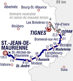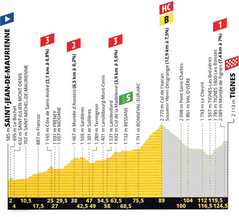 ![]() vendredi 26 juillet 2019 ![]() Étape arrêtée au col de l'Iseran en raison des conditions météo et de l'état des routes. 13h45 (Savoie) : Saint-Jean-de-Maurienne (km 0) - Le Bochet (km 2) - Saint-Julien-Mont-Denis (km 4) - D1006 Saint-Martin-de-la-Porte (près de) (km 9) - Saint-Michel-de-Maurienne (km 10.5) - Francoz (km 17.5) - D215 Côte de Saint-André (km 25-GPM3) - Saint-André (près de) (km 25.5) - Freney (km 27) - D1006 Fourneaux (km 28.5) - Modane (km 29.5) - D215 Le Bourget (près de) (km 33.5) - Montée d'Aussois (km 38-GPM2) - Aussois (km 38) - D83 Sardières (km 42.5) - Sollières (km 47) - D1006 Termignon (km 49) - Lanslebourg-Mont-Cenis (km 54.5) - D115 Lanslevillard (km 58) - D902 Col de La Madeleine (km 63.5) - Bessans (km 68.5) - Bonneval-sur-Arc (km 75.5) - Col de l'Iseran (km 89-GPM.HC-S.H.D) - Val-d'Isère (km 104) - La Paille (km 106.5) - La Reculaz (km 109) - Le Villaret du Nial (km 109.5) - Le Chevril (km 112) - D87B Tignes les Brévières (km 116.5) - Tignes 1800 Les Boisses (km 119.5) - D87A Tignes-Le Lac (km 124) - Montée de Tignes (km 124.5-GPM1) - Tignes Le Val Claret (km 126) - Tignes /Av. de la Grande Motte (km 126.5). ![]() ![]() Le parcours neutralisé est grisé ![]() vidéo DailyMotion ![]() Étape : En raison des conditions météorologiques et de l'impraticabilité de la route, l'étape est arrêtée et les temps pris au col de l'Iseran pour le classement général. Pas de vainqueur d'étape. . Egan Bernal (Col) en 2h40'31" . Simon Yates (Gbr) à 13" . Warren Barguil (Fra) à 40" . Laurens De Plus (Bel) à 1'03" . Steven Kruijswijk (Hol) . Geraint Thomas (Gbr) . Emanuel Buchmann (All) . Vincenzo Nibali (Ita) . Rigoberto Uran (Col) . Mikel Landa (Esp) . Richie Porte (Aus) à 1'20" . Gregor Mühlberger (Aut) . Alejandro Valverde (Esp) à 1'49" . Damiano Caruso (Ita) . Wout Poels (Hol) . Julian Alaphilippe (Fra) à 2'10" . Guillaume Martin (Fra) à 2'29" . Andrey Amador (Crc) à 2'45" . Nairo Quintana (Col) . Magnus Cort Nielsen (Dan) . David Gaudu (Fra) à 3'30" . Giulio Ciccone (Ita) à 4'09" . Romain Bardet (Fra) . Jesus Herrada (Esp) . Enric Mas (Esp) à 4'34" . Alexey Lutsenko (Kaz) à 5'12" . Sébastien Reichenbach (Sui) à 6'15" . Mikael Cherel (Fra) à 8'15" . Fabio Aru (Ita) . Julien Bernard (Fra) . Dylan Van Baarle (Hol) à 9'36" . Michael Schär (Sui) . Ilnur Zakarin (Rus) . Daniel Martin (Irl) . Michael Woods (Can) . Patrick Konrad (Aut) . George Bennett (Nzl) . Tony Gallopin (Fra) . Roman Kreuziger (Tch) à 10'32" . Toms Skujins (Let) . Ben King (Usa) à 11'02" . Hugo Houle (Can) . Dylan Teuns (Bel) . Tanel Kangert (Est) . Pello Bilbao (Esp) . Natnael Berhane (Eri) . Jasper Stuyven (Bel) . Joseph Rosskopf (Usa) à 11'08" . Gorka Izagirre (Esp) à 11'10" . Elie Gesbert (Fra) . Mathias Frank (Sui) . Maxime Bouet (Fra) à 12'25" . Anthony Delaplace (Fra) à 13'28" . Anthony Perez (Fra) . Alexis Vuillermoz (Fra) à 13'38" . Thomas De Gendt (Bel) à 13'56" . Lennard Kämna (All) à 14'29" . Pierre Luc Périchon (Fra) à 15'05" . Marc Soler (Esp) à 17'00" . Carlos Verona (Esp) . Daryl Impey (Afs) . Christopher Juul Jensen (Dan) . Sonny Colbrelli (Ita) . Jonathan Castroviejo (Esp) . Luke Durbridge (Aus) . Michael Matthews (Aus) . Fabio Felline (Ita) . Peter Sagan (Slq) . Matteo Trentin (Ita) . Daniel Oss (Ita) . Omar Fraile (Esp) . Alberto Bettiol (Ita) . Simon Geschke (All) . Nelson Oliveira (Por) . Rui Costa (Por) . Amael Moinard (Fra) . Aime De Gendt (Bel) . Lukasz Wisniowski (Pol) . Jack Haig (Aus) à 17'14" . Stefan Küng (Sui) à 18'30" . Niccolò Bonifazio (Ita) . Kasper Asgreen (Dan) à 18'34" . Dries Devenyns (Bel) à 19'31" . Tim Wellens (Bel) à 20'34" . Nils Politt (All) à 20'36" . Serge Pauwels (Bel) à 20'45" . Marcus Burghardt (All) à 21'54" . Matthieu Ladagnous (Fra) à 22'03" . Mads Schmidt Würtz (Dan) à 25'23" . Yoann Offredo (Fra) . Andrea Pasqualon (Ita) . Tiesj Benoot (Bel) . Frederik Backaert (Bel) . Bauke Mollema (Hol) . Kevin Ledanois (Fra) . Stéphane Rossetto (Fra) . Maxime Monfort (Bel) . Mike Teunissen (Hol) . Xandro Meurisse (Bel) . Koen De Kort (Hol) . Odd Christian Eiking (Nor) . Romain Sicard (Fra) . Elia Viviani (Ita) . Ivan Garcia (Esp) . Kevin Van Melsen (Bel) . Michael Hepburn (Aus) . Michal Kwiatkowski (Pol) . Paul Ourselin (Fra) . Gianni Moscon (Ita) . Alexis Gougeard (Fra) . Jens Keukeleire (Bel) . Rudy Molard (Fra) . Lilian Calmejane (Fra) . Imanol Erviti (Esp) . Oliver Naesen (Bel) . William Bonnet (Fra) . Julien Simon (Fra) . Nicolas Roche (Irl) . Jan Tratnik (Slo) . Marco Haller (Aut) . Caleb Ewan (Aus) . Matej Mohoric (Slo) . Greg Van Avermaet (Bel) . Michael Valgren Andersen (Dan) . Florian Vachon (Fra) . André Greipel (All) . Anthony Turgis (Fra) . Jasper De Buyst (Bel) . Rein Taaramäe (Est) . Chad Haga (Usa) . Tom Scully (Nzl) . José Gonçalves (Por) . Fabien Grellier (Fra) . Anthony Roux (Fra) . Stephen Cummings (Gbr) . Benoit Cosnefroy (Fra) . Vegard Stake Laengen (Nor) . Simon Clarke (Aus) . Dylan Groenewegen (Hol) . Sebastian Langeveld (Hol) . Michael Mørkøv (Dan) . Reinardt Janse Van Rensburg (Afs) . Sergio Henao (Col) . Sven Erik Bystrøm (Nor) . Alexander Kristoff (Nor) . Amund Grøndahl Jansen (Nor) . Maximiliano Richeze (Arg) à 25'51" . Yves Lampaert (Bel) à 26'12" . Nikias Arndt (All) . Edvald Boasson Hagen (Nor) . Lars Bak (Dan) . Adam Yates (Gbr) à 26'24" . Roger Kluge (All) . Alex Dowsett (Gbr) à 30'54" . Jens Debusschere (Bel) à 34'15" Abandon : Thibaut Pinot (Fra) Prix de la combativité : non attribué Classement général : ![]() 1. Egan Bernal (Col) en 78h00'42" 2. Julian Alaphilippe (Fra) à 48" 3. Geraint Thomas (Gbr) à 1'16" 4. Steven Kruijswijk (Hol) à 1'28" 5. Emanuel Buchmann (All) à 1'55" 6. Mikel Landa (Esp) à 4'35" 7. Rigoberto Uran (Col) à 5'14" 8. Nairo Quintana (Col) à 5'17" 9. Alejandro Valverde (Esp) à 6'25" 10. Richie Porte (Aus) à 6'28" 11. Warren Barguil (Fra) à 7'03" 12. Guillaume Martin (Fra) à 16'18" 13. David Gaudu (Fra) à 20