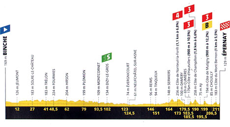 ![]() lundi 8 juillet 2019 ![]() 10h20 (BELGIQUE) -N55 Binche (km 0) - Merbes-le-Château (km 6) - N561 Erquelinnes (km 10) - (FRANCE) - (Nord) : D336 Jeumont (km 12) - Solre-le-Château (km 27) - Trélon (km 41) - D170 Fourmies (km 48.5) - (Aisne) : D963 Hirson (km 62) - D74 Bucilly (km 69) - D376 Piomion (km 79) - D36 Vigneux-Hocquet (km 87.5) - D966 Montcornet (km 93.5) - Dizy-le-Gros (km 102-sprint) - Nizy-le-Comte (km 108.5) - Neufchâtel-sur-Aisne (km 124.5) - (Marne) : D374 Bourgogne-Fresne (km 135.5) - D74 Bétheny (km 143) - Reims (km 146) - Tinqueux (km 151) - D6E3 Les Mesneux (km 155.5) - Sermiers (km 164) - D386 Côte de Nanteuil-la-Forêt (km 173-GPM4) - D22 Fleury-la-Rivière (km 176.5) - Damery (km 179.5) - D1 Cumières (km 183.5) - Côte d'Hautvillers (km 185.5-GPM3) - Côte de Champillon (km 190-GPM3) - D251 Dizy (km 194) - Aÿ (km 195.5) - D201E Côte de Mutigny (km 199-GPM3-bonus) - Mutigny (km 199.5) - Mareuil-sur-Aÿ (km 202.5) - D9 Qiry (près de) (km 205) - D3 Chouilly (km 206.5) - D40A Plumecoq (km 210) - Côte du mont Bernon (km 211) - Épernay / entrée (km 211.5) - Épernay / rue des Coteaux (km 215). ![]() ![]() ![]() vidéo DailyMotion ![]() Étape : ![]() 1. Julian Alaphilippe (Fra) en 4h40'29" (moy : 45.992 km/h) 2. Michael Matthews (Aus) à 26" 3. Jasper Stuyven (Bel) 4. Greg Van Avermaet (Bel) 5. Peter Sagan (Slq) 6. Matteo Trentin (Ita) 7. Sonny Colbrelli (Ita) 8. Xandro Meurisse (Bel) 9. Wout Van Aert (Bel) 10. Thibaut Pinot (Fra) 11. Tiesj Benoot (Bel) 12. Egan Bernal (Col) 13. Geraint Thomas (Gbr) à 31" 14. Jakob Fuglsang (Dan) 15. Guillaume Martin (Fra) 16. Romain Bardet (Fra) 17. Steven Kruijswijk (Hol) 18. Alexey Lutsenko (Kaz) 19. Rudy Molard (Fra) 20. Michael Woods (Can) 21. Rigoberto Uran (Col) 22. Giulio Ciccone (Ita) 23. Vincenzo Nibali (Ita) 24. Patrick Konrad (Aut) 25. Adam Yates (Gbr) 26. Edvald Boasson Hagen (Nor) 27. Wilco Kelderman (Hol) 28. Emanuel Buchmann (All) 29. Mikel Landa (Esp) 30. Alejandro Valverde (Esp) 31. Daniel Martin (Irl) 32. Roman Kreuziger (Tch) 33. Warren Barguil (Fra) 34. Bauke Mollema (Hol) 35. Nairo Quintana (Col) 36. Fabio Felline (Ita) 37. Richie Porte (Aus) 38. Enric Mas (Esp) 39. Maximilian Schachmann (All) 40. David Gaudu (Fra) 41. Rui Costa (Por) 42. Jack Haig (Aus) 43. Tejay Van Garderen (Usa) 44. Nicolas Roche (Irl) 45. Jesus Herrada (Esp) 46. Nicolas Edet (Fra) 47. Rein Taaramäe (Est) 48. Alexis Vuillermoz (Fra) 49. Gregor Mühlberger (Aut) 50. Luis León Sanchez (Esp) 51. Marc Soler (Esp) 52. George Bennett (Nzl) 53. Pello Bilbao (Esp) 54. Daryl Impey (Afs) 55. Sébastien Reichenbach (Sui) à 45" 56. Andrey Amador (Crc) à 49" 57. Alessandro De Marchi (Ita) à 1'01" 58. Michael Valgren Andersen (Dan) à 1'04" 59. Mathias Frank (Sui) à 1'13" 60. Michal Kwiatkowski (Pol) 61. Fabio Aru (Ita) à 1'22" 62. Wout Poels (Hol) à 1'44" 63. Dylan Teuns (Bel) 64. Mikael Cherel (Fra) 65. Gianni Moscon (Ita) à 2'19" 66. Simon Geschke (All) 67. Simon Clarke (Aus) à 3'18" 68. Jonathan Castroviejo (Esp) à 3'32" 69. Joseph Rosskopf (Usa) à 3'42" 70. Nils Politt (All) à 3'51" 71. Ilnur Zakarin (Rus) 72. Jan Tratnik (Slo) 73. Tanel Kangert (Est) 74. Natnael Berhane (Ery) 75. Andrea Pasqualon (Ita) 76. Julien Bernard (Fra) 77. Laurens De Plus (Bel) à 4'09" 78. Lennard Kämna (All) à 4'54" 79. Julien Simon (Fra) 80. Mike Teunissen (Hol) 81. Simon Yates (Gbr) à 6'23" 82. Dries Devenyns (Bel) à 8'28" 83. Omar Fraile (Esp) 84. Hugo Houle (Can) à 8'35" 85. Stefan Küng (Sui) 86. Tony Gallopin (Fra) 87. Maxime Monfort (Bel) 88. Elie Gesbert (Fra) 89. Rohan Dennis (Aus) 90. Sergio Henao (Col) à 8'42" 91. Søren Kragh Andersen (Dan) à 8'43" 92. Matej Mohoric (Slo) 93. Thomas De Gendt (Bel) à 9'26" 94. Odd Christian Eiking (Nor) 95. Mads Würtz Schmidt (Dan) 96. Maxime Bouet (Fra) 97. Nelson Oliveira (Por) 98. Lars Bak (Dan) 99. Anthony Roux (Fra) 100. Lilian Calmejane (Fra) 101. Romain Sicard (Fra) 102. Nikias Arndt (All) 103. Tim Wellens (Bel) à 9'32" 104. Jens Keukeleire (Bel) 105. Anthony Perez (Fra) 106. Reinardt Janse Van Rensburg (Afs) 107. Gorka Izagirre Insausti (Esp) 108. Pierre Luc Perichon (Fra) 109. Yves Lampaert (Bel) à 9'38" 110. Christophe Laporte (Fra) à 9'43" 111. Toms Skujins (Let) 112. Elia Viviani (Ita) à 10'21" 113. Marcus Burghardt (All) 114. Daniel Oss (Ita) 115. Lukas Pöstlberger (Aut) 116. Jasper Philipsen (Bel) à 11'34" 117. Jens Debusschere (Bel) à 13'58" 118. Ivan Garcia (Esp) 119. Yoann Offredo (Fra) 120. Ben King (Usa) 121. Oliver Naesen (Bel) 122. Frederik Backaert (Bel) 123. Paul Ourselin (Fra) 124. Koen de Kort (Hol) 125. Michael Hepburn (Aus) 126. Kevin Van Melsen (Bel) 127. Rick Zabel (All) 128. Damiano Caruso (Ita) 129. Matthieu Ladagnous (Fra) 130. Giacomo Nizzolo (Ita) 131. Patrick Bevin (Nzl) 132. William Bonnet (Fra) 133. Lukasz Wisniowski (Pol) 134. Fabien Grellier (Fra) 135. Michael Schär (Sui) 136. Stéphane Rossetto (Fra) 137. Serge Pauwels (Bel) 138. Carlos Verona (Esp) 139. Luke Durbridge (Aus) 140. Imanol Erviti (Esp) 141. Alex Dowsett (Gbr) 142. Marco Haller (Aut) 143. Christopher Juul Jensen (Dan) 144. Luke Rowe (Gbr) 145. Caleb Ewan (Aus) 146. Niki Terpstra (Hol) 147. José Gonçalves (Por) 148. Alberto Bettiol (Ita) 149. Jasper De Buyst (Bel) 150. Sven Erik Bystrøm (Nor) 151. Chad Haga (Usa) 152. Dylan van Baarle (Hol) 153. Vegard Stake Laengen (Nor) 154. Anthony Turgis (Fra) 155. Florian Vachon (Fra) 156. Kevin Ledanois (Fra) 157. Sebastian Langeveld (Hol) 158. Alexander Kristoff (Nor) 159. Niccolò Bonifazio (Ita) 160. Amael Moinard (Fra) 161. André Greipel (All) 162. Alexis Gougeard (Fra) 163. Anthony Delaplace (Fra) 164. Dylan Groenewegen (Hol) 165. Tony Martin (All) 166. Michael Mørkøv (Dan) 167. Magnus Cort Nielsen (Dan) 168. Aime De Gendt (Bel) 169. Maximiliano Richeze (Arg) 170. Stephen Cummings (Gbr) 171. Amund Grøndahl Jansen (Nor) 172. Benoit Cosnefroy (Fra) 173. Tom Scully (Nzl) 174. Roger Kluge (All) 175. Cees Bol (Hol) 176. Kasper Asgreen (D