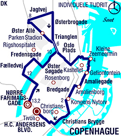 Kongens Nytorv (km 11) - Holmens Kanal (km 11.2) - Niels Juels Gade (km 11.4) - Pont Christian IV (km 11.5) - Christians Brygge (km 11.6) - Vester Voldgade (km 12.3) - Rysensteensgade (km 12.5) -
