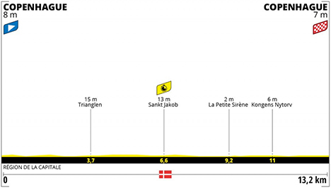 16h00 - (DANEMARK) - Copenhague (km 0) - Frederiksborggade (km 0.7) - Pont de la Reine Louise (km 0.9) - Nørrebrogade (km 1.1) - Fælledvej (km 1.4) - Sankt Hans Torv (km 1.6) - Blegdamsvej (km 1.7) - Fredensgade (km 2.1) - Fredensbro (km 2.4) - Øster Søgade (km 2.6) - Østerbrogade (km 3.3) - Trianglen (km 3.7) - Øster Allé (km 3.8) - Parken Stadium (km 4.2) - Nørre Allé (km 4.9) - Jagtvej (km 5) - Østerbrogade (km 6) - Sankt Jakob (km 6.6-chrono) - Trianglen (km 7) - Dag Hammarskjölds Allé (km 7.4) - Oslo Plads (km 7.9) - Folke Bernadottes Allé (km 8.2) - Kastellet (km 8.5) - Ved Norgesporten (km 8.6) -