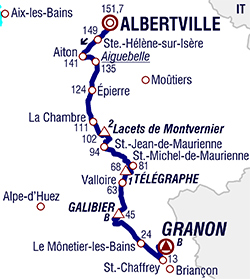 D1006 Aiguebelle (km 16.5) - La Pouille (près de) (km 19.5) - Argentine (près de) (km 24.1) - La Chapelle (près de) (km 32.2) - Les Chavannes-en-Maurienne (près de) (km 34.5) - La Chambre (près de) (km 40.3) - Saint-Avre (près de) (km 41.1) - Pontamafrey (km 46) - D77b Montvernier (km 49.5) - Lacets de Montvernier (km 49.9-GPM2) -