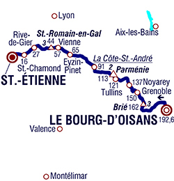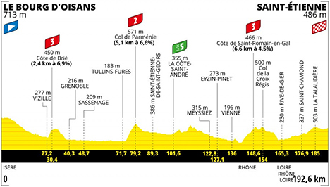 13h20 (Isère) : Le Bourg d'Oisans (km 0 ) - Rochetaillée (km 1.1) - D1091 Livet (près de) (km 7.1) - Rioupéroux (km 10.4) - Les Clavaux (km 13.3) - Gavet (km 13.8) - Séchilienne (km 18.1) - Le Péage de Vizille (km 23.2) - Vizille (km 27.2) - D5 Côte de Brié (km 30.4-GPM3) - Brié (km 31.9) - Tavernolles (km 34.3) - Eybens (km 37) - Grenoble (km 40.3) - D531 Sassenage (km 48.7) - Fontaine (près de) (km 48.7) - Sassenage (km 50) - D1532 Pra-Paris (km 53.3) - Noyarey (km 55.1) - Veurey-Voroize (près de) (km 59.1) - L'Échaillon (km 63.3) - Saint-Quentin-sur-Isère (km 68.6) - D45 Tullins-Fures (km 71.7) - D153 Carr. D73e (km 74.9) - D73e Col de Parménie (km 79.2-GPM2) - Izeaux (km 81.8) - D519 Sillans (km 86.1) - Saint-Étienne-de-Saint-Geoirs (km 89.3) - D518 Brézins (km 93.5) - D519 Le Rival (km 96) - D71 La Côte-Saint-André (km 101.6-sprint) - D518 Col des Crozes (km 105.2) - Chambarand (km 114.5) - Serpollier (près de) (km 118.1) - Meyssiez (km 122.8) - Chez Ollier (km 125.7) - Eyzin-Pinet (km 127.1) - Le Plan de Gemens (km 133.9) - (Vienne) : Vienne (km 136) - (Rhône) : D502 Saint-Romain-en-Gal (km 140.7) - Les Jacquetières (km 143.4) - Pommerieux (km 143.9) - Aizerance (km 145.6) - Les Amaris (km 147.3) - Côte de Saint-Romain-en-Gal (km 148.6-GPM3) - Le Recru (km 151) - Col de La Croix Régis (km 154) - Le Pilon (km 156.2) - Le Fautre (km 158.8) - Trèves (km 160.8) - (Loire) : Balmes de Cenna (près de) (km 163.5) - (Rhône) : D502 Carr. D488 (km 164.2) - D488 La Madeleine (km 164.6) - (Loire) : M88 Saint-Joseph (km 165.3) - Rive-de-Gier (km 165.3) - Lorette (km 170.2) - La Grand'Croix (km 172.2) - L'horme (km 174.2) - Saint-Chamond (km 176.9) - M1498 Sorbiers (km 183.9) - La Talaudière (km 185) - Châteaubon (km 188.3) - La Tour-en-Jarez (km 188.6) - La Croix Maladière (km 198.4) - M11.2 Saint-Étienne (km 190.4) - Saint-Priest-en-Jarez (km 191.4) - Saint-Étienne / Rue Claude Verney-Caron (km 192.6).