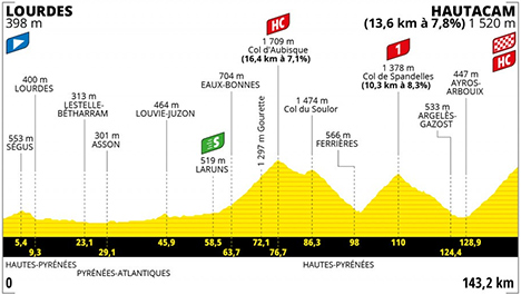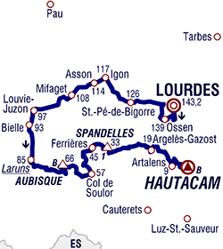 13h40 (Hautes-Pyrénées) : D921b Lourdes (Km 0) - D921 Carr. D13 (km 1.2) - D13 Aspin-en-Lavedan (km 1.9) - Ossen (km 4.3) - Ségus (km 5.4) - Omex (près de) (km 6.1) - Lourdes (km 9.3) - D937 Peyrouse (km 13.6) - Saint-Pé-de-Bigorre (km 17) - (Pyrénées-Atlantiques) : Montaut (km 21.5) - Lestelle-Bétharram (km 23.1) - Igon (km 26.6) - D35 Asson (km 29.1) - Bruges (km 33.4) - Mifaget (km 35.6) - Pédestarrès (km 39.3) - Louvie-Juzon (km 45.9) - D934 Izeste (près de) (km 46.8) - D2934b Bielle (km 50.3) - Lanne-Débat (km 52.7) - D934 Monplaisir (près de) (km 54.2) - Laruns (km 57.6) - Laruns (km 58.5) - D918 Eaux-Bonnes (km 63.7) - Gourette (km 72.1) - Les Crêtes Blanches (km 75) - Cabane de Gados (km 75.5) - Col d'Aubisque (km 76.7) - (Hautes-Pyrénées) : Col du Soulor (km 86.3) - Arbéost (km 94.8) - Hougarou (km 97.8) - Ferrières (km 98) - Las Ganques (km 99.6) - D602 Col de Spandelles (km 110) - Gez (km 122.5) - D102 Argelès-Gazost (km 124.4) - Argelès-Gazost (km 128.4) - D100 Ayros-Arbouix (km 128.9) - Arbouix (km 131.1) - Souin (km 132.8) - Arribat (km 133.5) - Artalens (km 134.4) - Saint-André (km 136.1) - Hourquet (km 140.8) - Hautacam (km 143.2).