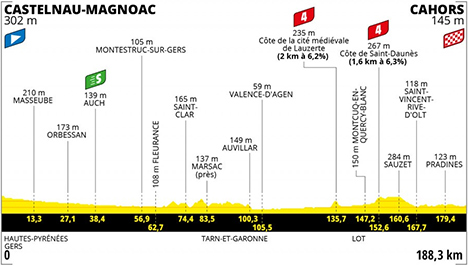13h10 (Hautes-Pyrénées) : D929 Castelnau-Magnoac (km 0) - Harouet (km 2.3) - (Gers) : Chélan (km 3.6) - Pey Crabé (km 5.6) - Panassac (km 8.4) - Bourdets-Haut (km 11.9) - Masseube (km 13.3) - Au Hirat (km 18.7) - Seissan (km 20.5) - Ornézan (km 23.2) - Sansan (près de) (km 25.7) - Orbessan (km 27.1) - Boucagnères (près de) (km 29.3) - Auterive (près de) (km 31.5) - Pavie (km 34.4) - Auch (km 38.4-sprint) - Preignan (km 47.5) - Casteljaloux (km 54.2) - Montestruc-sur-Gers (km 56.9) - Fleurance (km 62.7) - D953 Urdens (près de) (km 67.5) - La Ferrette (km 71.1) - Saint-Clar (km 74.4) - D13 Embarthe (km 78.2) - D13 Carr. D18 (km 78.9) - (Tarn-et-Garonne) : D11 Marsac (près de) (km 83.5) - Poupas (km 86.7) - Lachapelle (près de) (km 89.2) - D11 Carr. D3 (km 93) - D3 Carr. D11 (km 93.2) - Bardigues (km 96.5) - Auvillar (km 100.3) - Espalais (km 102.5) - Valence-d'Agen (km 105.5) - D953 Lalande (km 110.9) - Borde Blanche (km 114.5) - Colonges (km 115) - Fourquet (km 119.1) - Bordeneuve (km 120.6) - Saint-Pierre-de-Najac (km 127.2) - Bayle (près de) (km 130.2) - Lauzerte (km 134.5) - Côte de La Cité Médiévale de Lauzerte (km 135.7-GPM4) - D953 La Martille (près de) (km 139.9) - Guitard (près de) (km 142) - (Lot) : D653 Montcuq-en-Quercy-Blanc (km 147.2) - Saint-Daunès (km 150.6) - D45 Côte de Saint-Daunès (km 152.6) - D45 Carr. D656 (km 156.5) - D656 Lagarde (km 157.1) - Sauzet (km 160.6) - D23 Cambayrac (près de) (km 163.1) - Saint-Vincent-Rive-d'Olt (km 167.7) - Le Cayrou (km 169.7) - D8 Lémouzy (près de) (km 169.8) - Caunezil (km 170.5) - Cels (km 171.9) - Les Bories (km 173.5) - La Cafourque (km 174) - Douelle (km 174.7) - Pradines (km 179.4) - Cahors / Entrée (km 183.7) - Cahors / Bd. Léon Gambetta (km 188.3).