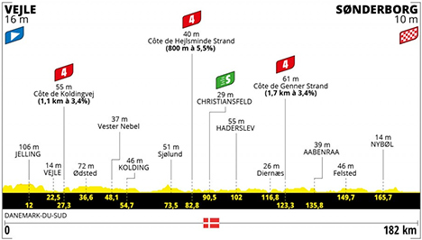 12h35 - (DANEMARK) - R442 Vejle (km 0) - Hørup (km 6.8) - Jelling (km 12) - Fårup Sø (km 14.7) - Jennum (km 16.9) - Slelde (km 19.2) - Østengård (km 20) - Vejle (km 22.5) - R170 Côte de Koldingvej (km 27.3-GPM4) - R417 Nørre Vilstrup (km 31.4) - Jerlev (km 33.9) - Ødsted (km 36.6) - Gravens (km 43.8) - Ågård (km 44.6) - Vester Nebel (km 48.1) - Kolding (km 54.7) - Agtrup (près de) (km 66.4) - Binderup (km 69.3) - Grønninghoved (km 72.5) - Sjølund (km 73.5) - Vejstruprød (km 75.1) - Hejls (km 77.9) - Hejlsminde (près de) (km 80.5) - Hejlsminde Strand (km 81.3) - Côte de Hejlsminde Strand (km 82.8-GPM4) - Stubbum (km 85.1) - Aller (km 87.2) - Christiansfeld (km 90.5-sprint) - Haderslev (km 102) - Nørre Vilstrup (près de) (km 109.3) - Sønder Vilstrup (km 110.7) - Diernæs Strand (km 115.6) - Diernæs (km 116.8) - Sønderballe (km 119.9) - Sønderballe Strand (km 120.9) - Genner Strand (km 121.5) - Côte de Genner Strand (km 123.3-GPM4) - Genner (près de) (km 123.8) - R170 Bodum (km 128) - Stollig (km 131.9) - Jorgensgard Skov (km 133.8) - Aabenraa (km 135.8) - R170 Styrtom (km 140.2) - Hostrupskov (km 141.6) - Felsted (km 149.7) - R481 Gråsten (km 159.3) - Nybøl (km 165.7) - Bøffelkobel (km 167.7) - Dybbøl (près de) (km 169.1) - Dybbøl Mølle (km 171.5) - Sønderborg / Augustenborg Landevej (km 182).