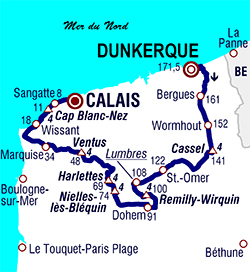La Plate Bourse (km 38.5) - Le Nieppe (km 40) - (Pas-de-Calais) : D209 Clairmarais (km 48.4) - Saint-Omer (km 49.7) - Longuenesse (km 54) - D208 Wisques (km 58.6) - Setques (km 60.8) -