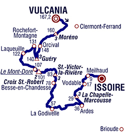 13h20 (Puy-de-Dôme) : D942 Vulcania (km 0) - La Baraque (km 0.4) - La Font de l'Arbre (km 1.7) - Enval (km 2.1) - Col de la Moréno (km 7-GPM3) - Les Bramauds (km 10.7) - D216 Pont des Eaux (km 12.7) - Villejacques (km 14.3) - La Baraquette (km 15.6) - D27 Orcival (km 18.9) - Le Bâtiment Neuf (km 20.2) - Rouchaube (km 21.8) - Douharesse-Haut (km 23.7) - D983 Col de Guéry (km 27.3-GPM3) - D80 Le Cros-Haut (km 31.3) - La Gratade (km 33.8) - Rochefort-Montagne (km 36.6) - D922 Laqueuille (km 44.8) - Le Grand Baguay (près de) (km 48.3) - D219 Murat-le-Quaire (km 52.2) - Le Pessy (km 53.2) - Les Planches (km 54.9) - D996 Le Genestoux (km 55.9) - Le Mont-Dore (km 59.9-sprint) - D36 Col de la Croix Saint-Robert (km 66.6-GPM2) - D636 Serrette (km 74.8) - D996 Chambon-sur-Lac (km 76.2) - Varennes (km 77.6) - Lac Chambon (km 77.9) - Murol (km 79.6) - D5 Saint-Victor-la-Rivière (km 83.6) - Côte de Saint-Victor-la-Rivière (km 84.3-GPM3) - Besse-en-Chandesse (km 88.9) - D36 Lac de Bourdouze (km 96.4) - Les Combes (km 99.7) - Compains (près de) (km 100.5) - D26 Col de la Chaumoune (km 104.4) - D32 La Godivelle (km 110.5) - D36 Col de la Volpilière (km 115.5) - Saint-Alyre-ès-Montagne (km 117.7) - La Jaquette (km 121.8) - Ardes (km 131.6) - D23 Chausse-Haut (km 133.8) - La Chapelle-Marcousse (près de) (km 138.6) - Côte de la Chapelle-Marcousse (km 138.6-GPM3) - D32 Moulet (km 144.1) - Dauzat-sur-Vodable (km 145.3) - Vodable (km 150.2) - D124 Ronzières (km 151.9) - D23 Tourzel (km 153.2) - Meilhaud (km 157.7) - D26 Perrier (km 160.6) - D996 Issoire / entrée (km 163) - D716 Issoire (km 167.2).