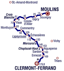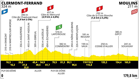 13h25 (Puy-de-Dôme) : D210 Clermont-Ferrand (km 0) - Gerzat (km 0.3) - Saint-Beauzire (près de) (km 4.1) - Chappes (près de) (km 8.3) - Ennezat (km 10.3) - Champeyroux (km 14.1) - D84 Martres-sur-Morge (km 16.2) - D211 Sardon (km 19.7) - D51 Chazelles (km 22.9) - Aigueperse (km 26.6) - D12 Tressat (km 28.4) - Chaptuzat (km 29.3) - Chaptuzat-Haut (km 31.1) - Côte de Chaptuzat-Haut (km 31.8-GPM4) - Saint-Agoulin (km 33.8) - D207 Les Boulards (km 38.3) - La Font Jaudas (km 43.3) - Chantemerle (km 43.8) - Beaudéduit (km 44.7) - (Allier) : Ébreuil (km 45.4) - D998 Côte du Mercurol (km 49.5-GPM4) - Le Mercurol (km 49.8) - Les Bois Francs (km 51.9) - Chalouze (km 52.8) - Faubourg de Ranciat (km 54.4) - Lalizolle (km 54.9) - Les Queyfoux (km 58.4) - La Bosse (km 59.3) - Échassières (km 61.7) - Ludin (km 63.3) - Chatet (km 64.5) - (Puy-de-Dôme) : Villonne (km 66.5) - La Loge (km 68.8) - Lapeyrouse (km 70.5-sprint) - La Maison Rouge (km 71.4) - Les Monteix (km 74.3) - (Allier) : La Halle (km 76.5) - Les Marcas (km 77.7) - Colombier (km 79.3) - Les Thureaux (km 80.5) - Commentry (km 81.3) - Les Côtes Rousses (km 89) - Néris-les-Bains (km 90.1) - D2144 La Côte Jaune (km 93.4) - Saint-Agathe (km 94.3) - Montluçon (km 96.6) - D301 Sainte-Alice (km 106) - Saint-Victor-Perreguines (km 106.8) - Terres Rouges Crozardais (km 107.5) - La Bourse (km 108.4) - Les Bernards (km 109.6) - D241 Vaux (km 110) - Les Poiriers (km 110.4) - Les Roussets (km 111.1) - D70 Magnette (km 114.7) - Reugny (km 115.8) - Côte de La Croix Blanche (km 118.5-GPM4) - L'Étang (km 120.6) - D70 - D3 - D11 La Levrette (km 127.2) - La Longe du Bois (km 132.5) - Cosne-d'Allier (km 135.2) - D94 - D11 Chatillon (km 142.4) - Les Cités (km 149.5) - La Gare (km 151.2) - Les Placourauds (km 152.4) - Gipcy (km 154.4) - Le Moulin (km 157) - D73 Les Plantes (km 164.7) - D134 Souvigny (km 165.9) - D945 Montégut (km 171.3) - Moulins / entrée (km 176.6) - Moulins / Bd. de Nomazy (km 179.8).