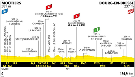 13h35 (Savoie) : D990 Moûtiers (km 0) - Cevins (km 0.4) - La Bâthie (km 1.7) - Tours-en-Savoie (km 5.8) - Albertville (km 9.2) - D925 Pont Albertin (km 12.1) - Grignon (km 12.7) - La Plaine de Monthion (km 15.8) - Sainte-Hélène-sur-Isère (km 19.3) - Le Villard (km 21.8) - D222 Pont de Grésy (km 25.9) - D1090 - D1006 Les Îles (km 33.1) - Arbin (km 42) - Montmélian (km 44.7) - Chignin (km 50.3) - Saint-Jeoire-Prieuré (km 52.4) - D5 Challes-les-Eaux (km 53.9) - La Ravoire (km 55.74) - D201 Chambéry (km 59.3) - D991 Côte de Chambéry-le-Haut (km 62.1-GPM4) - Autigny (km 66.3) - Voglans (km 67.2) - D17 - D1201 Terre-Nue (km 71.2) - D1504 Le Bourget-du-Lac (km 74.1) - Tunnel du Chat (km 77.9) - Saint-Jean-de-Chevelu (km 80.9) - Yenne (km 85.9) - Gorges de la Balme (km 89.2) - (Ain) : Virignin (km 91.6) - Belley (km 96.4) - D992 - D69 - D32 Chazey (km 100.4) - Boissieu (km 105) - Côte de Boissieu (km 105.2-GPM4) - Contrevoz (km 106.4) - D41a Cheignieu-la-Balme (près de) (km 110.9) - D1504 Rossillon (près de) (km 111.6) - La Burbanche (km 114.5) - Les Hôpitaux (km 117.9) - Cluse des Hôpitaux (km 118.6) - Tenay (près de) (km 124.5) - Le Villars (km 125.8) - Argis (près de) (km 126.7) - Saint-Rambert-en-Bugey (km 130.8) - Saint-Rambert-en-Bugey (km 132.9) - Torcieu (près de) (km 137.7) - Ambérieu-en-Bugey (km 140.8) - D1075 Pont-d'Ain (km 153) - La Chapelle (km 157.4) - D64 Tossiat (km 165.3) - D52 Journans (près de) (km 167.3) - Chalix (km 167.6) - Revonnas (km 168.5) - Ceyzériat (km 170.1) - Les Soudanières (km 172.8) - Les Maisons Rouges (km 173.9) - Jasseron (km 174.6) - D936 - D117a - D1083 Bourg-en-Bresse / entrée (km 182) - D1075 Bourg-en-Bresse / Bd. Charles de Gaulle (km 184.9).