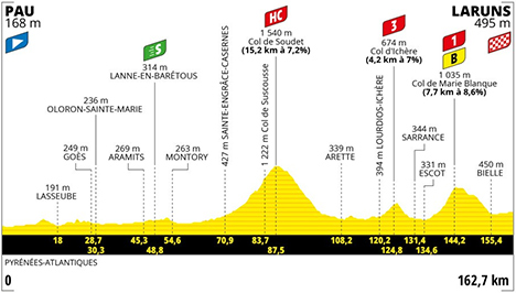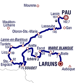 13h25 (Pyrénées-Atlantiques) : D802 Pau (km 0) - Laroin (km 1.6) - D217 Hameau de la Forge (km 3.9) - Vallée de Las Hies (km 8.2) - D24 Haut de Bauch (km 13.3) - Brana (km 16.1) - Lasseube (km 18) - Estialescq (près de) (km 24.9) - Goès (km 28.7) - Oloron-Sainte-Marie (km 30.3) - D919 Saint-Pée-de-Haut (km 35) - Féas (km 39.8) - Ance (km 41.6) - Aramits (km 45.3) - D918 Lanne-en-Barétous (km 48.8-sprint) - Lanne-en-Barétous (km 48.8) - Montory (km 54.6) - Tardets (km 58.2) - D26 Laguinge (km 60.4) - Licq (km 63.3) - D113 Quartier Arria (km 69.5) - Sainte-Engrâce-Casernes (km 70.9) - Gorges de Kakuetta (près de) (km 72.8) - Sainte-Engrâce-Bourg-Quartier Calla (km 75.3) - Quartier Senta (km 76) - Plateau d'Iratzordoky (km 81) - Col de Suscousse (km 83.7) - Col de Soudet (km 87.5-GPM.HC) - D132 La Mouline (km 101.9) - Arette (km 108.2) - Lachègue (km 110.8) - D241 Lourdios-Ichère (km 120.2) - Col d'Ichère (km 124.8) - N134 Sarrance (km 131.4) - D238 Escot (km 134.6) - D294 Moulin de Barescou (km 140.6) - Col de Marie Blanque (km 144.2-GPM1) - Le Benou (km 149.4) - D2934B Bielle (km 155.4) - Monplaisir (km 157.8) - Vc Bourg de Bélesten (km 158.1) - D934 Laruns (km 162.7).