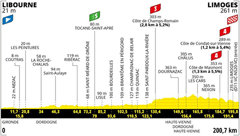 12h45 (Gironde) : D1089 Libourne (km 0) - La Patache (km 0.3) - Marchesseau (km 1) - Goujon (km 3.4) - Lamarche (km 5) - Les Chapelles (km 7.1) - Tripoteau (km 9.4) - D17 Abzac (km 11.7) - D247 Les Hillaires (km 13.2) - Rochereau (km 13.5) - Barraud (km 14.2) - D674 Coutras (km 15.8) - Les Mougneaux (km 20) - Les Peintures (km 20.8) - Champ de Mil (km 22.1) - Rolland (km 22.7) - Lacombe (km 25.4) - Les Églisottes (km 26.3) - Au Champ de Lavergne (km 28.2) - Lanière (km 28.5) - Bel Air (km 29.1) - Le Chalaure (km 30.4) - (Dordogne) : Le Capet (km 30.8) - La Croix de La Grand Mère (km 31.5) - La Roche-Chalais (km 34) - D5 Beynau (km 35.7) - La Mothe Barail (km 36.5) - La Fagnouse (km 37.2) - Beau Soleil (km 37.8) - L'Aubry (km 41) - La Poste (km 41.5) - Saint-Aulaye (km 46.3) - Le Pont de Rizonne (km 49.6) - Le Terme Rouge (km 52.5) - Le Pauly (km 59.9) - La Côte (km 61.6) - La Petite Borderie (km 62.5) - D708 Ribérac (km 64.8) - D710 Saint-Méard-de-Drône (km 73.2) - Tocane-Saint-Apre (km 79-sprint) - D78 Les Grands Champs (km 80.9) - Bonas (km 81.3) - Claud de Gabari (km 83.5) - Rouffelier (km 83.8) - Le Moulin de Jansou (km 84.6) - Les Trois Chênes (km 85.1) - Lisle (km 85.2) - La Pierre Plantée (km 86.3) - La Rijardie Haute (km 90.1) - Les Bourdeillettes (km 91.6) - Marvol (km 92.8) - Bourdeilles (km 93.6) - Valeuil/Gare (km 96.1) - Verdelou (km 96.8) - Pont de Valeuil (km 97.1) - Ramefort (km 98.9) - Moulin de Grenier (km 99.9) - D939 Brantôme en Périgord (km 102.5) - D675 - D82 Champagnac-de-Belair (km 110.5) - D83 Maucité (km 112.9) - Quinsac (km 115.2) - Le Sablon (km 118.3) - Le Caneau (km 119.5) - Saint-Front-la-Rivière (km 120.6) - Saint-Pardoux-la-Rivière (km 123.1) - Champs-Romain (km 130.4) - Côte de Champs-Romain (km 130.4-GPM3) - D79 - D96 Le Verdoyer (km 133.4) - D85 La Chapelle Verlaine (km 137.2) - (Haute-Vienne) : D6bis Les Couderchoux (km 140.8) - Le Grand Clos (km 143.1) - Le Bois des Roses (km 144.4) - Les Trois Cerisiers (km 145.3) - (Dordogne) : Les Trois Cerisiers (km 145.4) - (Haute-Vienne) : Les Pomperies (km 147.4) - Dournazac (km 149.6) - Vignéras (km 151.6) - Longaigue (km 152.3) - La Garnaudie (km 153.3) - Chanteloube (km 155.4) - Châlus (km 156.4) - D15 Le Mazaubert (km 160.3) - Le Pré du Lac (km 160.8) - La Petite Garde (km 161.5) - Les Cars (km 165.8) - Les Lots (km 167.2) - Les Coupes de Gorsas (km 168.6) - Rilhac (km 170.6) - La Croix de Naublanc (km 171.3) - Noyeras (km 173.7) - La Petite Bouenne (km 174.1) - Le Courdein (km 174.8) - Nexon (km 175.6) - D11 La Garde (km 178.2) - Champagnac (km 179.2) - Le Petit Mazérieux (km 180) - Le Grand Arbre (km 180.2) - Le Petit Champagnac (km 180.8) - Royer (km 181.3) - Largerieux (km 182.3) - La Croix de Masmont (km 184.4) - Côte de Masmont (km 184.7-GPM4) - Pré Boreau (km 186.1) - Charroux (km 186.2) - Côte de Condat-Sur-Vienne (km 191.4-GPM4) - Condat-sur-Vienne (km 192.2) - Fontgeaudrant (km 194.7) - Limoges (km 195.8) - Limoges / Place Jourdan (km 200.7).