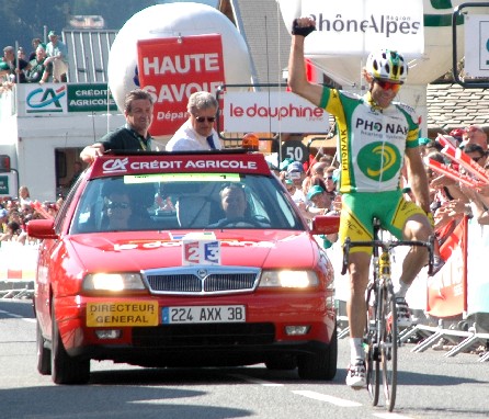 7 Morzine Avoriaz-Sallanches, 128 km Classement général : 2. Santiago Botero (Col) à 11" 3. Levi Leipheimer (Usa) à 38" 4. Lance Armstrong (Usa) à 59" 5. Alexandre Vinokourov (Kaz) à 1'02" 6. David Moncoutié (Fra) à 1'56" 7. José Angel Gomez Marchante (Esp) à 3'54" 8. Marzio Bruseghin (Ita) à 3'58" 9. Andrey Kashechkin (Kaz) à 5'04" 10. Francisco Mancebo (Esp) à 6'20" 11. Floyd Landis (Usa) à 7'51" 12. Wim Van Huffel (Bel) à 7'52" 13. Axel Merckx (Bel) à 8'28" 14. Stéphane Goubert (Fra) à 13'08" 15. Nicolas Fritsch (Fra) à 13'14" 16. Manuel Beltran (Esp) à 13'36" 17. Mikel Astarloza (Esp) à 13'43" 18. Massimo Giunti (Ita) à 14'17" 19. David Arroyo (Esp) à 14'37" 20. David Cañada (Esp) à 15'17" 21. Oscar Pereiro (Esp) à 15'31" 22. Yaroslav Popovych (Ukr) à 16'14" 23. Pieter Weening (Hol) à 17'23" 24. Denis Menchov (Rus) à 17'38" 25. José Azevedo (Por) à 20'40" 26. Pierrick Fedrigo (Fra) à 21'45" 27. Nicki Sørensen (Dan) à 22'01" 28. Alexandre Botcharov (Rus) à 25'17" 29. José Enrique Gutierrez (Esp) à 27'05" 30. Bram Tankink (Hol) à 27'19" 31. Sylvain Chavanel (Fra) à 28'19" 32. George Hincapie (Usa) à 28'31" 33. Sylvain Calzati (Fra) à 28'53" 34. Massimo Codol (Ita) à 30'05" 35. Carlos Sastre (Esp) à 30'13" 36. Koos Moerenhout (Hol) à 31'49" 37. José Ivan Gutierrez (Esp) à 32'28" 38. Manuel Calvente (Esp) à 33'52" 39. José Luis Rubiera (Esp) à 34'50" 40. Rémy Di Gregorio (Fra) à 36'05" 41. Oscar Sevilla (Esp) à 36'12" 42. Constantino Zaballa (Esp) à 37'22" 43. Davide Rebellin (Ita) à 37'58" 44. Eddy Mazzoleni (Ita) à 39'33" 45. Paolo Bossoni (Ita) à 40'26" 46. Didier Rous (Fra) à 40'45" 47. Igor Gonzalez de Galdeano (Esp) à 41'40" 48. Xabier Zandio (Esp) à 43'17" 49. Francisco José Lara (Esp) à 43'38" 50. Benjamin Noval (Esp) à 45'34" 51. Rafael Casero (Esp) à 47'04" 52. Frédéric Bessy (Fra) à 48'04" 53. Maxim Iglinskiy (Kaz) à 49'54" 54. Manuel Quinziato (Ita) à 50'11" 55. Mario Aerts (Bel) à 50'47" 56. Andriy Grivko (Ukr) à 51'06" 57. Juan Manuel Fuentes (Esp) à 51'09" 58. Christophe Edaleine (Fra) à 52'27" 59. Anthony Geslin (Fra) à 52'36" 60. Serge Baguet (Bel) à 53'38" 61. Thomas Lövkvist (Sue) à 53'47" 62. Johan Van Summeren (Bel) à 54'01" 63. Francis Mourey (Fra) à 55'19" 64. Erik Dekker (Hol) à 56'16" 65. Nicolas Vogondy (Fra) à 56'44" 66. Iñigo Chaurreau (Esp) à 59'04" 67. Philippe Gilbert (Bel) à 1h02'21" 68. Daniel Becke (All) à 1h03'27" 69. Sébastien Joly (Fra) à 1h04'49" 70. Michael Boogerd (Hol) à 1h04'54" 71. Pierre Drancourt (Fra) à 1h06'26" 72. Nicolas Portal (Fra) à 1h10'01" 73. Christophe Mengin (Fra) à 1h10'33" 74. Mauro Facci (Ita) à 1h11'52" 75. Luke Roberts (Aus) à 1h14'42" 76. Oleksandr Kvachuk (Ukr) à 1h18'44" 77. Janek Tombak (Est) à 1h21'39" 78. Matej Jurco (Svq) à 1h23'52" Partants : 161 Classés : 78 Points : 1. Lance ARMSTRONG (Usa) 63 pts 2. Santiago Botero (Col) 62 3. George Hincapie (Usa) 59 4. Levi Leipheimer (Usa) 59 5. Alexandre Vinokourov (Kaz) 58 6. David Moncoutié (Fra) 37 7. Floyd Landis (Usa) 36 8. Andrey Kashechkin (Kaz) 35 9. José Angel Gomez Marchante (Esp) 33 10. Iñigo Landaluze (Esp) 31 Montagne : 1. José Ivan GUTIERREZ (Esp) 96 pts 2. Sylvain Calzati (Fra) 67 3. Massimo Giunti (Ita) 62 4. Alexandre Vinokourov (Kaz) 61 5. José Angel Gomez Marchante (Esp) 61 6. Santiago Botero (Col) 58 7. David Moncoutié (Fra) 53 8. Rémy Di Gregorio (Fra) 52 9. Yaroslav Popovych (Ukr) 50 10. Axel Merckx (Bel) 44 Equipes : 1. DISCOVERY CHANNEL en 85h30'51" 2. PHONAK HEARING SYSTEMS à 6'50" 3. SAUNIER DUVAL-PRODIR à 11'29" 4. CRÉDIT AGRICOLE à 15'37" 5. DAVITAMON-LOTTO à 20'24" 6. T-MOBILE TEAM à 24'03" 7. FASSA BORTOLO à 24'11" 8. ILLES BALEARS-CAISSE D'EPARGNE à 24'12" 9. AG2R PRÉVOYANCE à 31'55" 10. RABOBANK à 34'10" Les maillots : Les partants : DISCOVERY CHANNEL 1 ARMSTRONG Lance (Usa) 2 AZEVEDO José (Por) 3 BELTRAN Manuel (Esp) 4 DEVOLDER Stijn (Bel) ab.7° 5 HINCAPIE George (Usa) 6 NOVAL Benjamin (Esp) 7 POPOVYCH Yaroslav (Ukr) 8 RUBIERA José Luis (Esp) T-MOBILE TEAM 11 VINOKOUROV Alexandre (Kaz) 12 HIEKMANN Torsten (All) ab.5° 13 KLÖDEN Andreas (All) ab.7° 14 KOHL Bernhard (Aut) ab.7° 15 LARA Francisco José (Esp) 16 SEVILLA Oscar (Esp) 17 WERNER Christian (All) np.3° 18 YAKOVLEV Serguei (Kaz) ab.7° CRÉDIT AGRICOLE 21 MOREAU Christophe (Fra) ab.7° 22 BOTCHAROV Alexandre (Rus) 23 HUSHOVD Thor (Nor) ab.6° 24 JOLY Sébastien (Fra) 25 KASHECHKIN Andrey (Kaz) 26 POILVET Benoît (Fra) ab.5° 27 NAZON Damien (Fra) ab.7° 28 VOGONDY Nicolas (Fra) ILLES BALEARS-CAISSE D'ÉPARGNE 31 MANCEBO Francisco (Esp) 32 ARROYO David (Esp) 33 BECKE Daniel (All) 34 GARCIA ACOSTA José Vicente (Esp) ab.7° 35 GUTIERREZ José Ivan (Esp) 36 JULIA José Cayetano (Esp) ab.7° 37 PRADERA Mikel (Esp) ab.6° 38 ZANDIO Xabier (Esp) FRANÇAISE DES JEUX 41 LÖVKVIST Thomas (Sue) 42 DELAGE Mickaël (Fra) ab.7° 43 DI GREGORIO Rémy (Fra) 44 FINOT Frédéric (Fra) ab.7° 45 GILBERT Philippe (Bel) 46 MENGIN Christophe (Fra) 47 MOUREY Francis (Fra) 48 VAUGRENARD Benoît (Fra) ab.7° PHONAK HEARING SYSTEMS 51 BOTERO Santiago (Col) 52 53 GRABSCH Bert (All) ab.7° 54 GUTIERREZ José Enrique (Esp) 55 HUNTER Robert (Afs) ab.7° 56 JALABERT Nicolas (Fra) ab.7° 57 LANDIS Floyd (Usa) 58 PEREIRO Oscar (Esp) TEAM CSC 61 SASTRE Carlos (Esp) 62 ARVESEN Kurt-Asle (Nor) ab.7° 63 CALVENTE Manuel (Esp) 64 PIIL Jakob (Dan) ab.1° 65 ROBERTS Luke (Aus) 66 SØRENSEN Nicki (Dan) 67 VANDBORG Brian (Dan) ab.4° 68 VANDEVELDE Christian (Usa) ab.6° GEROLSTEINER 71 LEIPHEIMER Levi (Usa) 72 HAUSSLER Heinrich (All) ab.7° 73 LANG Sebastian (All) ab.7° 74 PESCHEL Uwe (All) ab.7° 75 REBELLIN Davide (Ita) 76 RUSS Matthias (All) ab.7° 77 SCHMIDT Torsten (All) ab.7° 78 SERPELLINI Marco (Ita) ab.7° QUICK STEP-INNERGETIC 81 MERCADO Juan Miguel (Esp) ab.7° 82 DE FAUW Dimitri (Bel) ab.5° 83 NUYENS Nick (Bel) np.7° 84 PAOLINI Luca (Ita) ab.4° 85 PECHARROMAN José Antonio (Esp) ab.7° 86 TANKINK