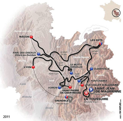 Prol. St Jean de Maurienne, 5.4 km CLM 1. Lars Boom (Hol) en 6'18"12 2. Alexandre Vinokourov (Kaz) à 2" 3. Bradley Wiggins (Gbr) à 5" 4. John Degenkolb (All) à 6" 5. Blel Kadri (Fra) à 8" 6. Joost Posthuma (Hol) à 9" 7. Cadel Evans (Aus) 8. Christophe Riblon (Fra) 9. Cyril Lemoine (Fra) à 10" 10. Jérôme Coppel (Fra) à 11" * Lars Boom 1 Albertville-St Pierre de Chartreuse, 144 km 1. Jürgen Van den Broeck (Bel) en 3h36'42" 2. Joaquin Rodriguez (Esp) à 6" 3. Cadel Evans (Aus) à 7" 4. Alexandre Vinokourov (Kaz) 5. Nicolas Roche (Irl) 6. Edvald Boasson Hagen (Nor) 7. Thibaut Pinot (Fra) à 13" 8. Rob Ruijgh (Hol) 9. Thomas Voeckler (Fra) à 15" 10. Janez Brajkovic (Slo) * Alexandre Vinokourov 2 Voiron-Lyon, 179 km 1. John Degenkolb (All) en 4h02'39" 2. Samuel Dumoulin (Fra) 3. Sébastien Hinault (Fra) 4. Paul Martens (All) 5. Joaquin Rodriguez (Esp) 6. Thomas Voeckler (Fra) 7. Jelle Vanendert (Bel) 8. Grega Bole (Slo) 9. Nicolas Roche (Irl) 10. Fabian Wegmann (All) * Alexandre Vinokourov 3 Grenoble, 42.5 km CLM 1. Tony Martin (All) en 55'27" 2. Bradley Wiggins (Gbr) à 11" 3. Edvald Boasson Hagen (Nor) à 43" 4. David Zabriskie (Usa) à 58" 5. Janez Brajkovic (Slo) à 1'17" 6. Cadel Evans (Aus) à 1'20" 7. Geraint Thomas (Gbr) à 1'36" 8. Christophe Riblon (Fra) à 1'37" 9. Rein Taaramäe (Est) à 1'56" 10. Rui Alberto Costa (Por) à 2'00" * Bradley Wiggins 4 La Motte Servolex-Mâcon, 173.5 km 1. John Degenkolb (All) en 4h15'41" 2. Edvald Boasson Hagen (Nor) 3. Juan José Haedo (Arg) 4. Tomas Vaitkus (Lit) 5. William Bonnet (Fra) 6. Tyler Farrar (Usa) 7. Marco Bandiera (Ita) 8. Samuel Dumoulin (Fra) 9. Pim Ligthart (Hol) 10. Kenny De Haes (Bel) * Bradley Wiggins 5 Villars les Dombes/Parc des Oiseaux-Les Gets, 210 km 1. Christophe Kern (Fra) en 5h05'03" 2. Chris Anker Sørensen (Dan) à 7" 3. Thomas Voeckler (Fra) à 9" 4. Joaquin Rodriguez (Esp) 5. Alexandre Vinokourov (Kaz) 6. Bradley Wiggins (Gbr) 7. Thibaut Pinot (Fra) 8. Daniel Martin (Irl) 9. Jürgen Van den Broeck (Bel) 10. Ben Hermans (Bel) * Bradley Wiggins 6 Les Gets-Le Collet d'Allevard, 192.5 km 1. Joaquin Rodriguez (Esp) en 5h12'47" 2. Robert Gesink (Hol) à 31" 3. Jürgen Van den Broeck (Bel) à 39" 4. Christophe Kern (Fra) à 41" 5. Alexandre Vinokourov (Kaz) à 50" 6. Bradley Wiggins (Gbr) à 54" 7. Chris Anker Sørensen (Dan) à 1'00" 8. Jean-Christophe Péraud (Fra) à 1'06" 9. Cadel Evans (Aus) à 1'09" 10. Thomas Voeckler (Fra) à 1'58" * Bradley Wiggins 7 Pontcharra-La Toussuire, 117.5 km 1. Joaquin Rodriguez (Esp) en 3h24'30" 2. Thibaut Pinot (Fra) à 7" 3. Robert Gesink (Hol) 4. Jürgen Van den Broeck (Bel) 5. Alexandre Vinokourov (Kaz) 6. Chris Anker Sørensen (Dan) à 10" 7. Cadel Evans (Aus) 8. Kanstantsin Siutsou (Blr) 9. Janez Brajkovic (Slo) 10. Bradley Wiggins (Gbr) Classement général : 2. Cadel Evans (Aus) à 1'26" 3. Alexandre Vinokourov (Kaz) à 1'49" 4. Jürgen Van den Broeck (Bel) à 2'10" 5. Joaquin Rodriguez (Esp) à 2'51" 6. Christophe Kern (Fra) à 3'05" 7. Jean-Christophe Péraud (Fra) à 3'30" 8. Kanstantsin Siutsou (Blr) à 4'14" 9. Janez Brajkovic (Slo) à 4'22" 10. Thomas Voeckler (Fra) à 4'31" 11. Chris Anker Sørensen (Dan) à 5'01" 12. David Moncoutié (Fra) à 6'40" 13. Jérôme Coppel (Fra) à 7'13" 14. Rob Ruijgh (Hol) à 9'02" 15. Andrey Zeits (Kaz) à 11'42" 16. Thibaut Pinot (Fra) à 12'54" 17. Samuel Sanchez (Esp) à 12'57" 18. Pierre Rolland (Fra) à 13'08" 19. Bruno Manuel Pires (Por) à 13'53" 20. Robert Gesink (Hol) à 16'17" 21. Rémy Di Gregorio (Fra) à 17'03" 22. Amets Txurruka (Esp) à 18'50" 23. Maxime Bouet (Fra) à 20'09" 24. Ben Hermans (Bel) à 21'02" 25. Yury Trofimov (Rus) à 22'58" 26. Ivan Basso (Ita) à 24'36" 27. Danny Pate (Usa) à 24'56" 28. Rigoberto Uran (Col) à 24'58" 29. Maciej Paterski (Pol) m.t. 30. Ivan Velasco (Esp) à 26'38" 31. Oliver Zaugg (Sui) à 26'39" 32. Matthew Busche (Usa) à 26'49" 33. Daniel Martin (Irl) à 26'56" 34. Rafal Majka (Pol) à 27'06" 35. Fabrice Jeandesboz (Fra) à 28'09" 36. Pierrick Fedrigo (Fra) à 28'10" 37. Tony Martin (All) à 28'30" 38. Marc De Maar (Aho) à 28'39" 39. Steve Morabito (Sui) à 28'43" 40. Julien Simon (Fra) à 29'33" 41. Francesco Bellotti (Ita) à 30'04" 42. Francis Mourey (Fra) à 30'26" 43. Rui Alberto Costa (Por) à 30'42" 44. Luis Leon Sanchez (Esp) à 32'14" 45. Rein Taaramäe (Est) à 32'56" 46. Nicki Sørensen (Dan) à 33'10" 47. Egoi Martinez (Esp) à 33'49" 48. Vladimir Karpets (Rus) à 34'26" 49. Sergio Miguel Paulinho (Por) à 34'27" 50. Haimar Zubeldia (Esp) à 35'37" 51. Christophe Riblon (Fra) à 35'39" 52. Marco Marzano (Ita) à 35'43" 53. Imanol Erviti (Esp) à 36'01" 54. Sandy Casar (Fra) à 36'03" 55. Edvald Boasson Hagen (Nor) à 36'10" 56. Fredrik Kessiakoff (Sue) à 36'32" 57. David Lopez Garcia (Esp) à 36'57" 58. Carlos Barredo (Esp) m.t. 59. Cyril Gautier (Fra) à 38'59" 60. Rémi Pauriol (Fra) à 39'14" 61. Kristjan Koren (Slo) à 39'25" 62. Alexandr Kolobnev (Rus) à 39'30" 63. Cameron Wurf (Aus) à 39'56" 64. Tristan Valentin (Fra) à 40'08" 65. Gorka Verdugo (Esp) à 40'19" 66. Joost Posthuma (Hol) à 42'02" 67. Jonathan Hivert (Fra) à 42'15" 68. Geoffroy Lequatre (Fra) à 42'47" 69. Arnold Jeannesson (Fra) à 43'04" 70. Yannick Talabardon (Fra) à 43'57" 71. Jürgen Van de Walle (Bel) à 44'04" 72. Juan Manuel Garate (Esp) à 44'26" 73. Frederik Veuchelen (Bel) à 44'43" 74. Brian Vandborg (Dan) à 46'26" 75. Dmitriy Fofonov (Kaz) à 48'27" 76. Ivan Santaromita (Ita) à 49'02" 77. Jelle Vanendert (Bel) à 49'04" 78. Amaël Moinard (Fra) à 49'43" 79. David Zabriskie (Usa) à 50'17" 80. Paul Martens (All) à 51'04" 81. Gatis Smukulis (Let) à 53'03" 82. Maxim Iglinskiy (Kaz) à 53'48" 83. Francisco Perez (Esp) à 53'58" 84. Przemyslaw Niemiec (Pol) à 54'32" 85. Michal Golas (Pol) à 55'27" 86. Nicolas Vogondy (Fra) à 55'29" 87. Christian Knees (All) à 55'46" 88. Damien Monier (Fra) à 56'36" 89. Sébastien Joly (Fra) à 57'31" 90. Jérémy Roy (Fra) à 58'15" 91. Math