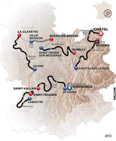 Prol. Grenoble, 5.7 km CLM 1. Luke Durbridge (Aus) en 6'38" 2. Bradley Wiggins (Gbr) à 1" 3. Andriy Grivko (Ukr) à 3" 4. Carlos Barredo (Esp) 5. Tony Martin (All) à 5" 6. Simon Gerrans (Aus) 7. Paul Martens (All) 8. Sylvain Chavanel (Fra) à 6" 9. Cadel Evans (Aus) 10. Andrey Amador (Crc) à 7" * Luke Durbridge 1 Seyssins-St Vallier, 187 km 1. Cadel Evans (Aus) en 4h36'21" 2. Jérôme Coppel (Fra) 3. Andrey Kashechkin (Kaz) 4. Nacer Bouhanni (Fra) à 4" 5. Tony Gallopin (Fra) 6. Borut Bozic (Slo) 7. Gerald Ciolek (All) 8. Julien Simon (Fra) 9. Daniele Ratto (Ita) 10. Edvald Boasson Hagen (Nor) * Bradley Wiggins 2 Lamastre-St Félicien, 160 km 1. Daniel Moreno (Esp) en 4h02'38" 2. Julien Simon (Fra) 3. Tony Gallopin (Fra) 4. Rinaldo Nocentini (Ita) 5. Jürgen Van den Broeck (Bel) 6. Luis Leon Sanchez (Esp) 7. Cadel Evans (Aus) 8. Janez Brajkovic (Slo) 9. Bradley Wiggins (Gbr) 10. Thomas Voeckler (Fra) * Bradley Wiggins 3 Givors-La Clayette, 167 km 1. Edvald Boasson Hagen (Nor) en 4h22'13" 2. Gerald Ciolek (All) 3. Borut Bozic (Slo) 4. Roger Kluge (All) 5. Murilo Antonio Fischer (Bre) 6. Tony Gallopin (Fra) 7. Davide Cimolai (Ita) 8. Michael Matthews (Aus) 9. Sébastien Hinault (Fra) 10. Jonathan Cantwell (Aus) * Bradley Wiggins 4 Villié Morgon-Bourg en Bresse, 53.5 km CLM 1. Bradley Wiggins (Gbr) en 1h03'12" 2. Tony Martin (All) à 34" 3. Michael Rogers (Aus) à 1'11" 4. Wilco Kelderman (Hol) à 1'26" 5. Sylvain Chavanel (Fra) à 1'33" 6. Christopher Froome (Gbr) 7. Luke Durbridge (Aus) à 1'38" 8. Cadel Evans (Aus) à 1'43" 9. David Millar (Gbr) à 1'51" 10. Luis Leon Sanchez (Esp) à 1'54" * Bradley Wiggins 5 St Trivier sur Moignans-Rumilly, 186.5 km 1. Arthur Vichot (Fra) en 4h42'17" 2. Egoi Martinez (Esp) à 26" 3. Dmitriy Fofonov (Kaz) 4. Rémy Di Gregorio (Fra) 5. Cayetano José Sarmiento (Col) 6. Alberto Losada (Esp) 7. Daniel Navarro (Esp) 8. Maxime Méderel (Fra) 9. Maxime Bouet (Fra) à 46" 10. Bruno Manuel Pires (Por) * Bradley Wiggins 6 St Alban Leysse-Morzine, 167.5 km 1. Nairo Alexander Quintana (Col) en 4h46'12" 2. Cadel Evans (Aus) à 16" 3. Daniel Moreno (Esp) à 24" 4. Bradley Wiggins (Gbr) 5. Pieter Weening (Hol) 6. Christopher Froome (Gbr) 7. Vasil Kiryienka (Blr) 8. Jürgen Van den Broeck (Bel) 9. Michael Rogers (Aus) 10. Haimar Zubeldia (Esp) * Bradley Wiggins 7 Morzine-Châtel, 124.5 km 1. Daniel Moreno (Esp) en 2h59'37" 2. Luis Leon Sanchez (Esp) 3. Cadel Evans (Aus) 4. Edvald Boasson Hagen (Nor) 5. Rinaldo Nocentini (Ita) 6. Pieter Weening (Hol) 7. Jürgen Van den Broeck (Bel) 8. Dries Devenyns (Bel) 9. Richie Porte (Aus) 10. Michael Rogers (Aus) Classement général : 2. Michael Rogers (Aus) à 1'17" 3. Cadel Evans (Aus) à 1'26" 4. Christopher Froome (Gbr) à 1'45" 5. Jürgen Van den Broeck (Bel) à 2'12" 6. Vasil Kiryienka (Blr) à 2'58" 7. Janez Brajkovic (Slo) à 3'07" 8. Wilco Kelderman (Hol) à 3'26" 9. Richie Porte (Aus) à 3'34" 10. Haimar Zubeldia (Esp) à 3'50" 11. Pieter Weening (Hol) à 3'55" 12. Luis Leon Sanchez (Esp) à 3'57" 13. Daniel Moreno (Esp) à 4'34" 14. Tejay Van Garderen (Usa) à 4'49" 15. Bruno Manuel Pires (Por) à 5'21" 16. Daniel Navarro (Esp) à 5'39" 17. Jérôme Coppel (Fra) à 5'53" 18. Tiago José Machado (Por) à 6'44" 19. Rinaldo Nocentini (Ita) à 9'06" 20. Egor Silin (Rus) à 9'17" 21. Pierre Rolland (Fra) à 9'59" 22. Maxime Méderel (Fra) à 10'15" 23. Tony Martin (All) à 10'16" 24. Fabrice Jeandesboz (Fra) à 11'13" 25. Guillaume Levarlet (Fra) à 12'02" 26. Andrey Amador (Crc) à 12'31" 27. Alexandre Geniez (Fra) à 14'04" 28. Vincenzo Nibali (Ita) à 14'36" 29. Matteo Carrara (Ita) à 14'52" 30. Rémy Di Gregorio (Fra) à 15'40" 31. Andrey Kashechkin (Kaz) à 16'03" 32. Tony Gallopin (Fra) à 16'34" 33. Kristjan Koren (Slo) à 16'40" 34. Amaël Moinard (Fra) à 16'57" 35. Dominik Nerz (All) à 17'06" 36. Cyril Gautier (Fra) à 17'22" 37. Maciej Paterski (Pol) à 17'28" 38. Nairo Alexander Quintana (Col) à 17'34" 39. Maxime Bouet (Fra) à 17'39" 40. Rémi Pauriol (Fra) à 18'14" 41. Brice Feillu (Fra) à 19'05" 42. Denis Menchov (Rus) à 19'09" 43. Yury Trofimov (Rus) à 19'13" 44. Christophe Le Mével (Fra) à 19'27" 45. Egoi Martinez (Esp) à 19'43" 46. Jesus Hernandez (Esp) à 22'05" 47. Alberto Losada (Esp) à 22'29" 48. Bram Tankink (Hol) à 22'32" 49. Sylvain Chavanel (Fra) à 22'38" 50. Michael Schär (Sui) à 23'37" 51. Edvald Boasson Hagen (Nor) à 24'08" 52. Rob Ruijgh (Hol) à 24'57" 53. Ruben Plaza (Esp) à 25'08" 54. Petr Ignatenko (Rus) à 25'42" 55. Davide Malacarne (Ita) à 25'49" 56. Yoann Bagot (Fra) à 26'21" 57. Anthony Charteau (Fra) à 26'49" 58. Blel Kadri (Fra) à 26'55" 59. Dries Devenyns (Bel) à 27'07" 60. Mikaël Chérel (Fra) à 27'24" 61. Cayetano José Sarmiento (Col) à 27'46" 62. David Arroyo (Esp) à 28'19" 63. George Hincapie (Usa) à 28'25" 64. Kanstantsin Siutsou (Blr) à 28'43" 65. David Millar (Gbr) à 29'50" 66. Carlos Barredo (Esp) à 30'02" 67. Jorge Azanza (Esp) à 31'05" 68. Jean-Christophe Péraud (Fra) à 31'44" 69. Nicki Sørensen (Dan) à 31'48" 70. Arthur Vichot (Fra) à 32'21" 71. Lieuwe Westra (Hol) à 32'43" 72. Matthieu Ladagnous (Fra) à 33'02" 73. David Moncoutié (Fra) m.t. 74. Markel Irizar (Esp) à 33'06" 75. Luis Angel Mate (Esp) à 33'17" 76. Marco Marzano (Ita) m.t. 77. Kevin De Weert (Bel) à 34'39" 78. Simone Stortoni (Ita) à 34'59" 79. Nicolas Edet (Fra) à 35'01" 80. Federico Canuti (Ita) à 35'15" 81. Steve Morabito (Sui) à 36'00" 82. Dmitriy Fofonov (Kaz) à 36'40" 83. Mikel Landa (Esp) à 36'46" 84. Andriy Grivko (Ukr) à 37'07" 85. Jelle Vanendert (Bel) à 38'43" 86. Christophe Riblon (Fra) à 39'52" 87. Johannes Fröhlinger (All) à 40'14" 88. Nicolas Vogondy (Fra) à 40'16" 89. Paul Martens (All) à 41'01" 90. Imanol Erviti (Esp) à 41'05" 91. Gerald Ciolek (All) à 41'21" 92. Daniel Teklehaimanot (Ery) à 41'46" 93. Eduard Vorganov (Rus) à 41'49" 94. Simon Gerrans (Aus) à 42'39" 95. Gorka Verdugo (Esp) à 44'13" 96. Rein Taaramäe (Est) à 4