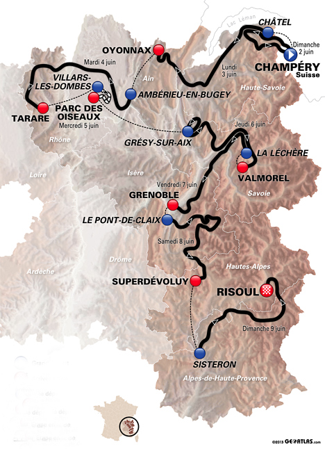 1 Champéry (Sui)-Champéry (Sui), 121 km 1. David Veilleux (Can) en 3h17'35" 2. Gianni Meersman (Bel) à 1'56" 3. Tom-Jelte Slagter (Hol) à 1'57" 4. Richie Porte (Aus) 5. Christopher Froome (Gbr) 6. Angel Madrazo (Esp) 7. Jakob Fuglsang (Dan) 8. Alejandro Valverde (Esp) 9. Tony Gallopin (Fra) 10. Leopold König (Tch) * David Veilleux 2 Châtel-Oyonnax, 191 km 1. Elia Viviani (Ita) en 4h39'15" 2. Gianni Meersman (Bel) 3. Tony Gallopin (Fra) 4. Reinardt Janse Van Rensburg (Afs) 5. Anthony Geslin (Fra) 6. Armindo Fonseca (Fra) 7. Bram Tankink (Hol) 8. Warren Barguil (Fra) 9. Juan Antonio Flecha (Esp) 10. Wesley Sulzberger (Aus) * David Veilleux 3 Ambérieu en Bugey-Tarare, 167 km 1. Edvald Boasson Hagen (Nor) en 4h03'32" 2. Michael Matthews (Aus) 3. Gianni Meersman (Bel) 4. Thor Hushovd (Nor) 5. Elia Viviani (Ita) 6. Reinardt Janse Van Rensburg (Afs) 7. Nacer Bouhanni (Fra) 8. Paul Voss (All) 9. Sylvain Chavanel (Fra) 10. Francesco Gavazzi (Ita) * David Veilleux 4 Villars les Dombes-Parc des Oiseaux, 32.5 km CLM 1. Tony Martin (All) en 36'54" 2. Rohan Dennis (Aus) à 47" 3. Christopher Froome (Gbr) à 52" 4. Jonathan Castroviejo (Esp) à 1'08" 5. Michal Kwiatkowski (Pol) à 1'13" 6. Edvald Boasson Hagen (Nor) à 1'19" 7. Richie Porte (Aus) à 1'20" 8. Jan Barta (Tch) à 1'36" 9. Marco Pinotti (Ita) à 1'38" 10. Geraint Thomas (Gbr) à 1'42" * Rohan Dennis 5 Grésy sur Aix-Valmorel, 139 km 1. Christopher Froome (Gbr) en 3h28'39" 2. Alberto Contador (Esp) à 4" 3. Matthew Busche (Usa) 4. Alejandro Valverde (Esp) à 10" 5. Michael Rogers (Aus) à 12" 6. Daniel Moreno (Esp) 7. Rein Taaramäe (Est) 8. Daniel Navarro (Esp) à 21" 9. Richie Porte (Aus) à 24" 10. Jakob Fuglsang (Dan) à 29" * Christopher Froome 6 La Léchère les Bains-Grenoble, 143 km 1. Thomas Voeckler (Fra) en 3h24'13" 2. José Herrada (Esp) 3. Kevin Seeldraeyers (Bel) 4. Egor Silin (Rus) 5. Edvald Boasson Hagen (Nor) à 46" 6. Gianni Meersman (Bel) 7. Francesco Gavazzi (Ita) 8. Wesley Sulzberger (Aus) 9. Arnaud Gérard (Fra) 10. Michal Kwiatkowski (Pol) * Christopher Froome 7 Le Pont de Claix-Superdévoluy, 184 km 1. Samuel Sanchez (Esp) en 5h26'14" 2. Jakob Fuglsang (Dan) 3. Richie Porte (Aus) à 15" 4. Daniel Moreno (Esp) à 16" 5. Stef Clement (Hol) 6. Alejandro Valverde (Esp) 7. Christopher Froome (Gbr) 8. Daniel Navarro (Esp) 9. Michael Rogers (Aus) 10. Alberto Contador (Esp) à 23" * Christopher Froome 8 Sisteron-Risoul, 155.5 km 1. Alessandro De Marchi (Ita) en 4h28'09" 2. Christopher Froome (Gbr) à 24" 3. Andrew Talansky (Usa) 4. Richie Porte (Aus) à 31" 5. Jakob Fuglsang (Dan) à 38" 6. Alejandro Valverde (Esp) à 49" 7. Joaquin Rodriguez (Esp) 8. Daniel Moreno (Esp) 9. Daniel Navarro (Esp) à 55" 10. Rohan Dennis (Aus) à 1'00" Classement général : 2. Richie Porte (Aus) à 58" 3. Daniel Moreno (Esp) à 2'12" 4. Jakob Fuglsang (Dan) à 2'18" 5. Daniel Navarro (Esp) à 2'20" 6. Michael Rogers (Aus) à 3'08" 7. Alejandro Valverde (Esp) à 3'12" 8. Rohan Dennis (Aus) à 3'24" 9. Samuel Sanchez (Esp) à 4'25" 10. Alberto Contador (Esp) à 4'27" 11. Stef Clement (Hol) à 4'39" 12. Alexandre Geniez (Fra) à 7'17" 13. Laurens Ten Dam (Hol) à 7'21" 14. Haimar Zubeldia (Esp) à 7'47" 15. Geraint Thomas (Gbr) à 9'02" 16. Joaquin Rodriguez (Esp) à 9'04" 17. Mikel Nieve (Esp) à 10'39" 18. Warren Barguil (Fra) à 12'12" 19. Matthew Busche (Usa) à 13'15" 20. Dominik Nerz (All) à 13'37" 21. Damiano Cunego (Ita) à 13'59" 22. Egor Silin (Rus) à 15'16" 23. Peter Kennaugh (Gbr) à 17'35" 24. Kristjan Koren (Slo) à 21'55" 25. Sergio Miguel Paulinho (Por) à 24'14" 26. Wesley Sulzberger (Aus) à 26'40" 27. Rein Taaramäe (Est) à 27'37" 28. Andrew Talansky (Usa) à 27'39" 29. Jürgen Van den Broeck (Bel) à 28'53" 30. Alessandro De Marchi (Ita) à 28'54" 31. Edvald Boasson Hagen (Nor) à 30'05" 32. Christophe Le Mével (Fra) à 31'08" 33. Tony Gallopin (Fra) à 33'04" 34. Tim Wellens (Bel) à 33'54" 35. Brent Bookwalter (Usa) à 34'48" 36. Kevin Seeldraeyers (Bel) à 36'14" 37. Mikel Astarloza (Esp) à 36'48" 38. Sébastien Duret (Fra) à 37'26" 39. Angel Madrazo (Esp) à 38'27" 40. Francesco Gavazzi (Ita) à 38'42" 41. Pierrick Fedrigo (Fra) à 39'04" 42. Bram Tankink (Hol) à 40'27" 43. Gorka Izagirre (Esp) à 41'31" 44. Egoi Martinez (Esp) à 41'43" 45. Juan Antonio Flecha (Esp) à 42'06" 46. Gianni Meersman (Bel) à 43'14" 47. Alberto Losada (Esp) à 43'15" 48. Andriy Grivko (Ukr) à 43'28" 49. José João Mendes (Por) à 47'13" 50. Laurent Didier (Lux) à 47'17" 51. Johnny Hoogerland (Hol) à 47'38" 52. Yoann Bagot (Fra) à 47'52" 53. Manuel Quinziato (Ita) à 48'24" 54. José Rodolfo Serpa (Col) à 50'15" 55. Florian Guillou (Fra) à 51'37" 56. Cyril Gautier (Fra) à 51'49" 57. Wouter Poels (Hol) à 51'53" 58. Vegard Stake Laengen (Nor) à 52'13" 59. Jérôme Coppel (Fra) à 54'30" 60. David Veilleux (Can) à 55'11" 61. Cayetano José Sarmiento (Col) à 55'39" 62. Sergey Chernetskiy (Rus) à 58'07" 63. Matthieu Ladagnous (Fra) à 59'35" 64. Rudy Molard (Fra) à 1h00'39" 65. Eduardo Sepulveda (Arg) à 1h01'16" 66. Juan Manuel Garate (Esp) à 1h03'16" 67. Arnaud Gérard (Fra) à 1h04'04" 68. Anthony Geslin (Fra) à 1h04'31" 69. Alexey Lutsenko (Kaz) à 1h04'49" 70. Imanol Erviti (Esp) à 1h06'34" 71. Dennis Vanendert (Bel) à 1h07'16" 72. Jonathan Castroviejo (Esp) à 1h07'32" 73. Peio Bilbao (Esp) à 1h07'58" 74. Travis Meyer (Aus) à 1h08'57" 75. Sylwester Szmyd (Pol) à 1h09'14" 76. Maciej Bodnar (Pol) à 1h09'56" 77. Thomas Damuseau (Fra) à 1h10'17" 78. Florian Vachon (Fra) à 1h11'32" 79. Sergey Lagutin (Ouz) à 1h12'57" 80. Michael Matthews (Aus) à 1h13'50" 81. Petr Ignatenko (Rus) à 1h14'40" 82. Markel Irizar (Esp) à 1h14'51" 83. Romain Sicard (Fra) à 1h15'14" 84. Assan Bazayev (Kaz) à 1h15'56" 85. Bert-Jan Lindeman (Hol) à 1h16'32" 86. Jan Barta (Tch) à 1h17'50" 87. Sander Cordeel (Bel) à 1h18'10" 88. Caleb Fairly (Usa) à 1h18'40" 89. Arthur Vichot (Fra) à 1h19'25" 90. Brian Vandborg (Dan) à 1h21'54"