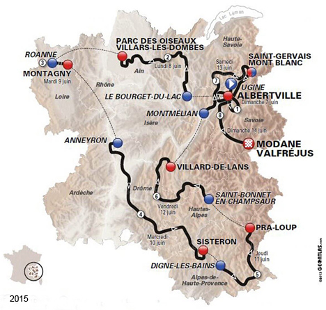1 Ugine-Albertville, 131.5 km 1. Peter Kennaugh (Gbr) en 3h06'51" 2. Sacha Modolo (Ita) à 2" 3. Edvald Boasson Hagen (Nor) 4. Tiesj Benoot (Bel) 5. Simon Gerrans (Aus) 6. Nacer Bouhanni (Fra) 7. Jay McCarthy (Aus) 8. Alejandro Valverde (Esp) 9. Samuel Dumoulin (Fra) 10. Cyril Gautier (Fra) * Peter Kennaugh 2 Le Bourget du Lac-Villars les Dombes/Parc des Oiseaux, 173 km 1. Nacer Bouhanni (Fra) en 4h23'46" 2. Samuel Dumoulin (Fra) 3. Sacha Modolo (Ita) 4. Edvald Boasson Hagen (Nor) 5. Alexey Tsatevich (Rus) 6. Jonas Vangenechten (Bel) 7. Jens Keukeleire (Bel) 8. Ramunas Navardauskas (Lit) 9. Yannick Martinez (Fra) 10. Luka Mezgec (Slo) * Peter Kennaugh 3 Roanne-Montagny, 24.5 km CLM par équipes 1. BMC RACING TEAM en 29'54" 2. ASTANA PRO TEAM à 4" 3. MOVISTAR TEAM à 5" 4. ETIXX-QUICK STEP à 18" 5. ORICA GREENEDGE à 23" 6. TEAM SKY à 35" 7. TEAM CANNONDALE-GARMIN à 43" 8. LAMPRE-MERIDA à 47" 9. IAM CYCLING à 50" 10. TEAM LOTTO NL-JUMBO à 54" * Rohan Dennis 4 Anneyron-Sisteron, 228 km 1. Nacer Bouhanni (Fra) en 5h30'53" 2. Jonas Vangenechten (Bel) 3. Luka Mezgec (Slo) 4. Edvald Boasson Hagen (Nor) 5. Alexey Tsatevich (Rus) 6. Julian Alaphilippe (Fra) 7. Samuel Dumoulin (Fra) 8. Tiesj Benoot (Bel) 9. Kévin Reza (Fra) 10. Nathan Haas (Aus) * Rohan Dennis 5 Digne les Bains-Pra Loup, 161 km 1. Romain Bardet (Fra) en 4h31'22" 2. Tejay Van Garderen (Usa) à 36" 3. Christopher Froome (Gbr) à 40" 4. Beñat Intxausti (Esp) à 42" 5. Simon Yates (Gbr) à 50" 6. Louis Meintjes (Afs) 7. Andrew Talansky (Usa) à 55" 8. Michele Scarponi (Ita) à 57" 9. Pierre Rolland (Fra) 10. Mathias Frank (Sui) * Tejay Van Garderen 6 St Bonnet en Champsaur-Villard de Lans/Côte 2000, 183 km 1. Rui Alberto Costa (Por) en 4h29'23" 2. Vincenzo Nibali (Ita) à 5" 3. Alejandro Valverde (Esp) à 38" 4. Tony Gallopin (Fra) à 39" 5. Simon Yates (Gbr) à 1'24" 6. Daniel Martin (Irl) à 1'46" 7. John Gadret (Fra) à 1'48" 8. Tiesj Benoot (Bel) à 1'59" 9. Christopher Froome (Gbr) à 2'12" 10. Beñat Intxausti (Esp) * Vincenzo Nibali 7 Montmélian-St Gervais Mont Blanc, 155 km 1. Christopher Froome (Gbr) en 4h24'17" 2. Tejay Van Garderen (Usa) à 17" 3. Louis Meintjes (Afs) à 41" 4. Beñat Intxausti (Esp) 5. Joaquin Rodriguez (Esp) à 54" 6. Romain Bardet (Fra) à 1'08" 7. Alexis Vuillermoz (Fra) à 1'15" 8. Andrew Talansky (Usa) à 1'25" 9. Rui Alberto Costa (Por) à 1'34" 10. Daniel Navarro (Esp) à 1'45" * Tejay Van Garderen 8 St Gervais Mont Blanc-Modane/Valfréjus, 156.5 km 1. Christopher Froome (Gbr) en 3h59'27" 2. Simon Yates (Gbr) à 18" 3. Rui Alberto Costa (Por) 4. Tejay Van Garderen (Usa) 5. Joaquin Rodriguez (Esp) à 28" 6. Romain Bardet (Fra) 7. Daniel Martin (Irl) à 31" 8. Wouter Poels (Hol) à 44" 9. Pierre Rolland (Fra) 10. Beñat Intxausti (Esp) Classement général : 2. Tejay Van Garderen (Usa) à 10" 3. Rui Alberto Costa (Por) à 1'16" 4. Beñat Intxausti (Esp) à 1'21" 5. Simon Yates (Gbr) à 1'33" 6. Romain Bardet (Fra) à 2'05" 7. Daniel Martin (Irl) à 2'52" 8. Joaquin Rodriguez (Esp) à 3'06" 9. Alejandro Valverde (Esp) à 3'12" 10. Andrew Talansky (Usa) à 4'17" 11. Rafael Valls (Esp) à 4'20" 12. Vincenzo Nibali (Ita) à 4'32" 13. David De La Cruz (Esp) à 5'24" 14. Robert Kiserlovski (Cro) à 6'43" 15. Bart De Clercq (Bel) à 9'51" 16. Daniel Navarro (Esp) à 10'32" 17. Jonathan Castroviejo (Esp) à 11'22" 18. Ruben Plaza (Esp) à 20'14" 19. Gorka Izagirre (Esp) à 20'49" 20. Adam Yates (Gbr) à 25'30" 21. Chris Anker Sørensen (Dan) à 27'24" 22. Wilco Kelderman (Hol) à 28'40" 23. Paul Voss (All) à 29'44" 24. John Gadret (Fra) à 31'08" 25. Pierre Rolland (Fra) à 38'23" 26. Tiesj Benoot (Bel) à 38'54" 27. Michele Scarponi (Ita) à 39'13" 28. Pawel Poljanski (Pol) à 40'57" 29. Alexis Vuillermoz (Fra) à 41'18" 30. Tony Gallopin (Fra) à 41'20" 31. Jean-Christophe Péraud (Fra) à 41'21" 32. Emanuel Buchmann (All) à 44'06" 33. Christian Meier (Can) à 44'10" 34. Rohan Dennis (Aus) à 45'46" 35. José Rodolfo Serpa (Col) à 46'15" 36. Bruno Manuel Pires (Por) à 49'01" 37. Nicolas Roche (Irl) à 50'09" 38. Marcel Wyss (Sui) à 50'13" 39. Wouter Poels (Hol) à 50'27" 40. Rein Taaramäe (Est) à 50'37" 41. Tiago José Machado (Por) à 50'42" 42. Haimar Zubeldia (Esp) à 50'43" 43. Philip Deignan (Irl) à 52'35" 44. Arnaud Courteille (Fra) à 52'47" 45. Mikaël Chérel (Fra) à 52'56" 46. George Bennett (Nzl) à 54'59" 47. Stephen Cummings (Gbr) à 55'04" 48. Lieuwe Westra (Hol) à 55'13" 49. Samuel Sanchez (Esp) à 56'03" 50. Ben Gastauer (Lux) à 56'23" 51. José João Mendes (Por) à 56'59" 52. Louis Meintjes (Afs) à 59'16" 53. Stef Clement (Hol) à 59'23" 54. Luis Angel Mate (Esp) à 1h00'48" 55. Simon Gerrans (Aus) à 1h01'50" 56. Cristiano Salerno (Ita) à 1h03'00" 57. Peter Kennaugh (Gbr) à 1h03'01" 58. Riccardo Zoidl (Aut) à 1h03'36" 59. Andriy Grivko (Ukr) à 1h04'20" 60. Bauke Mollema (Hol) à 1h04'52" 61. Edward Alexander Beltran (Col) à 1h05'34" 62. Serge Pauwels (Bel) à 1h07'52" 63. Romain Sicard (Fra) à 1h08'30" 64. Dylan Teuns (Bel) à 1h10'30" 65. Giampaolo Caruso (Ita) à 1h11'28" 66. Jay McCarthy (Aus) à 1h11'48" 67. Cyril Gautier (Fra) à 1h12'55" 68. Reto Hollenstein (Sui) à 1h13'03" 69. Lawson Craddock (Usa) à 1h14'26" 70. Alberto Losada (Esp) à 1h14'58" 71. Bartosz Huzarski (Pol) à 1h15'30" 72. Jarlinson Pantano (Col) à 1h15'38" 73. Kenny Elissonde (Fra) à 1h17'23" 74. Jan Barta (Tch) à 1h19'16" 75. Ivan Santaromita (Ita) à 1h20'49" 76. Kristjan Koren (Slo) à 1h22'47" 77. Julien Simon (Fra) à 1h23'32" 78. Evgeny Petrov (Rus) à 1h25'03" 79. Nathan Haas (Aus) à 1h25'10" 80. Johan Vansummeren (Bel) à 1h25'12" 81. Edvald Boasson Hagen (Nor) à 1h25'28" 82. Matthew Busche (Usa) à 1h25'49" 83. Nacer Bouhanni (Fra) à 1h26'06" 84. Bram Tankink (Hol) à 1h26'22" 85. Daniel Teklehaimanot (Ery) à 1h27'19" 86. Michael Schär (Sui) à 1h27'37" 87. Pim Ligthart (Hol) à 1h28'11" 88. Jacques Janse Van Rensburg (Afs) à 1h28'28" 89. Ian Boswell (Usa) à 1h28'3